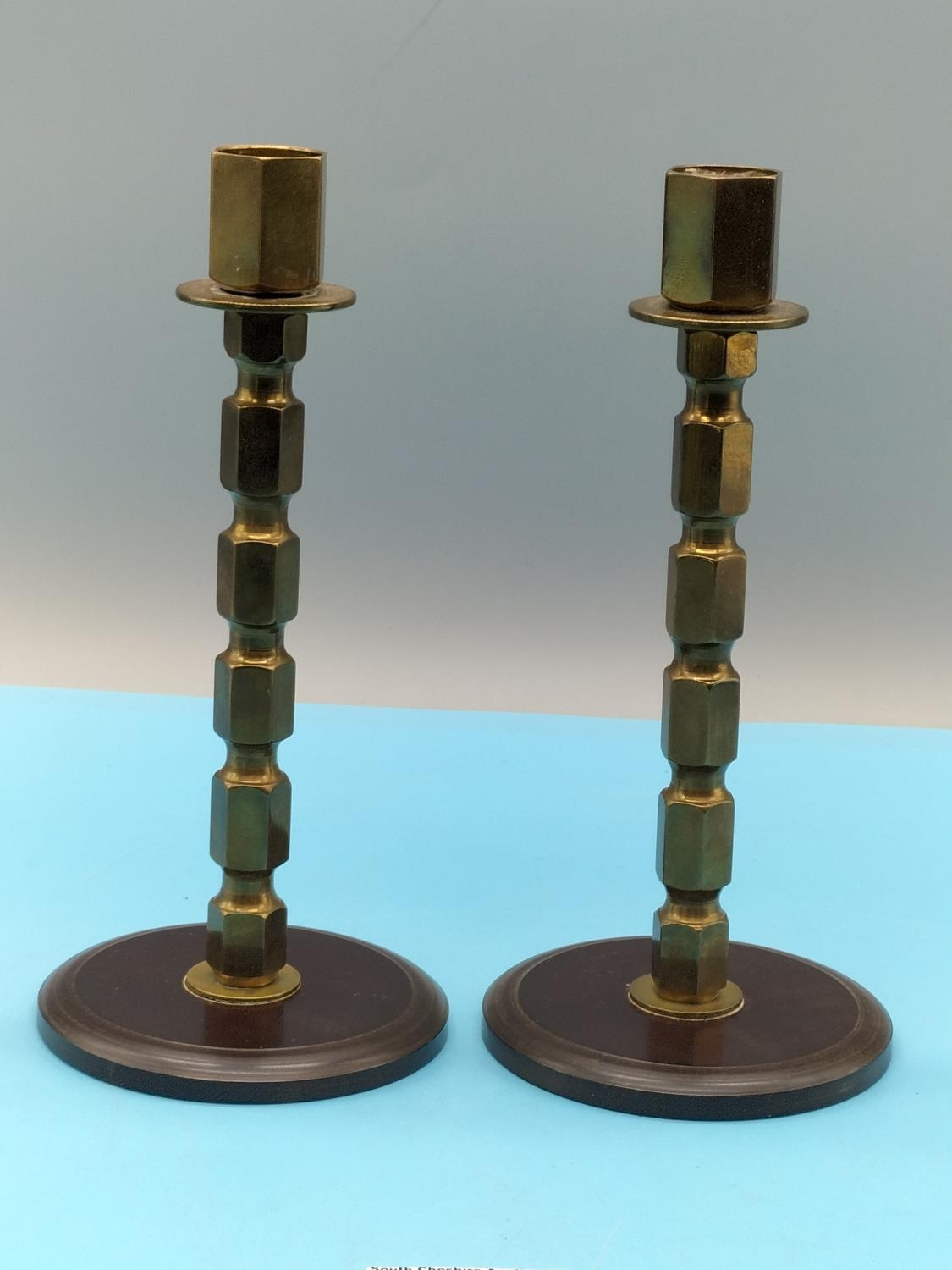 Pair of 20cm Brass Art Deco Candlesticks with Bakelite Bases.