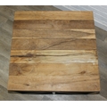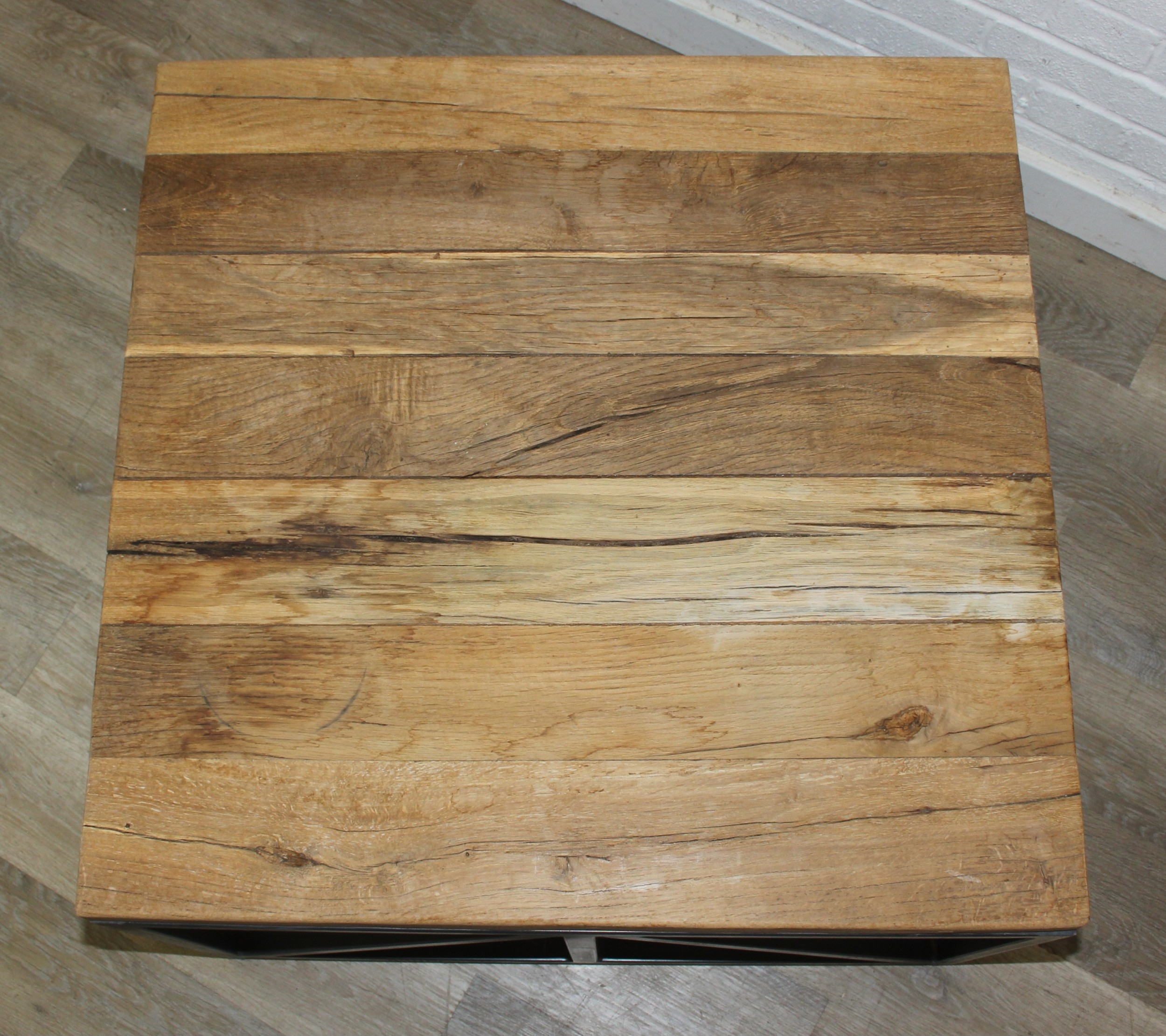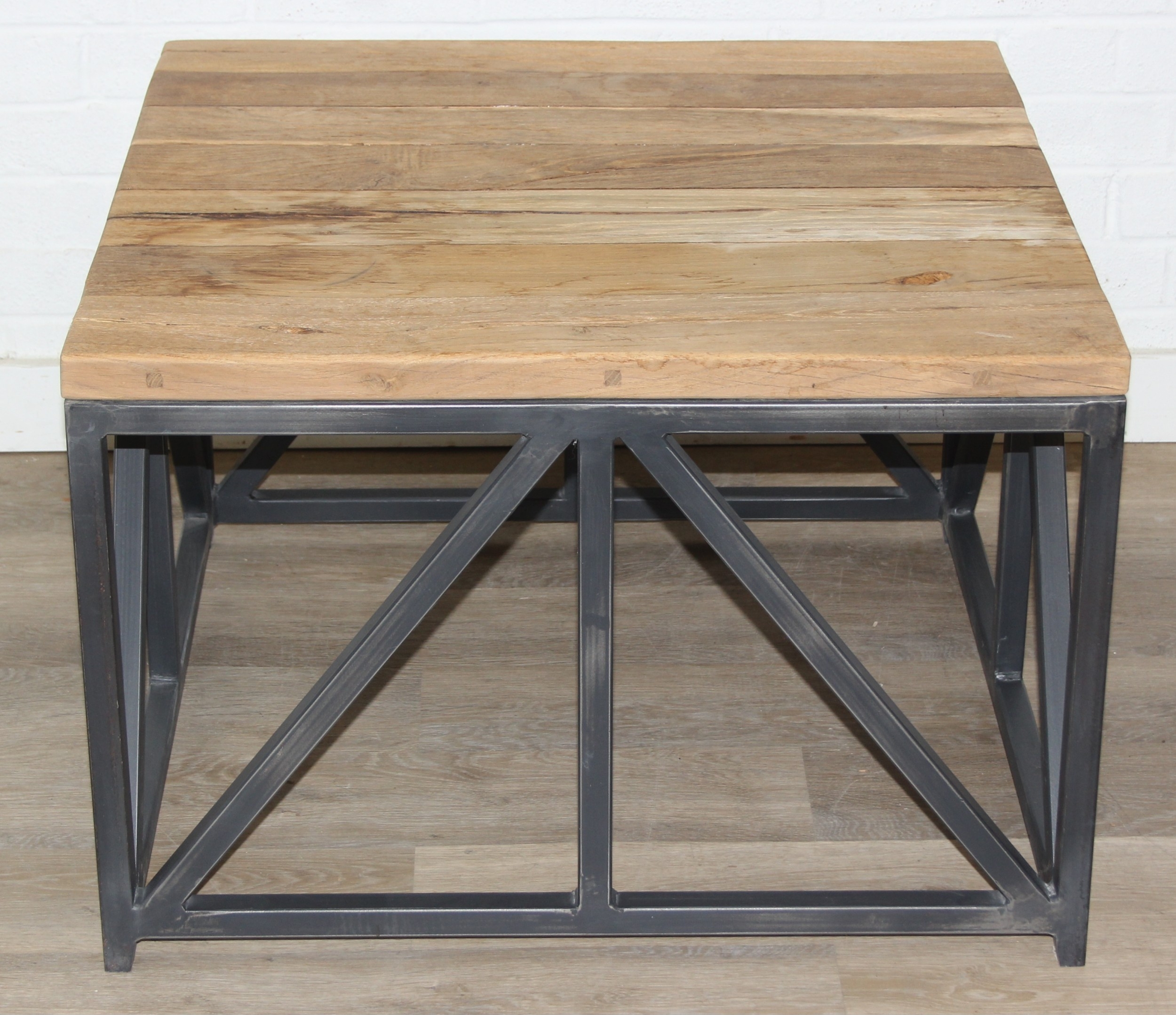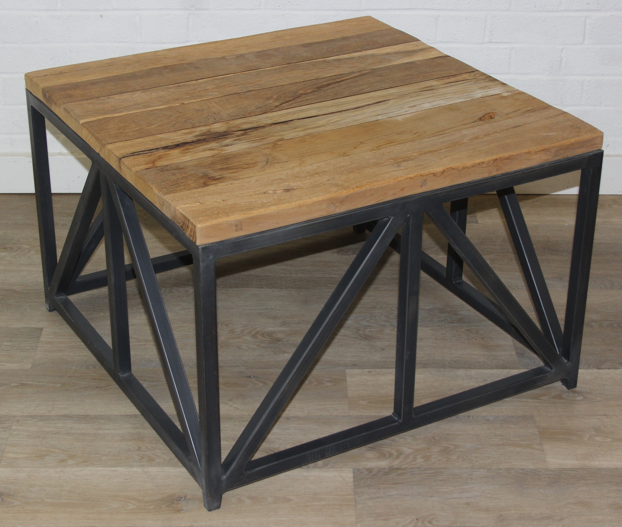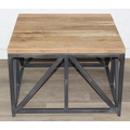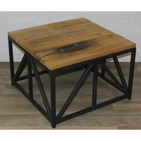 A good quality reclaimed wooden topped side table with wrought metal industrial style bases, 75cm x 75cm x 51cm, one of two in the sale