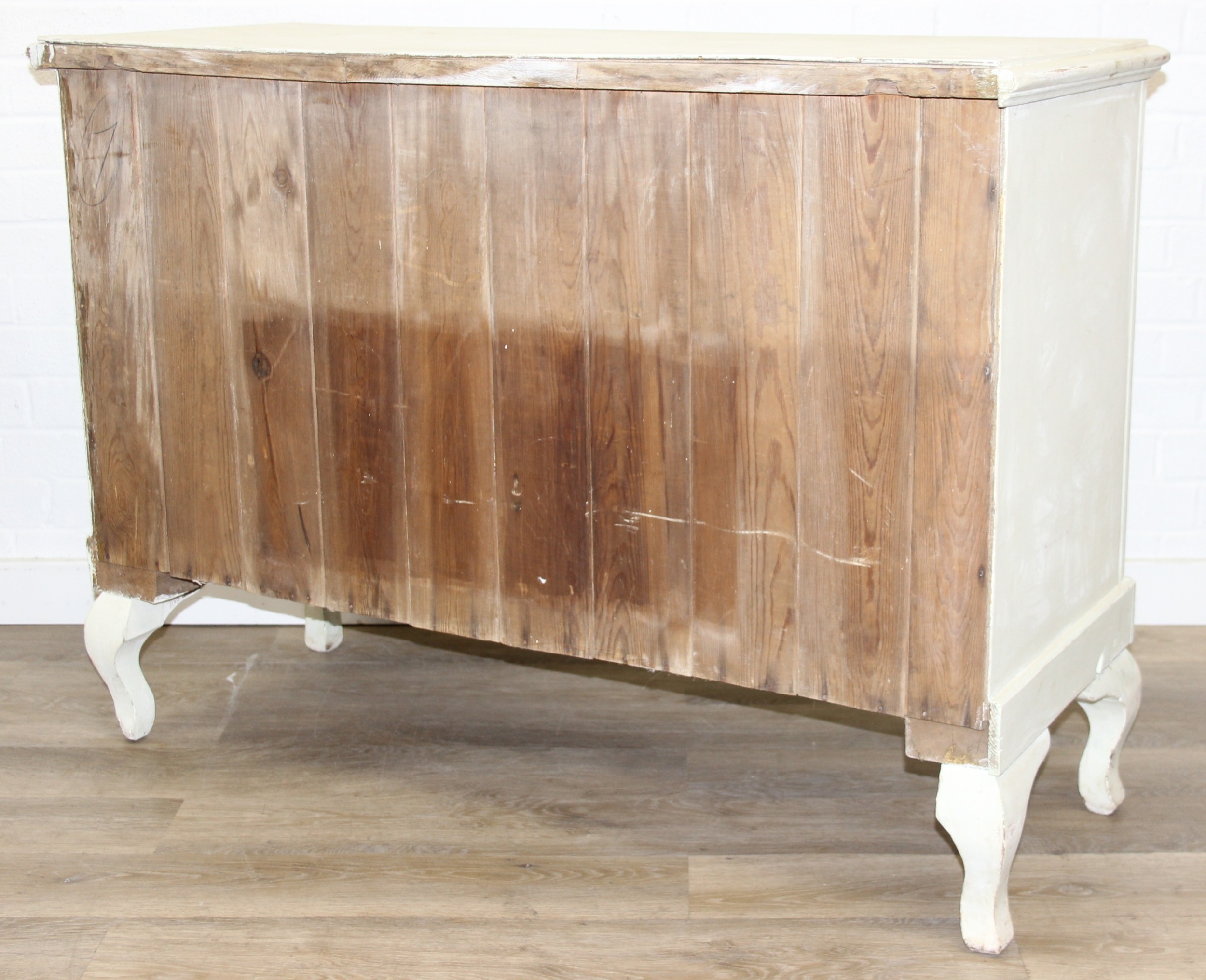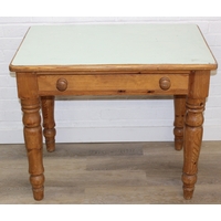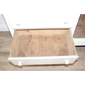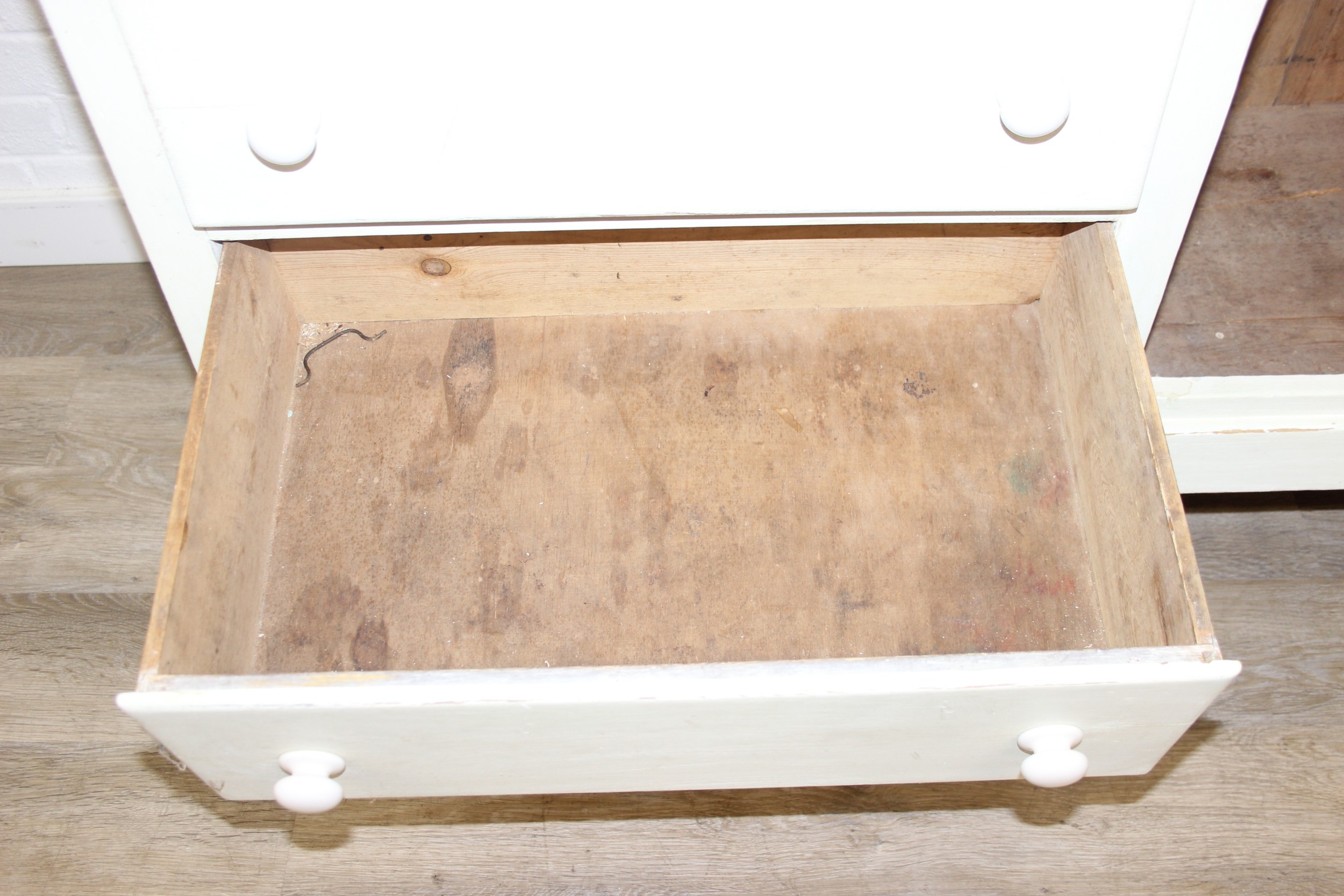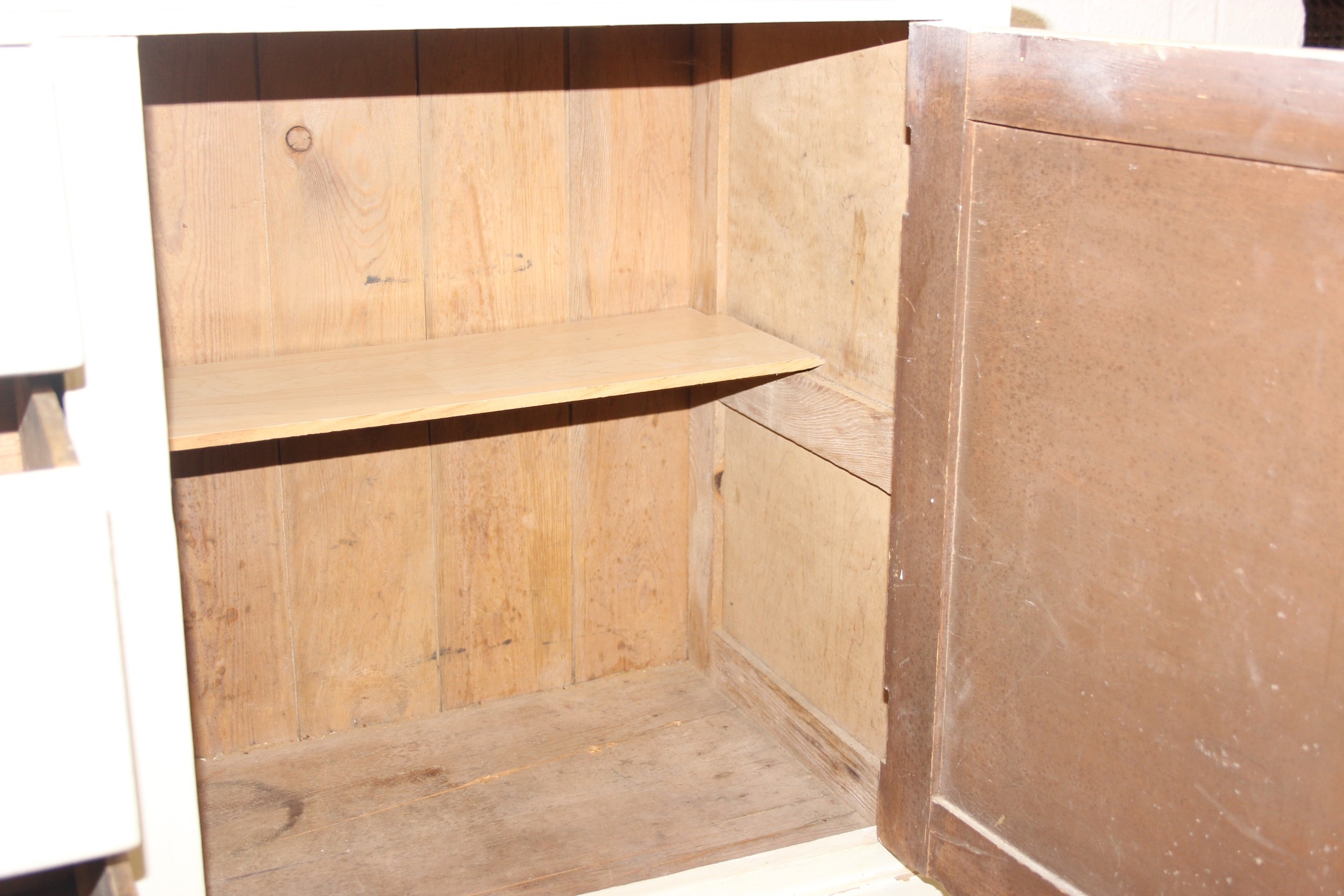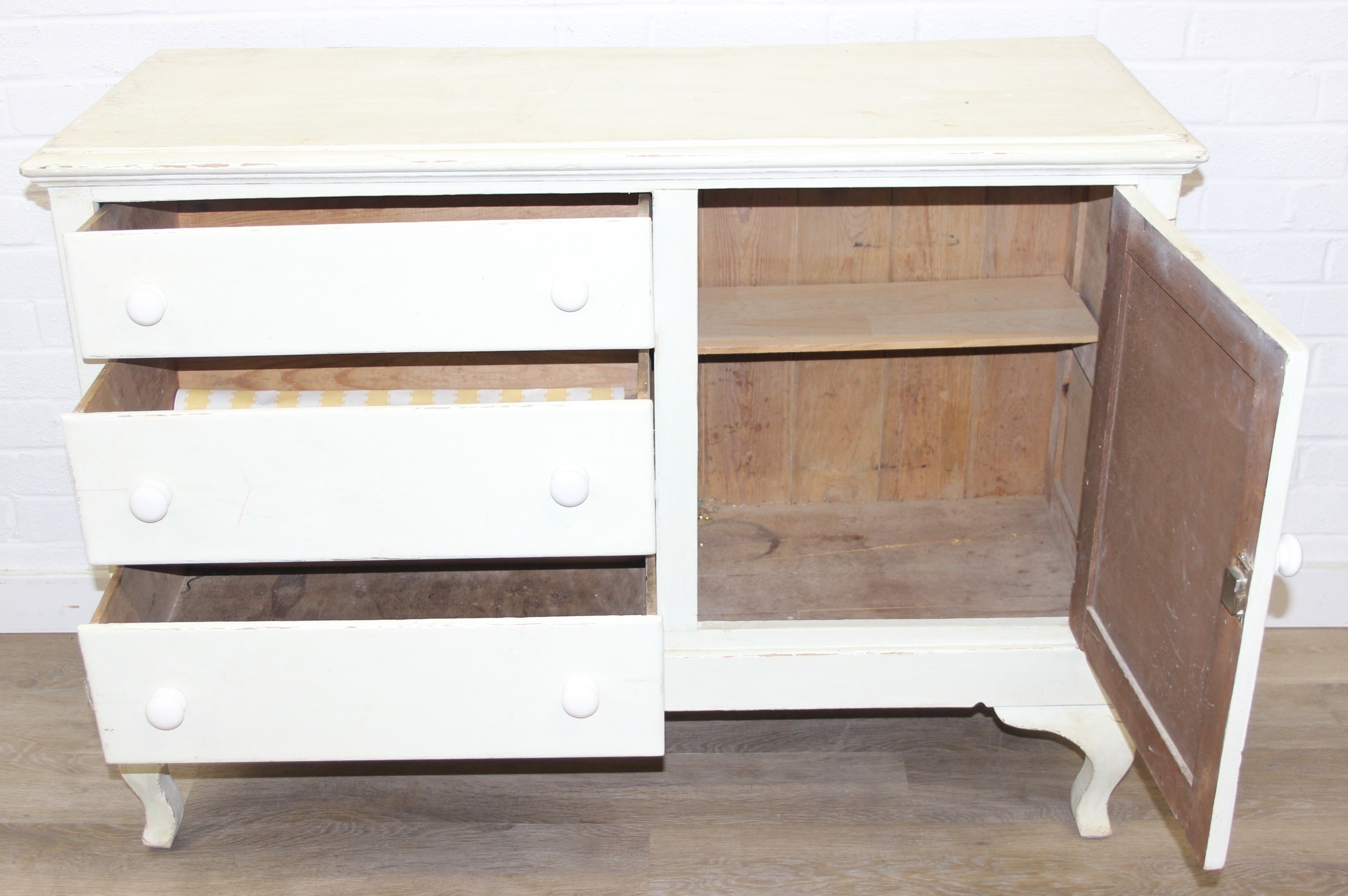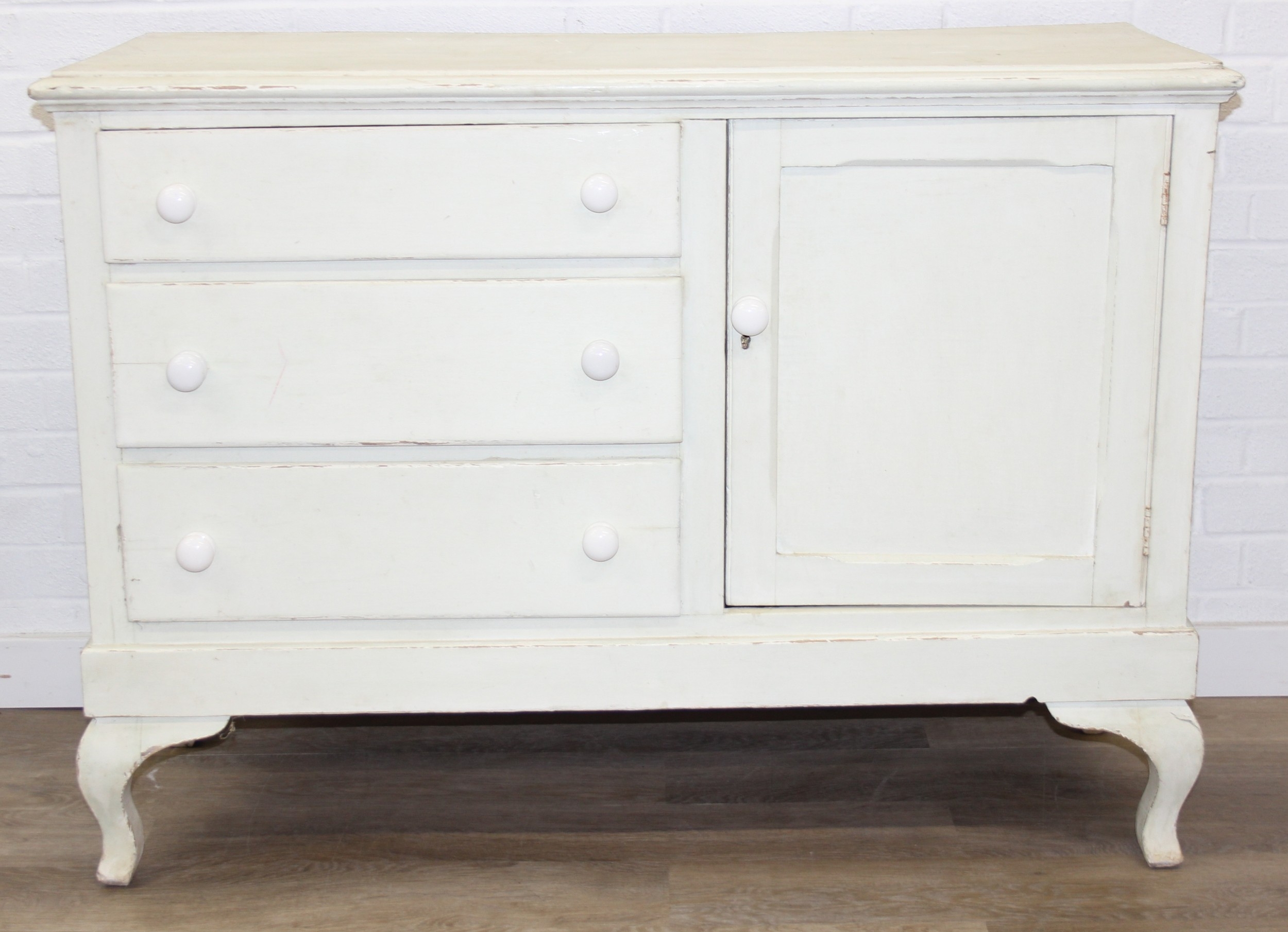 A vintage painted pine sideboard with three drawers and single cupboard, ceramic handles, 120cm x 48cm x 85cm
