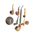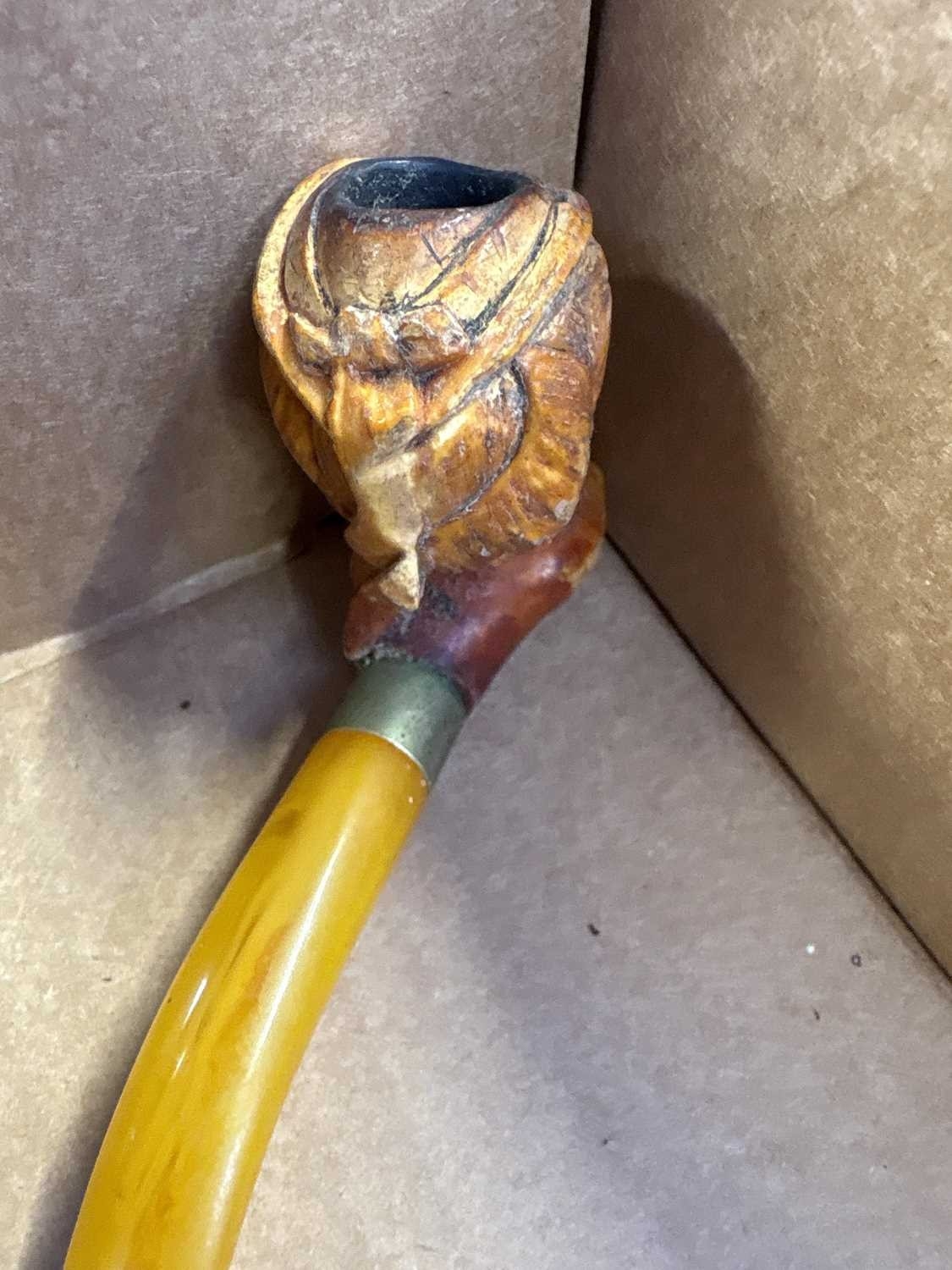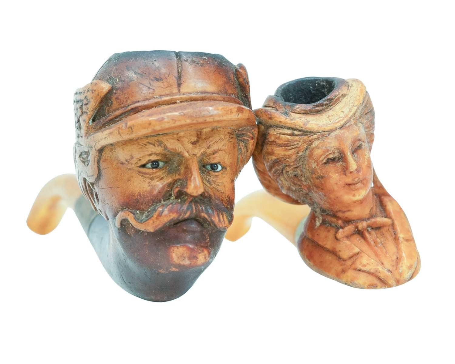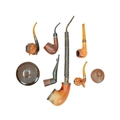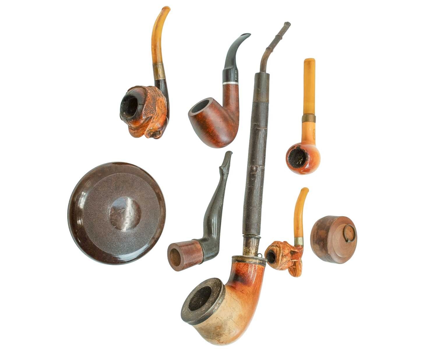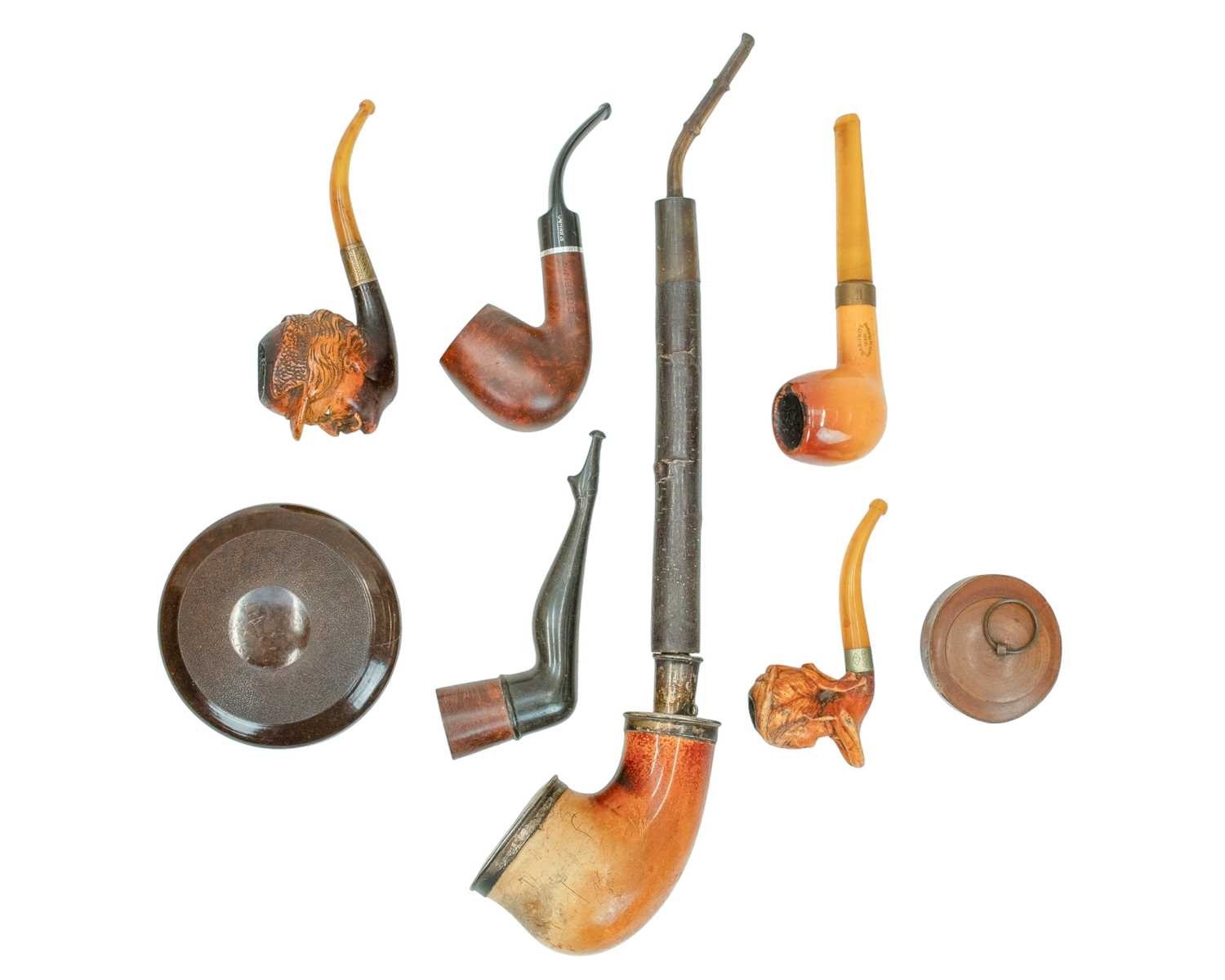 A small collection of pipes. Including two Meerschaum head examples, one with inset eyes, four other pipes, a Bakelite 'Wunup Baccyflap', and a Ropp treen snuff box and cover. This is a nicely patinated collection. The only real damage is to the coifure of the lady's head pipe.
