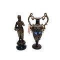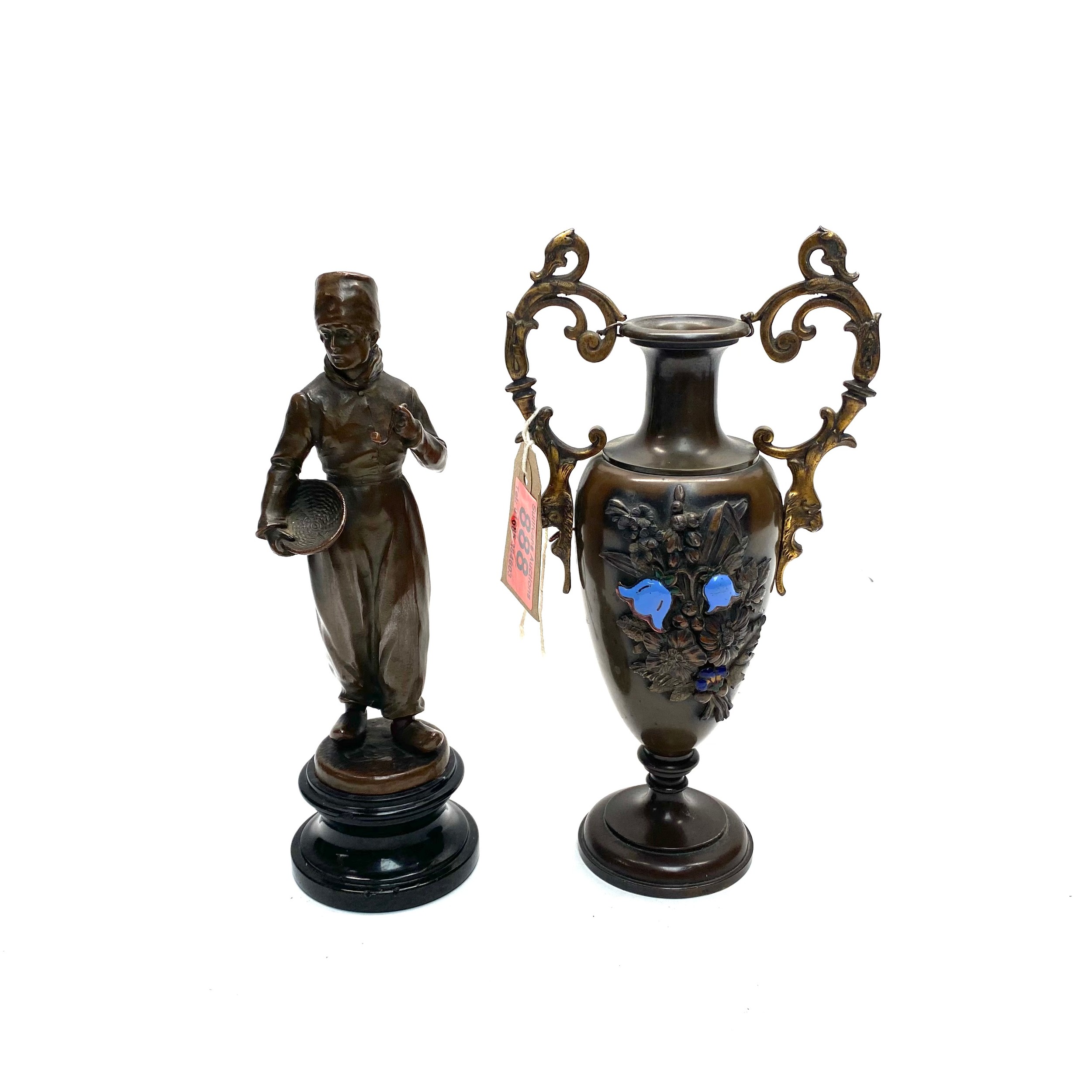 Bronze figure of a dutch boy with pipe and bowl and a bronze bud vase with handles and enamel decoration