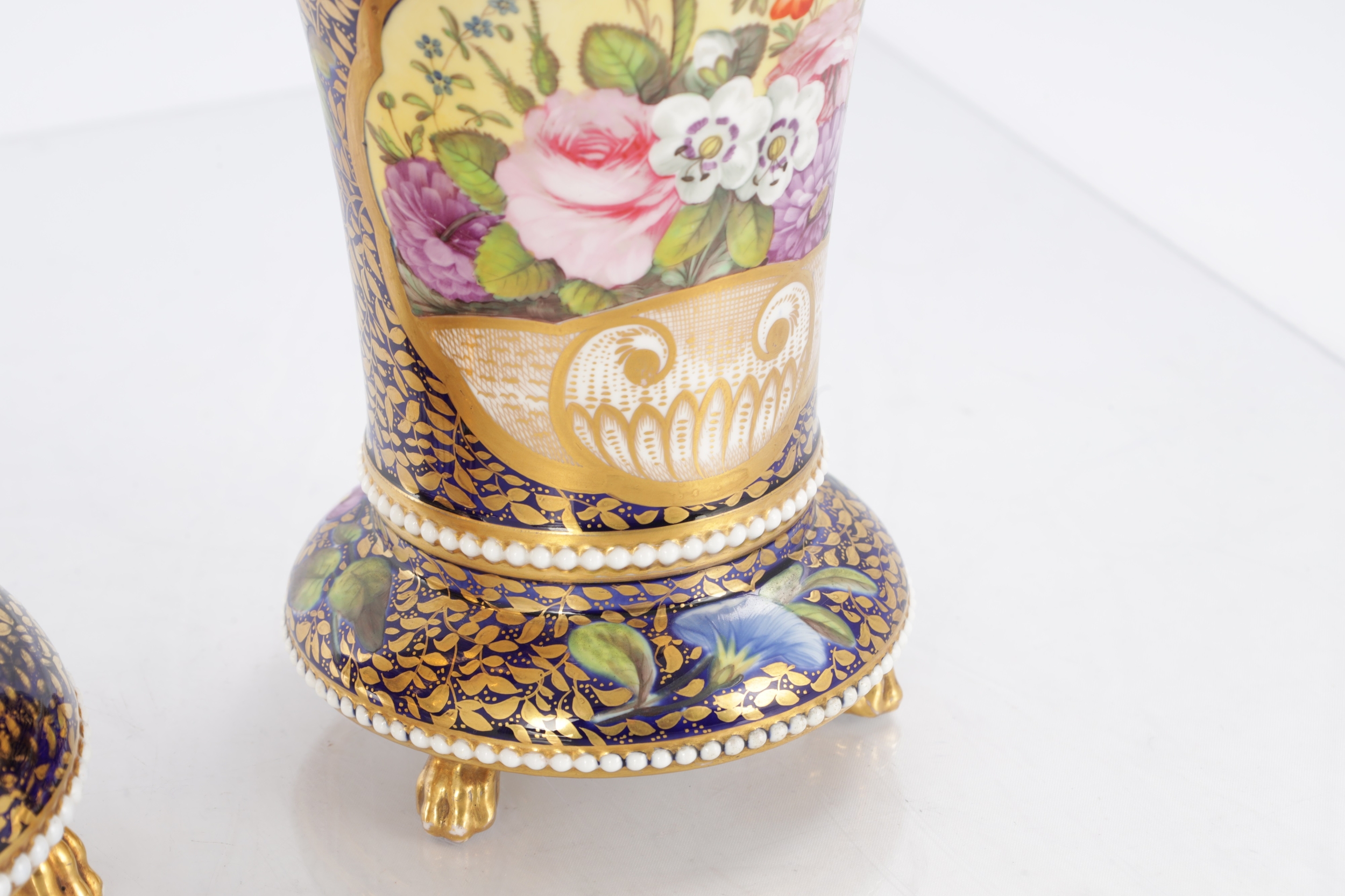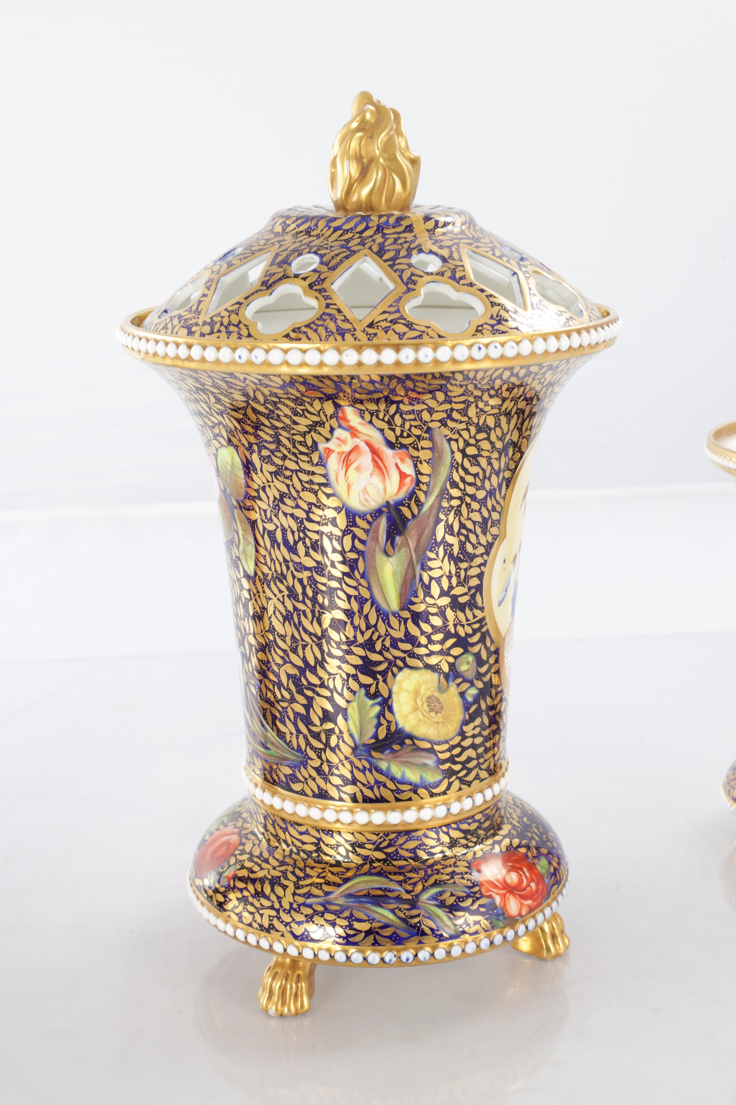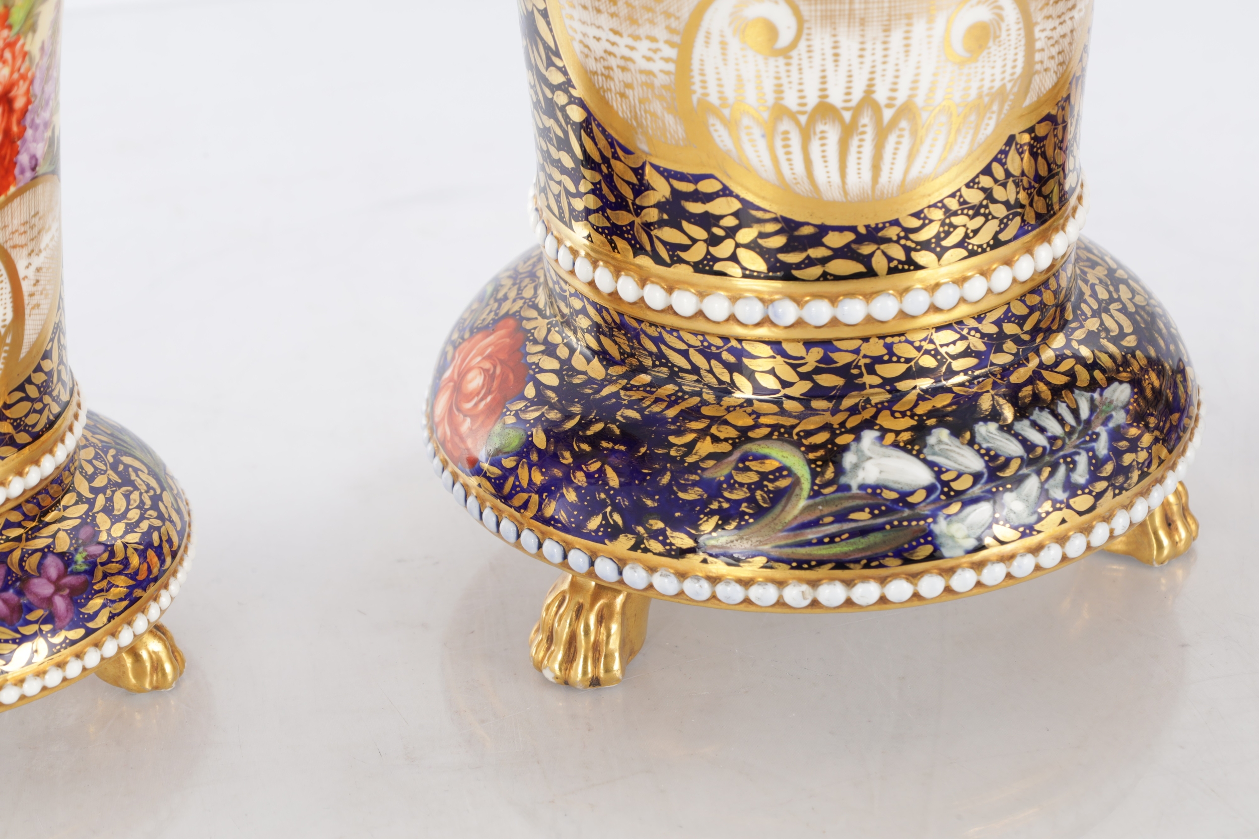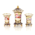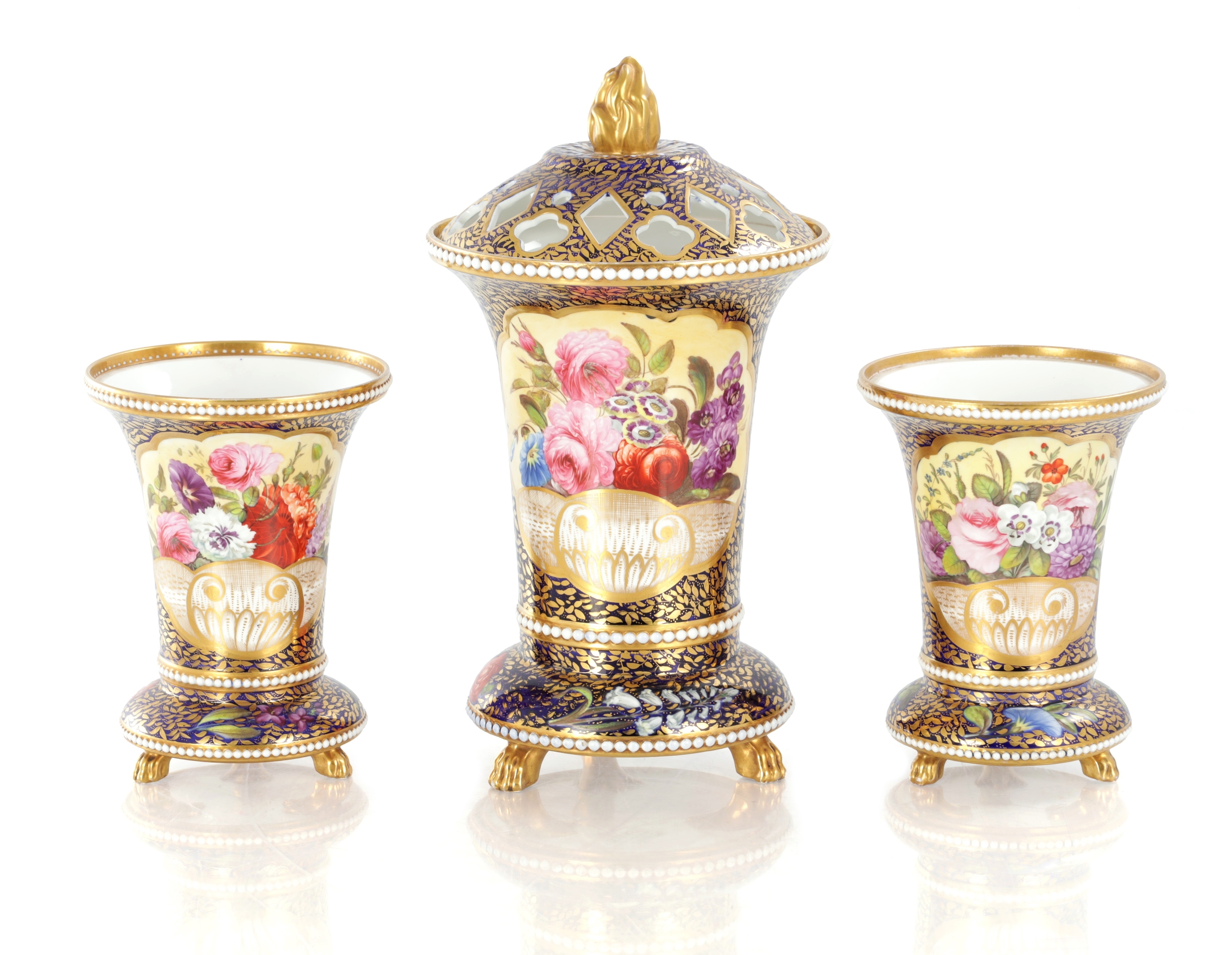 A GOOD EARLY 19TH CENTURY SPODE THREE PIECE GARNITURE SET OF LARGE SIZE the flared royal blue gilt leafwork and bead edge borders finely painted with flower sprays and floral centre panels on circular bases with paw feet; the centre vase with pierced domed cover and flambé finial - written red mark and number 2575 to each. (28cm high and smaller )