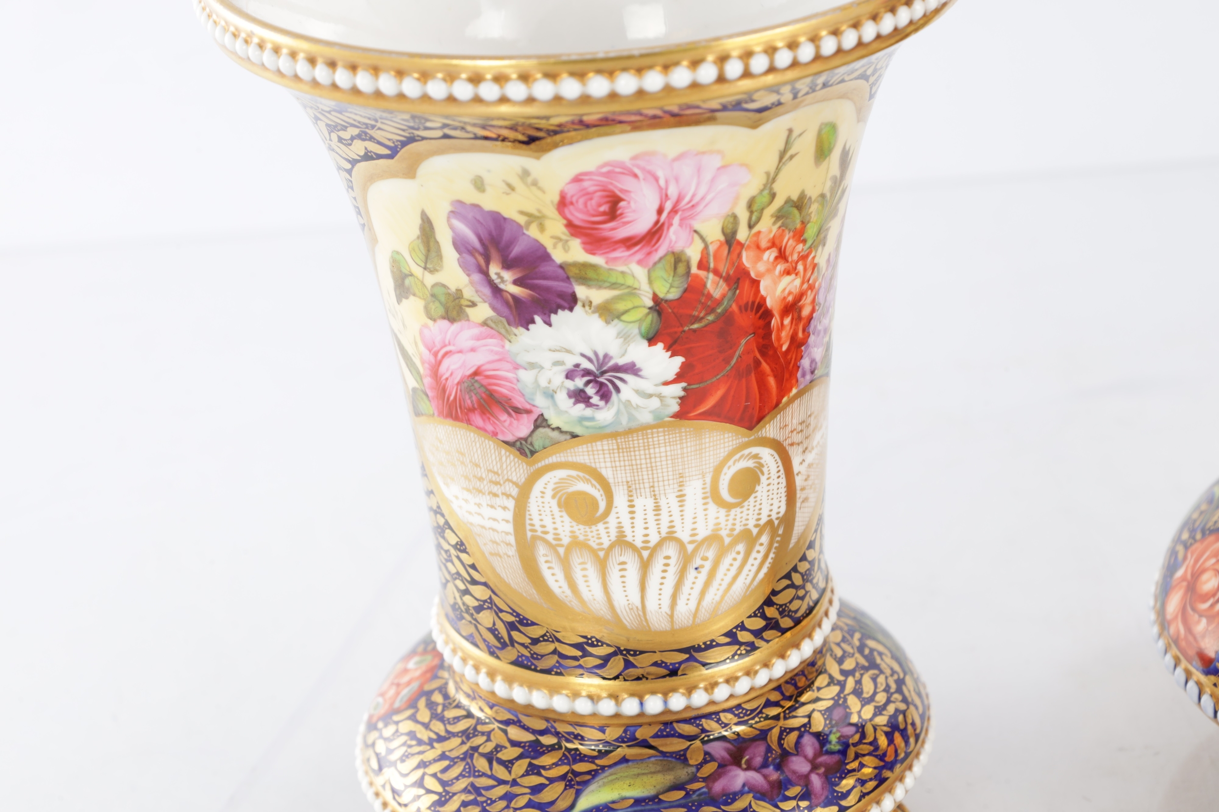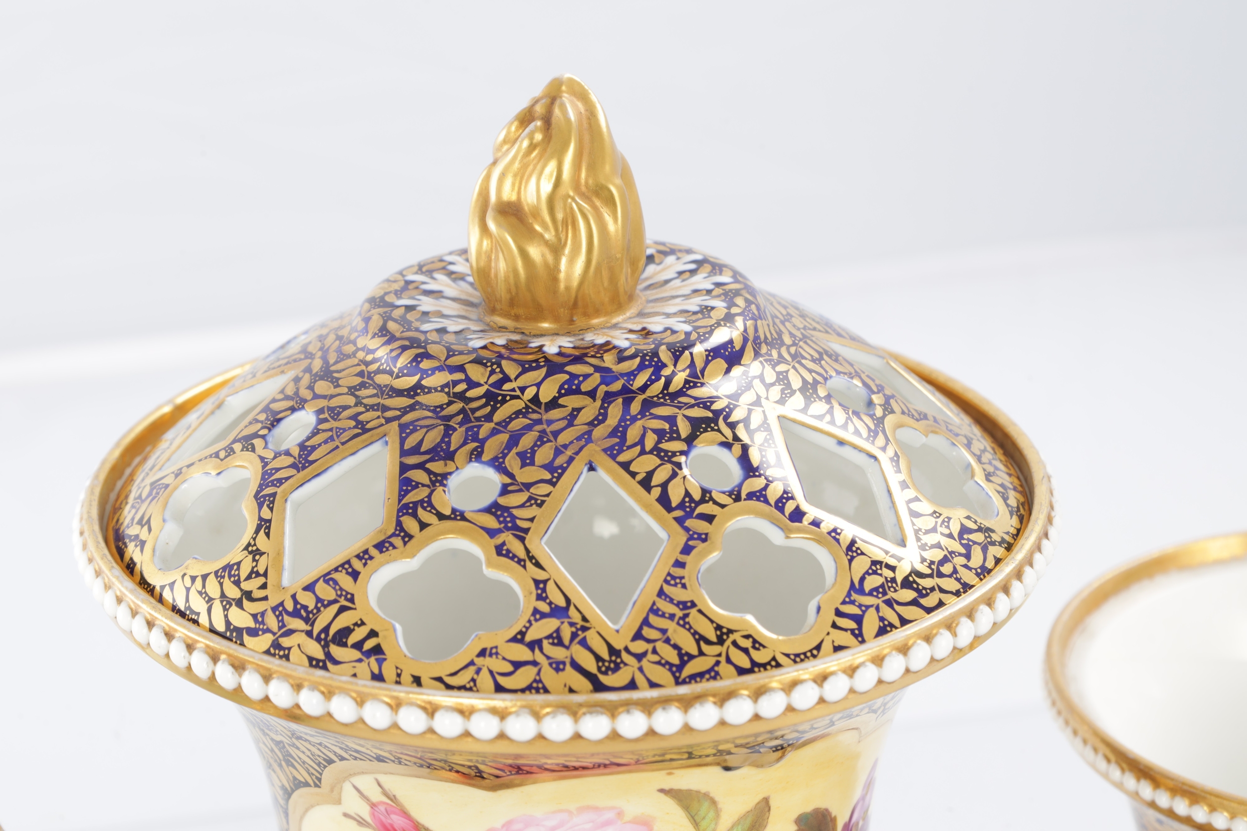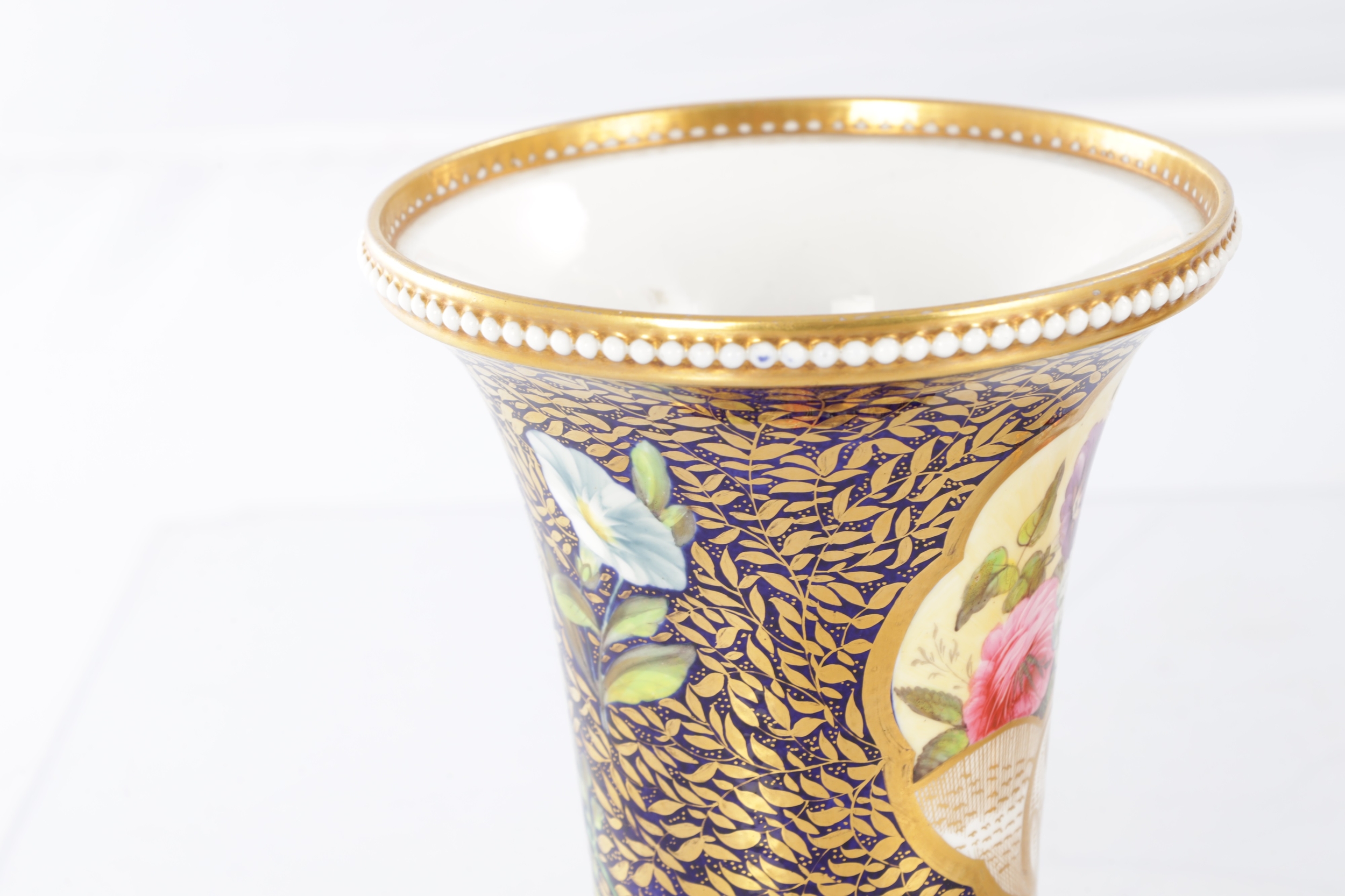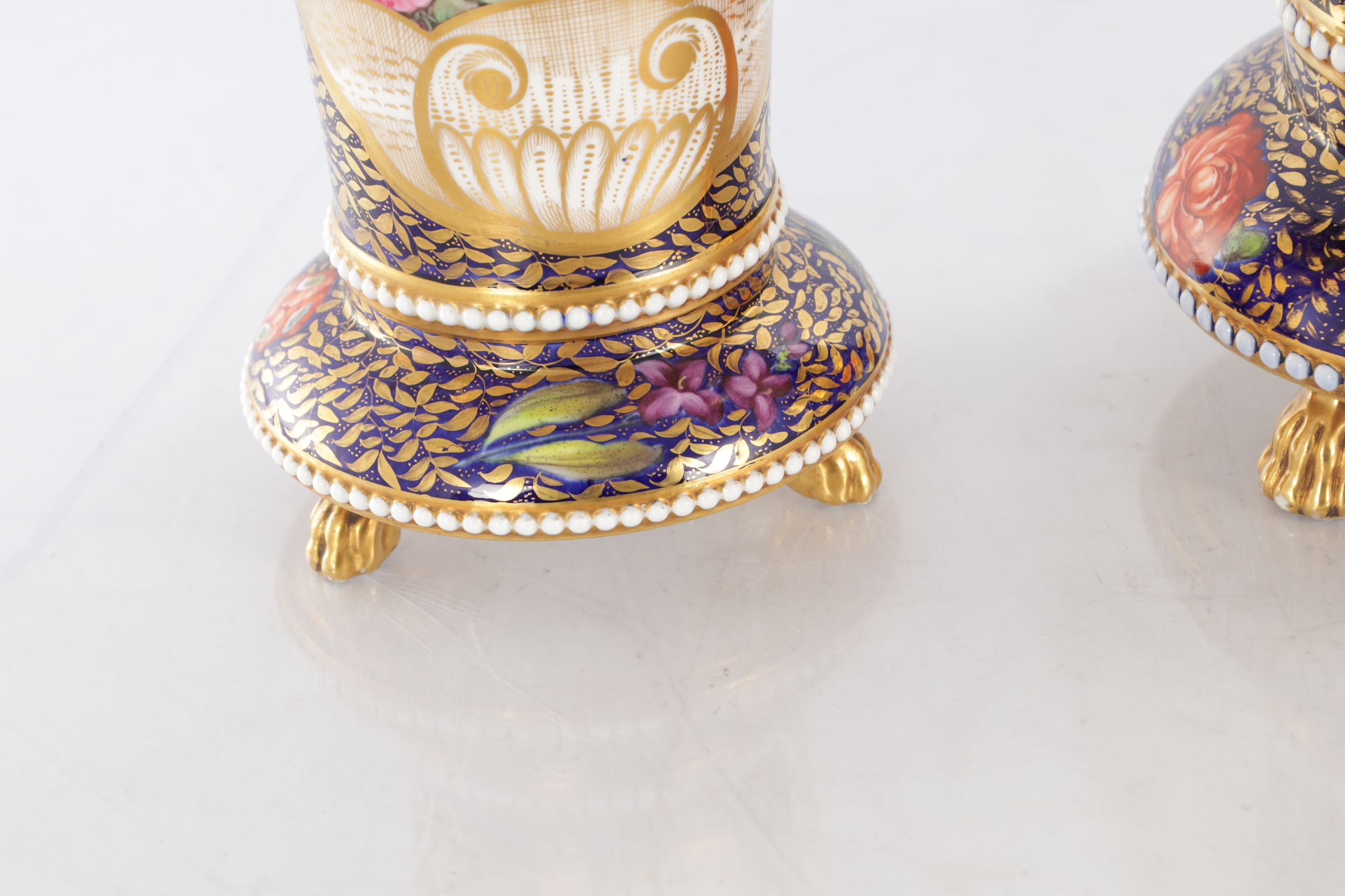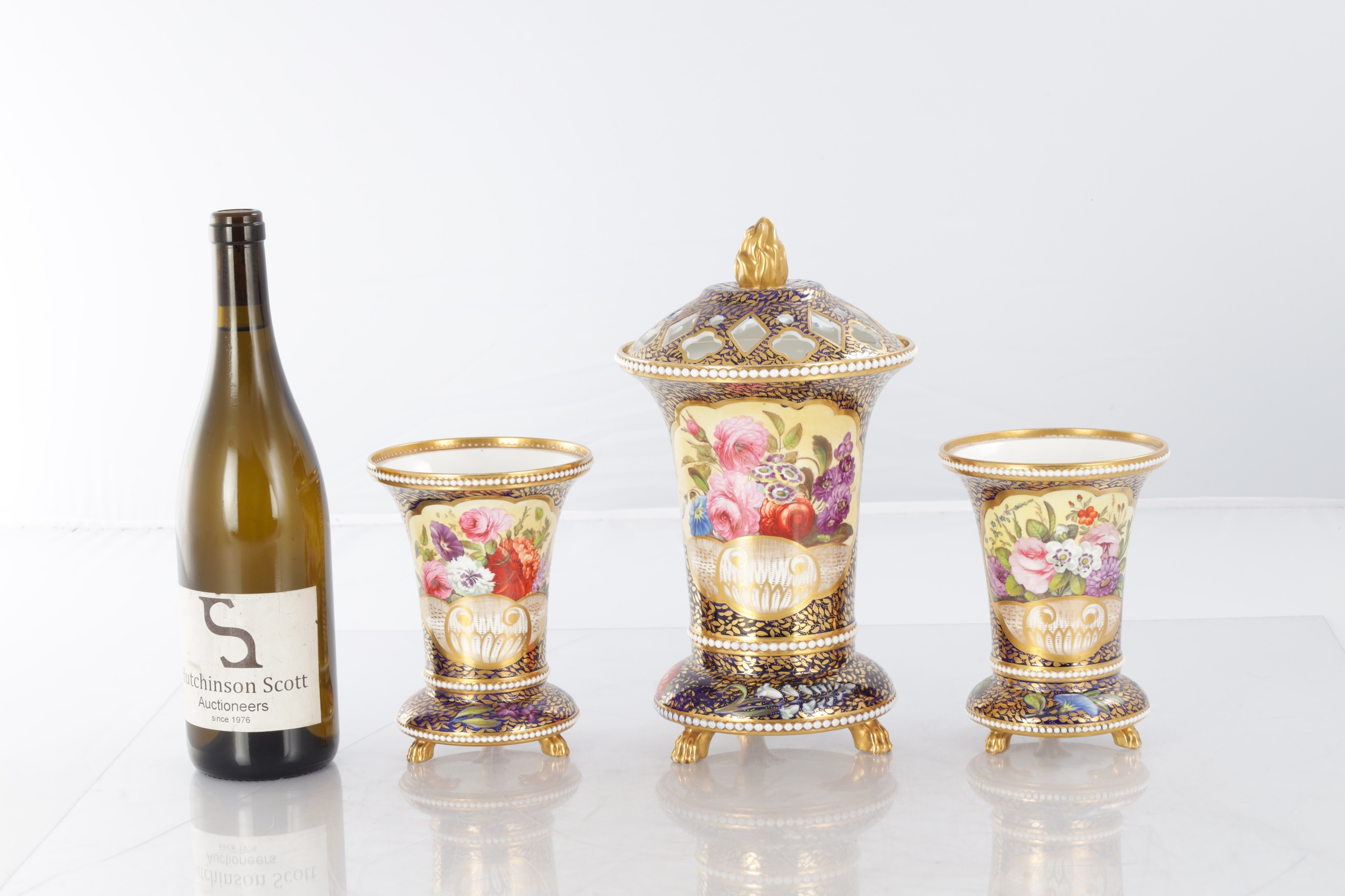 A GOOD EARLY 19TH CENTURY SPODE THREE PIECE GARNITURE SET OF LARGE SIZE the flared royal blue gilt leafwork and bead edge borders finely painted with flower sprays and floral centre panels on circular bases with paw feet; the centre vase with pierced domed cover and flambé finial - written red mark and number 2575 to each. (28cm high and smaller )