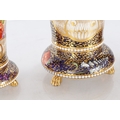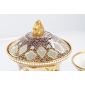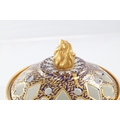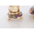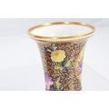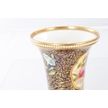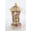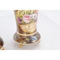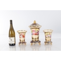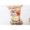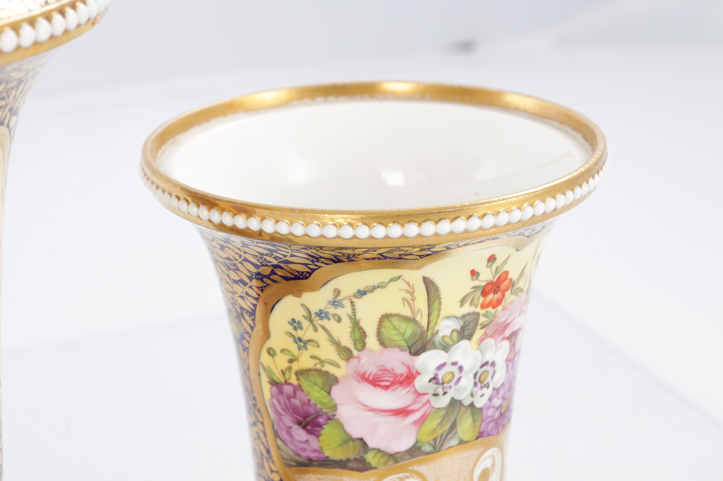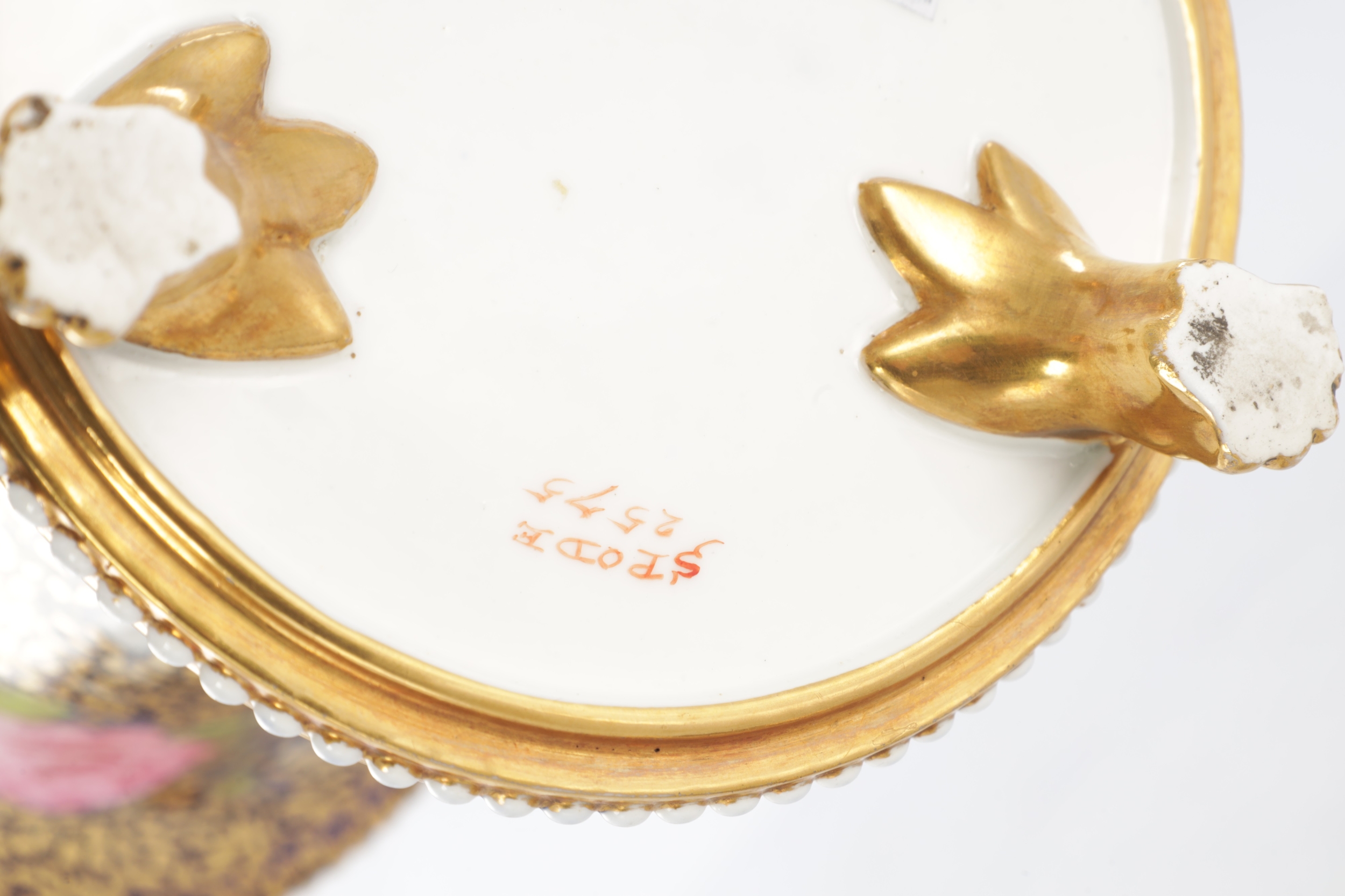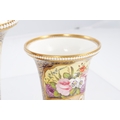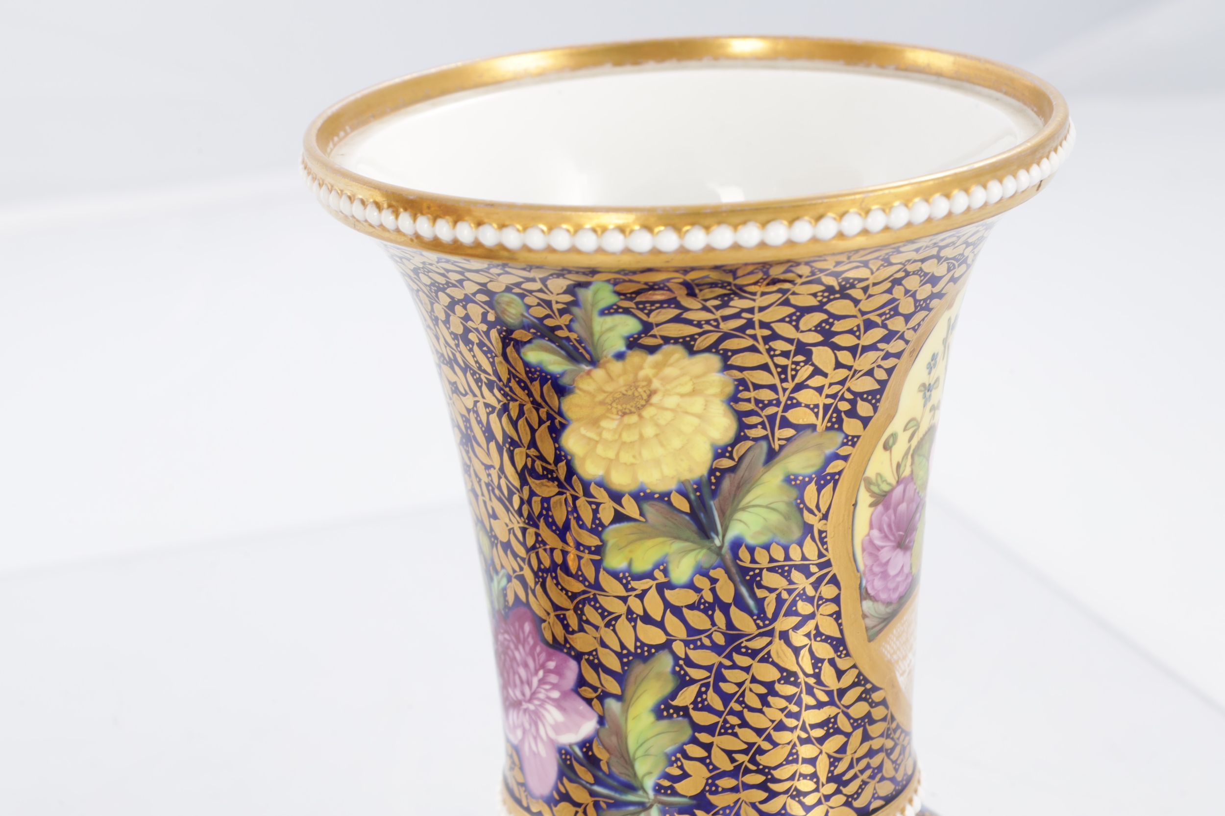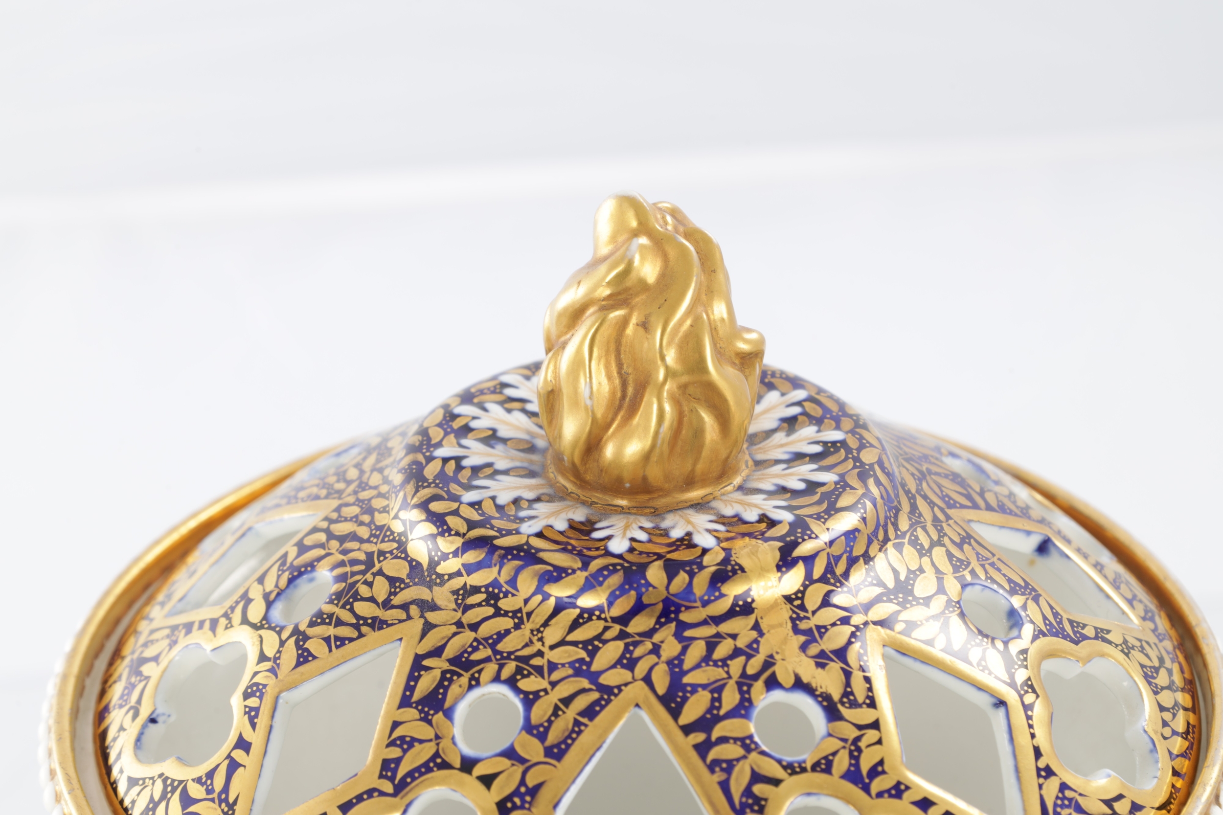 A GOOD EARLY 19TH CENTURY SPODE THREE PIECE GARNITURE SET OF LARGE SIZE the flared royal blue gilt leafwork and bead edge borders finely painted with flower sprays and floral centre panels on circular bases with paw feet; the centre vase with pierced domed cover and flambé finial - written red mark and number 2575 to each. (28cm high and smaller )