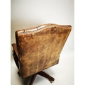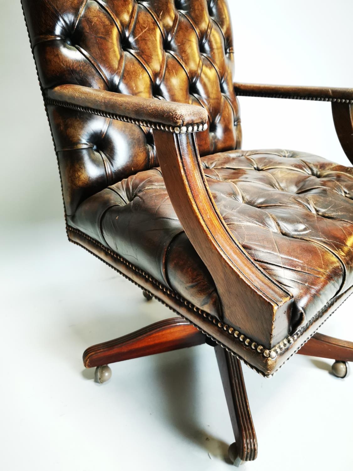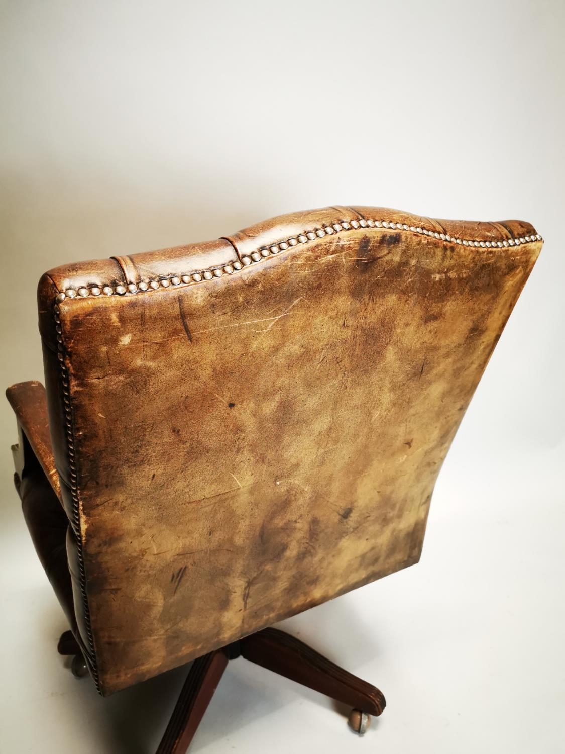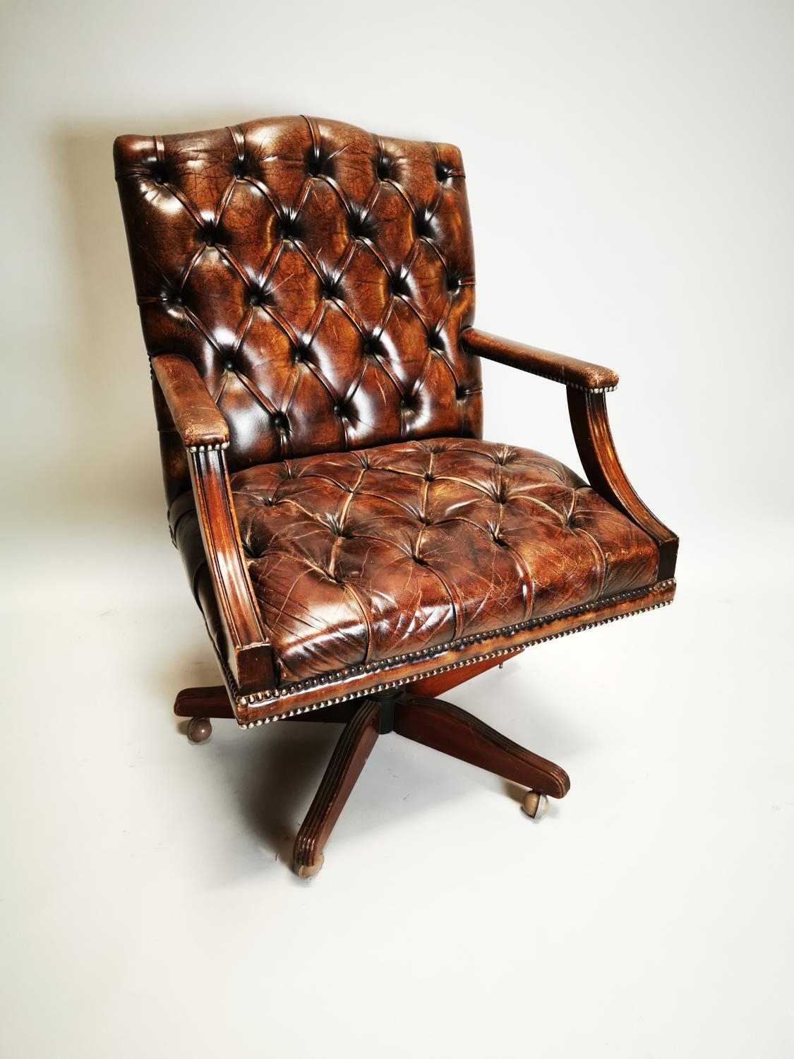 20th. C. deep buttoned leather upholstered and mahogany swivel desk chair. { 103 H cm X 72cm W X 65cm D }.