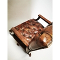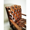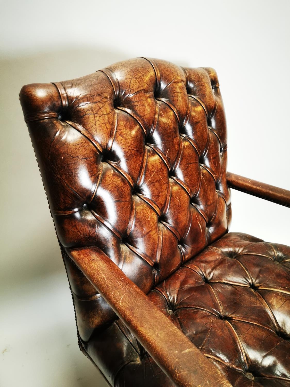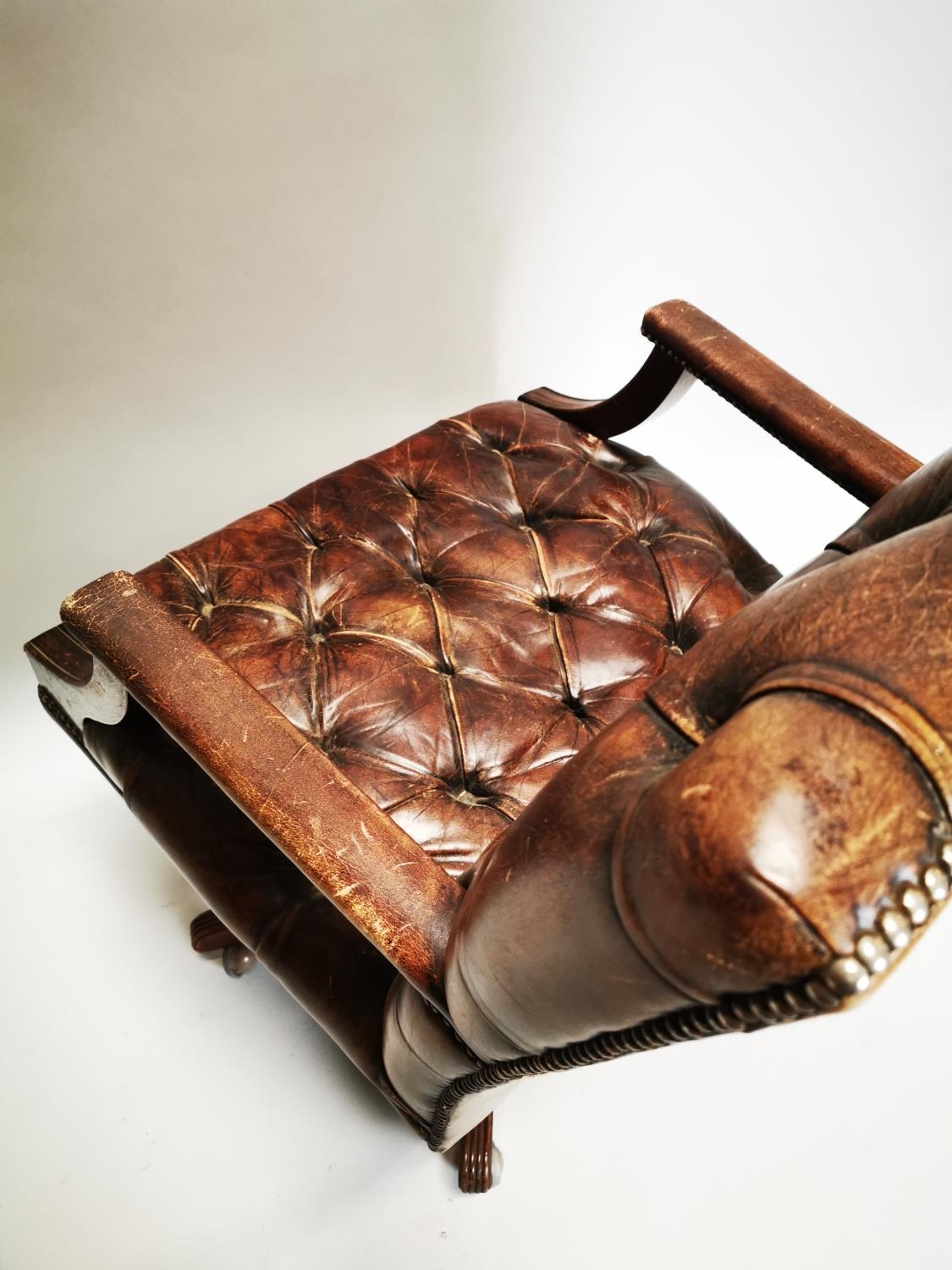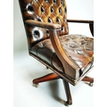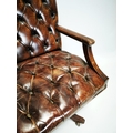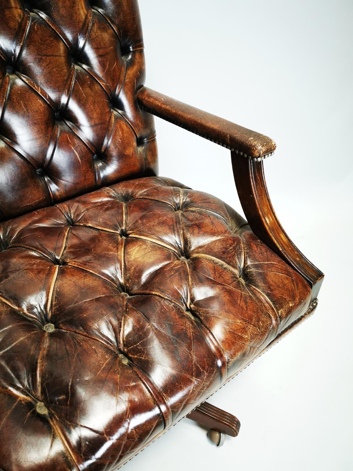 20th. C. deep buttoned leather upholstered and mahogany swivel desk chair. { 103 H cm X 72cm W X 65cm D }.