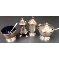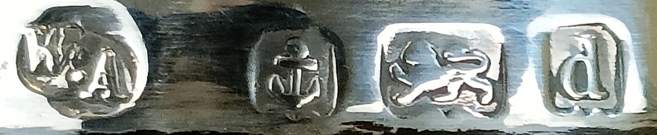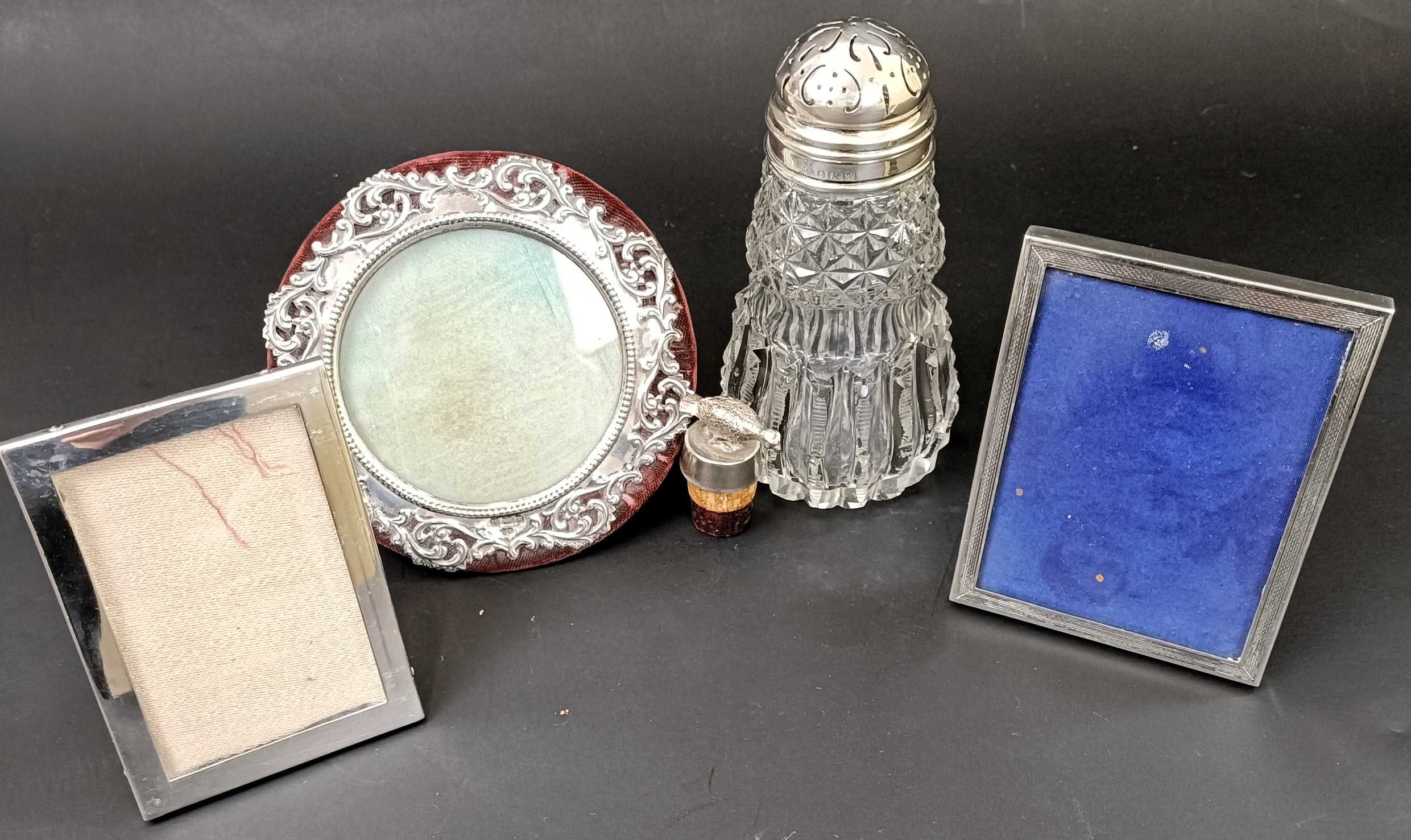 A silver photograph frame, 11 x 9 cm, another, 11 x 8 cm, another, 13 cm diameter, a cut glass sifter, with silver top, and a silver plated bottle stop (5)