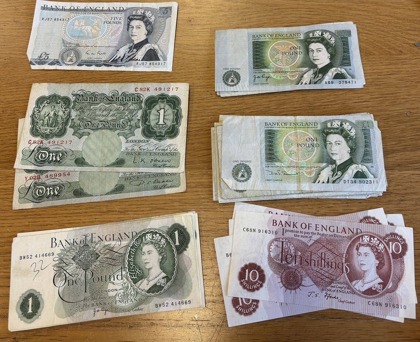 Collection loose in an envelope, generally very fine with some better examples, including Beale £1 Y02B, O'Brien £1 C82K, Fforde 10/- (4), Page £1 1970 (7), 1978 (7), Somerset £1 (18) and Gill £5 RJ57. Qty 39. (R)