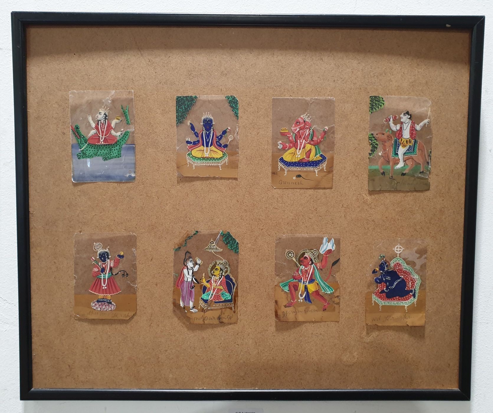 A 19th century set of eight paintings each depicting an Indian God, painted on mica, each 3.5"x2.75". No shipping. Arrange collection or your own packer and shipper please.