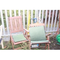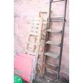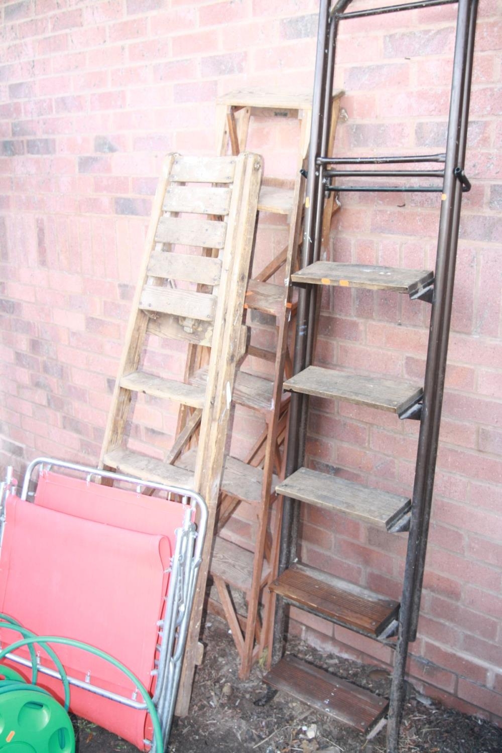 A SET OF METAL TUBULAR FRAMED STEP LADDERS, height 209cm, two sets of wooden step ladders, height 174cm and 164cm, a metal framed folding sun lounger with red fabric, hozelock hose reel and a small quantity of garden tools (10+)