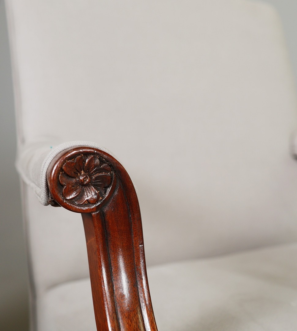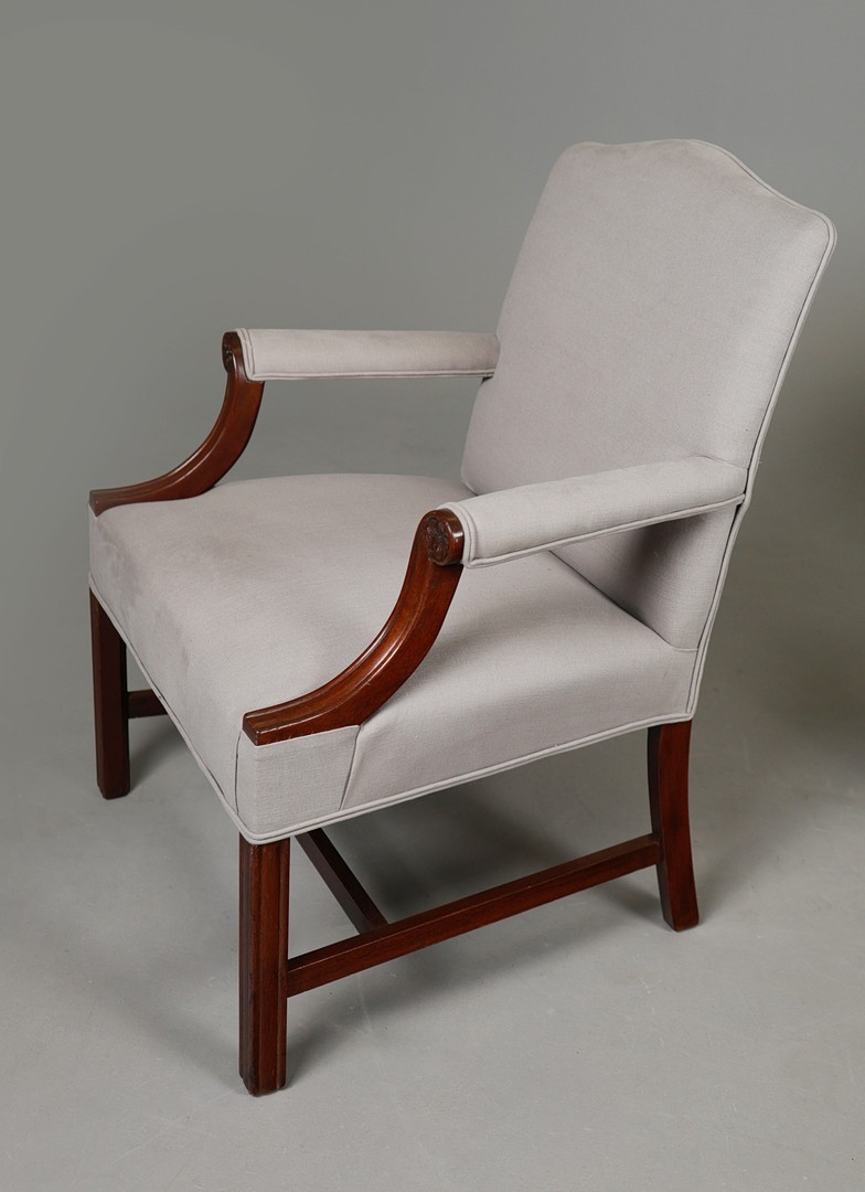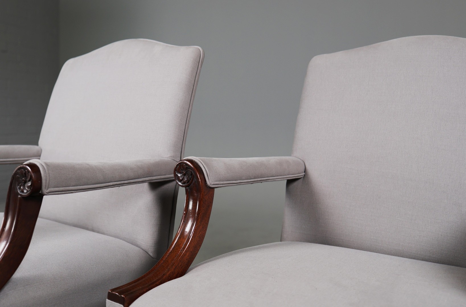PAIR OF GEORGE III STYLE ARMCHAIRS (2). mahogany in grey linen, 95cm H x 72cm W x 70cm D.