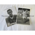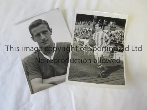PRESS PHOTOS / DENNIS VIOLLET Two B/W 8" X 6" photos with stamps on the reverse, portrait in Manchester United kit 21/10/1959 and with ball in hand for Stoke City 13/1/1965. Good. Good