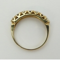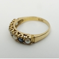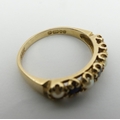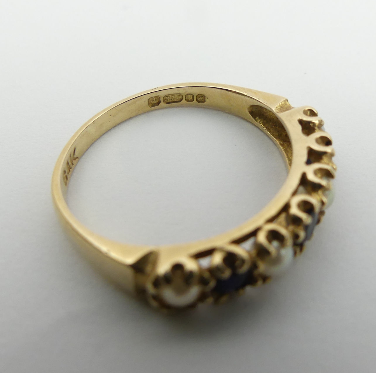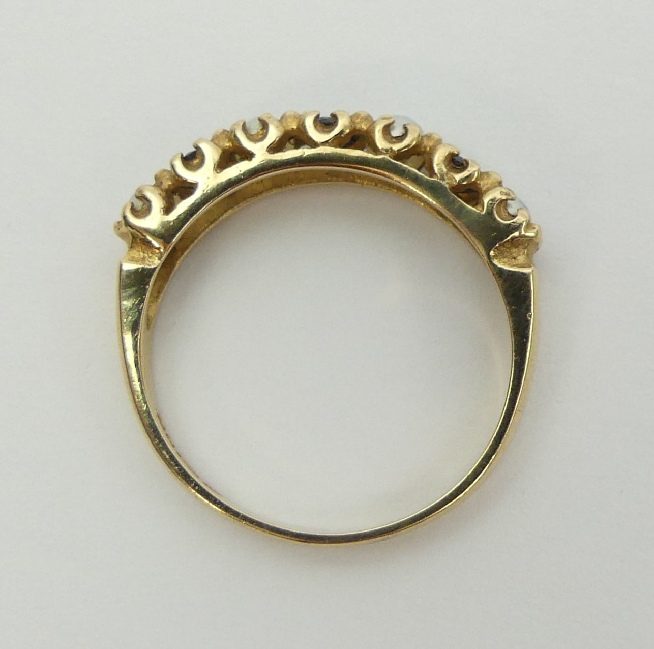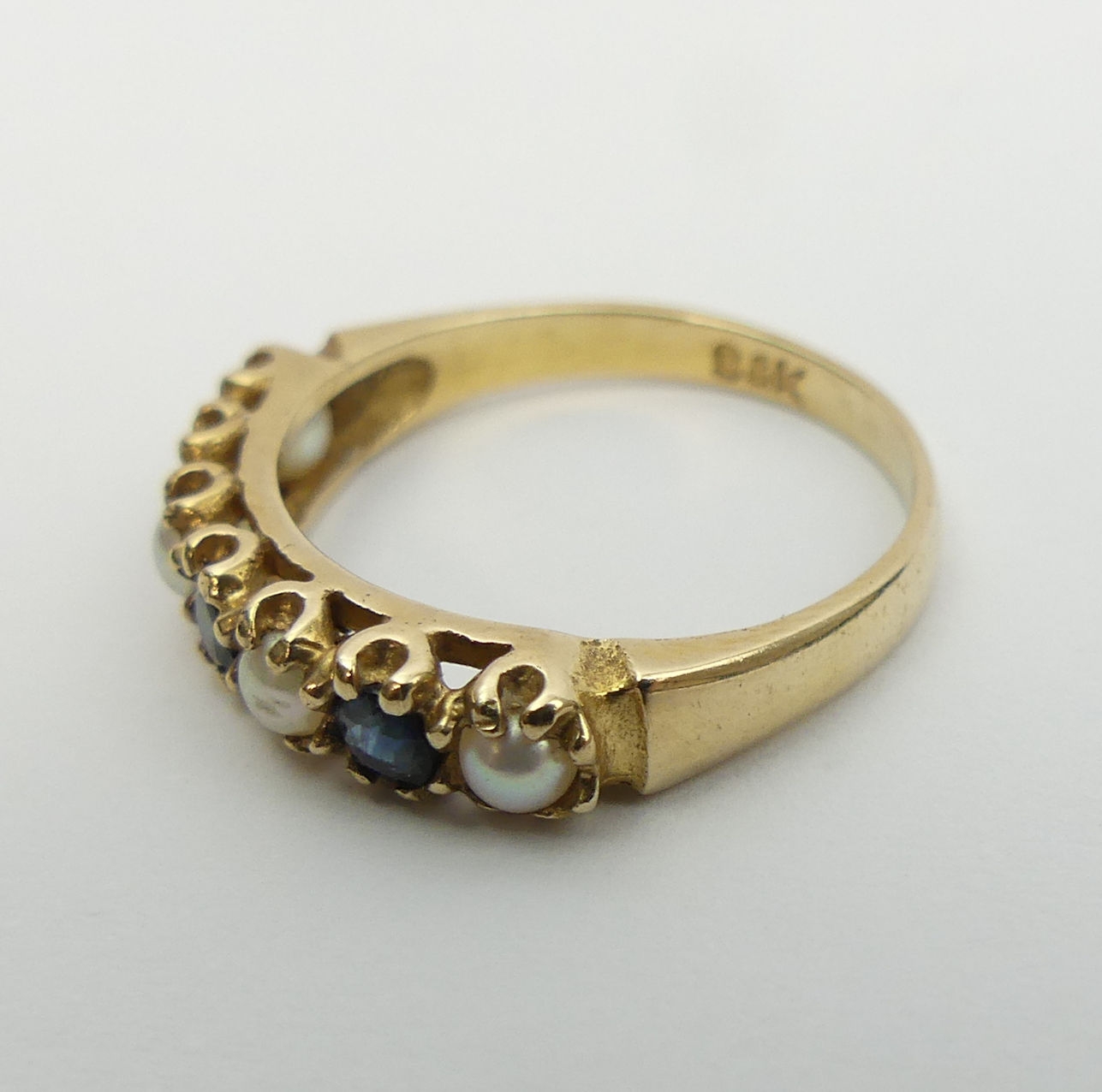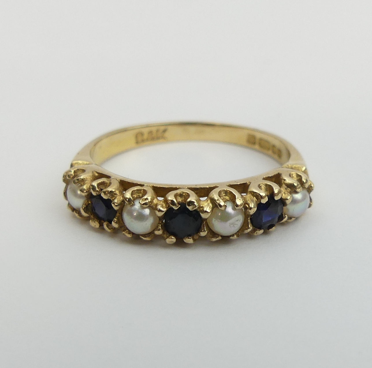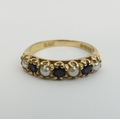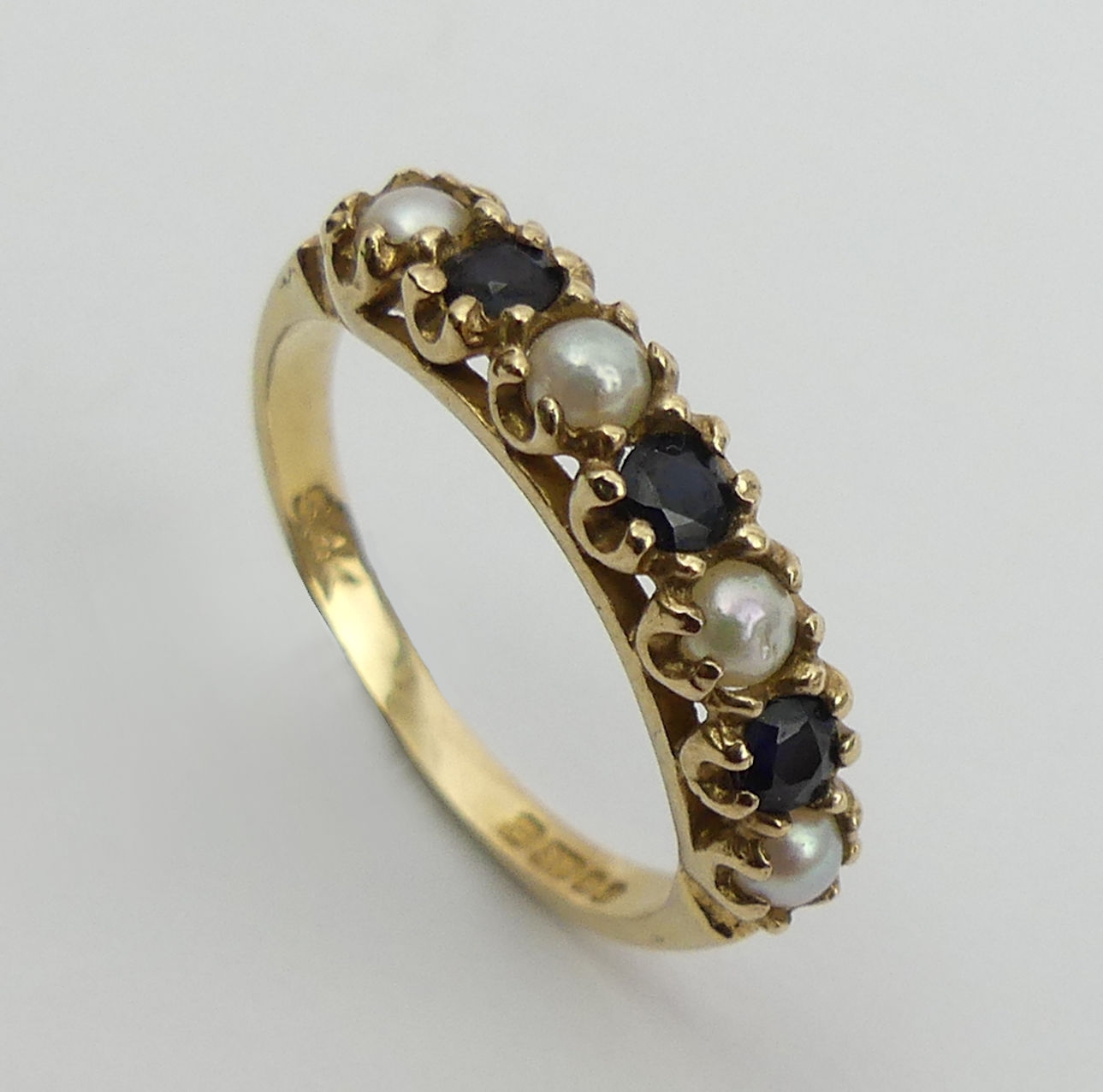 9ct gold sapphire and seed pearl ring, London 1975. 2 grams, Size M, 4.3 mm wide. UK Postage £12.