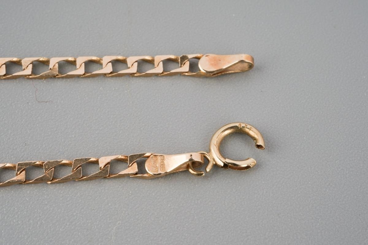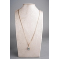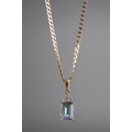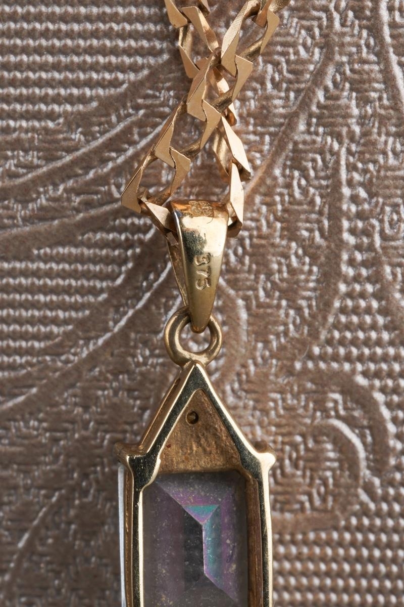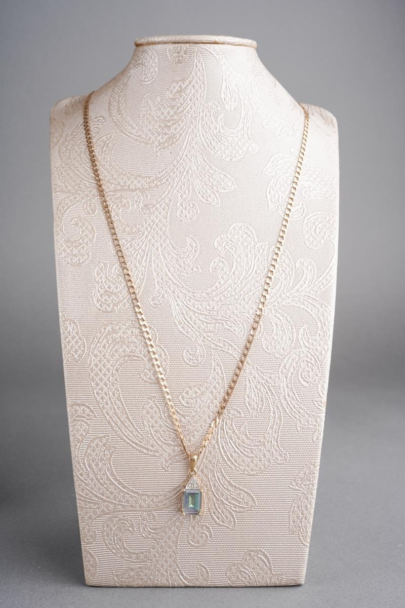 A 9ct gold topaz and diamond pendant with chain. The coated topaz with diamond accent detail, hallmarked 9ct gold, approx length pendant 20mm, approx length chain 540mm, approx gross weight 5.1 grams.