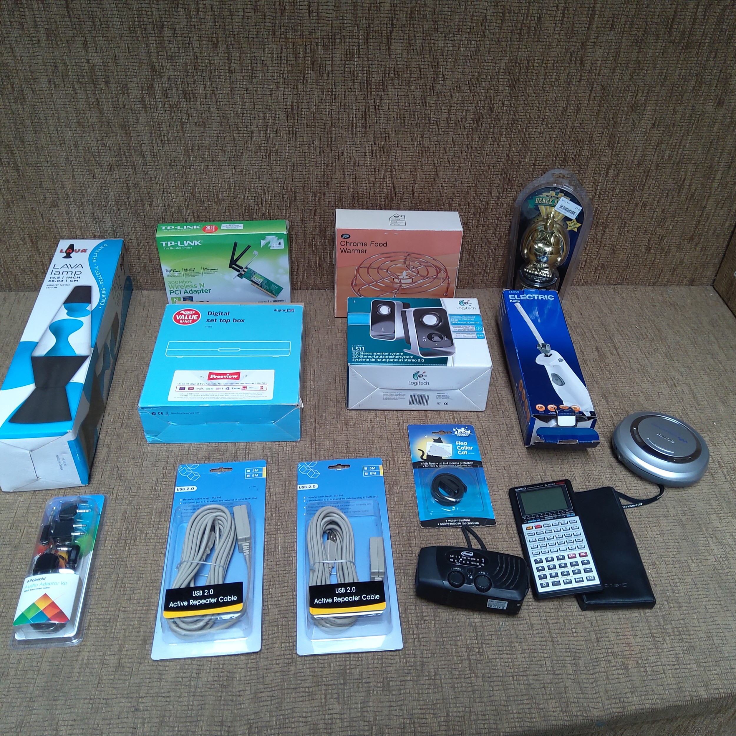 Mixed household and electrical items including a boxed Lava lamp and Digital set top box.