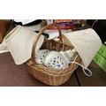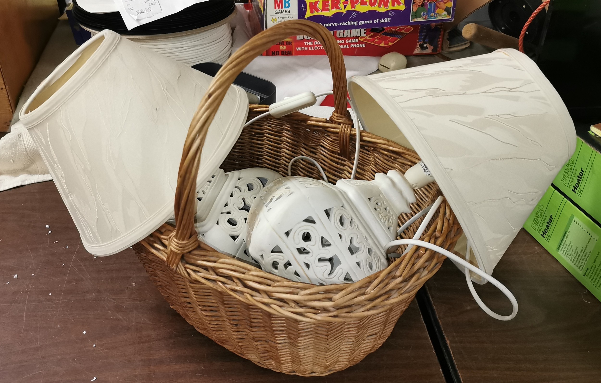 Pair of pierced pattern, ceramic lamps in wicker shopping basket