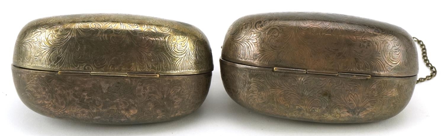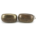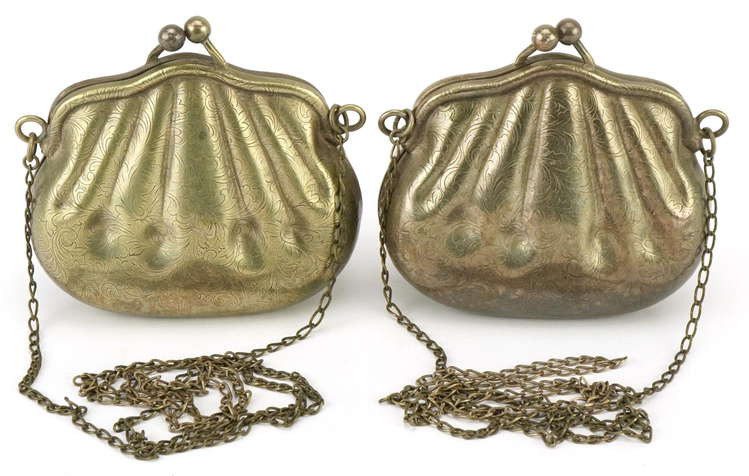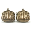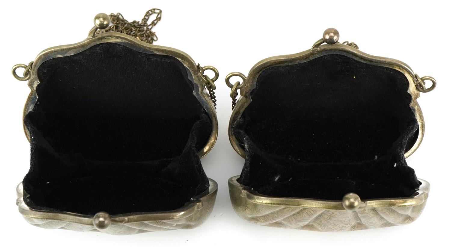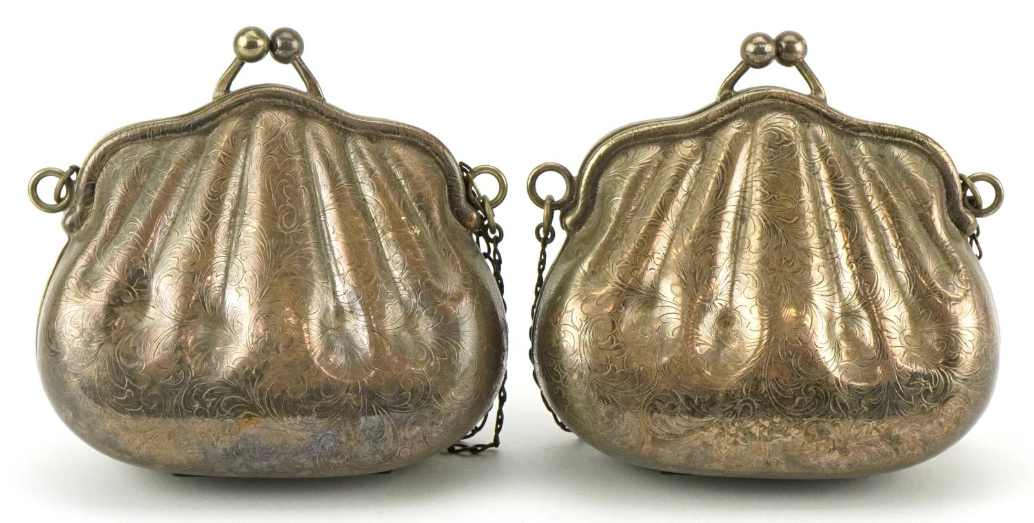 Two 1920s/30s silver plated purses in the form of clutch bags with floral engraved decoration, each 10cm x 9cm.