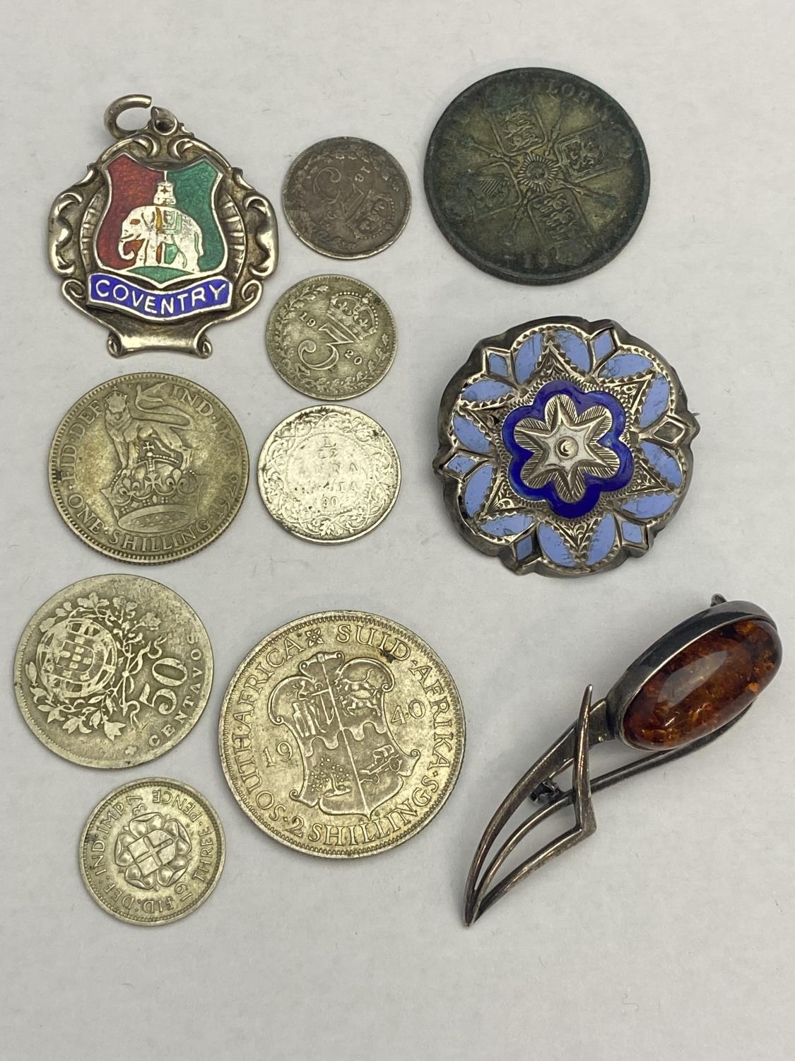 A selection of assorted silver including brooches and coins