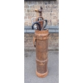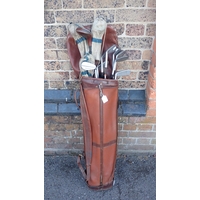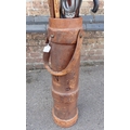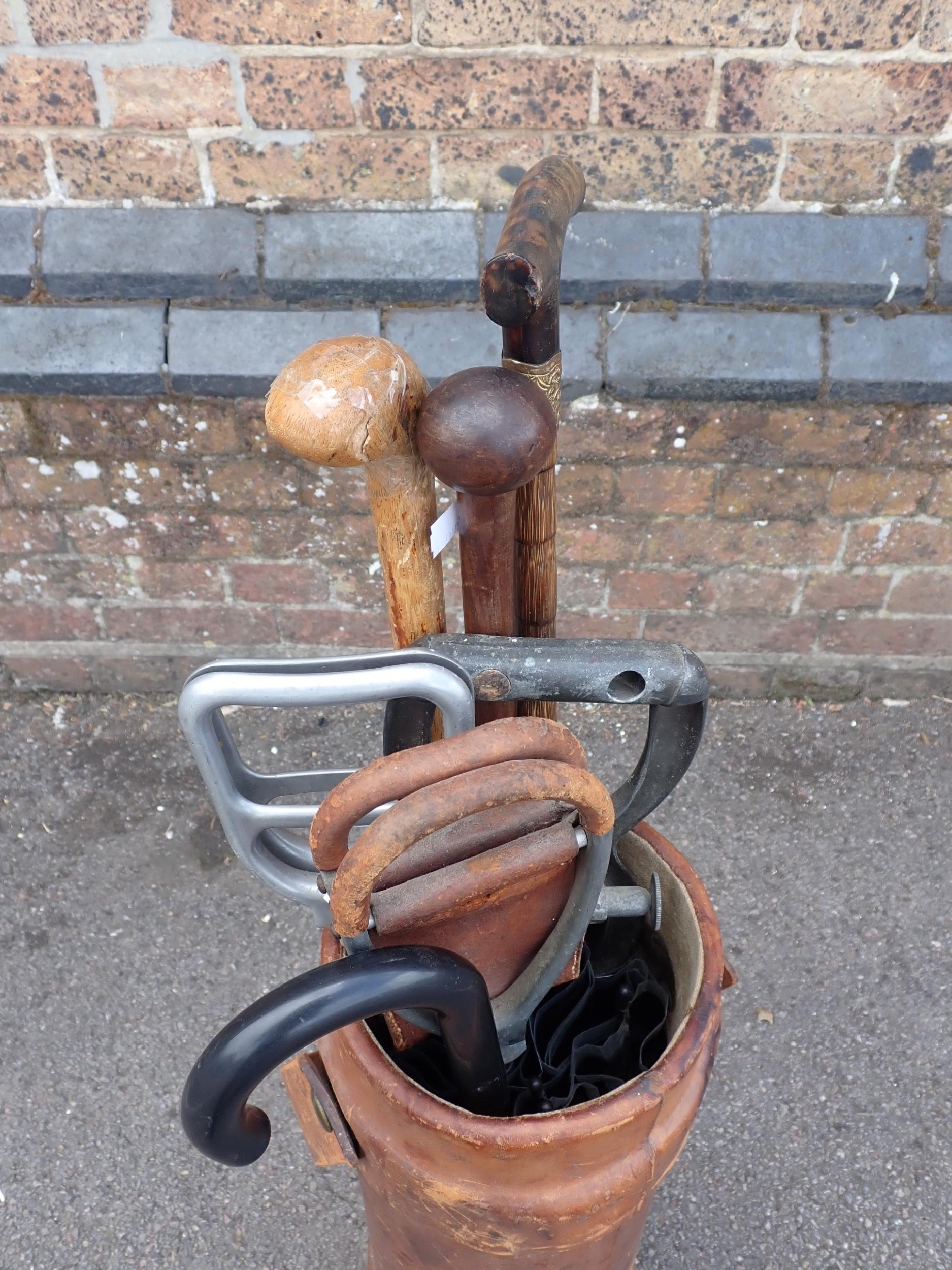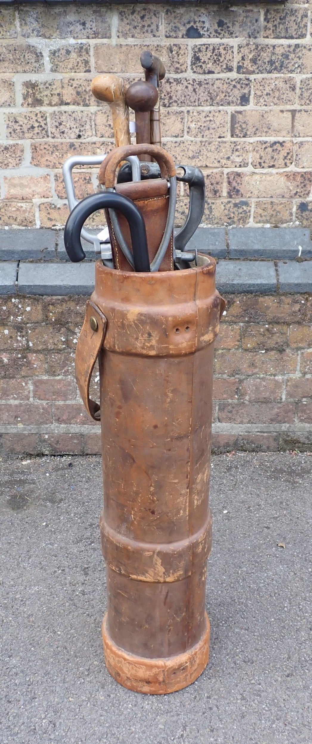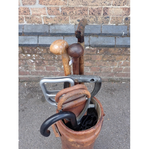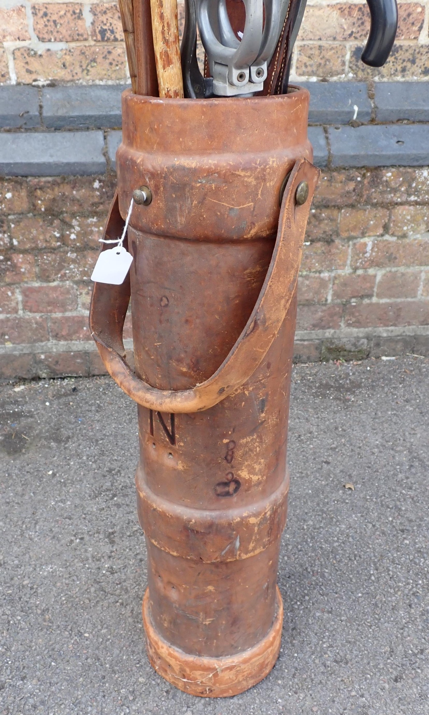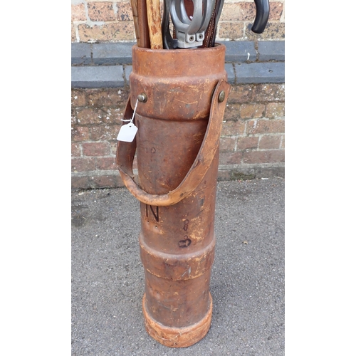 A LEATHER COVERED CORDITE CARRIER72cm high, containing various shooting sticks, walking sticks etc
