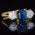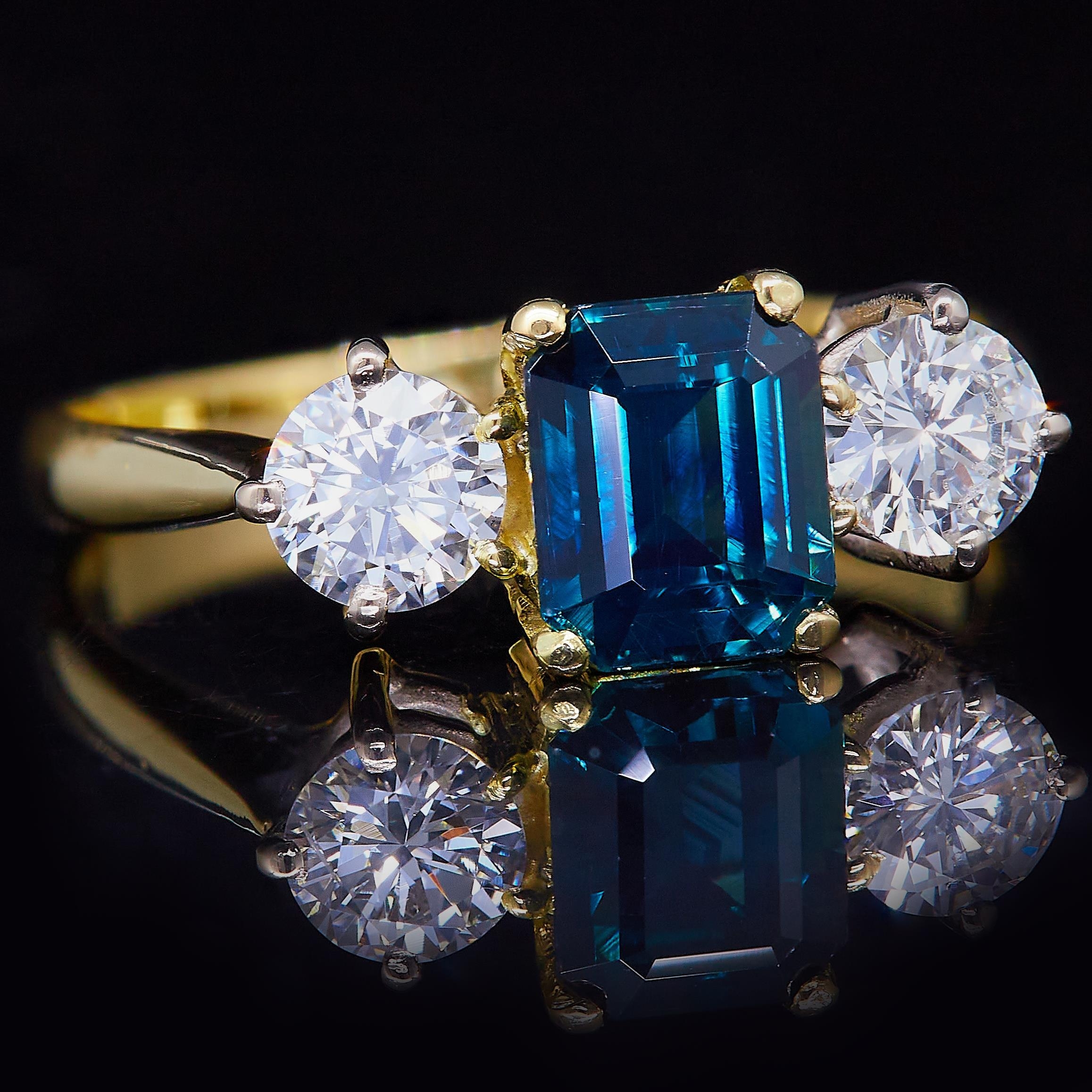 SAPPHIRE AND DIAMOND 3-STONE RING, in 18 ct. gold. Set with a central blue sapphire of approx. 1.41 ct. flanked with a diamond on each side totalling approx. 0.62 ct. Size M. 4 grams.