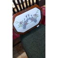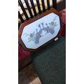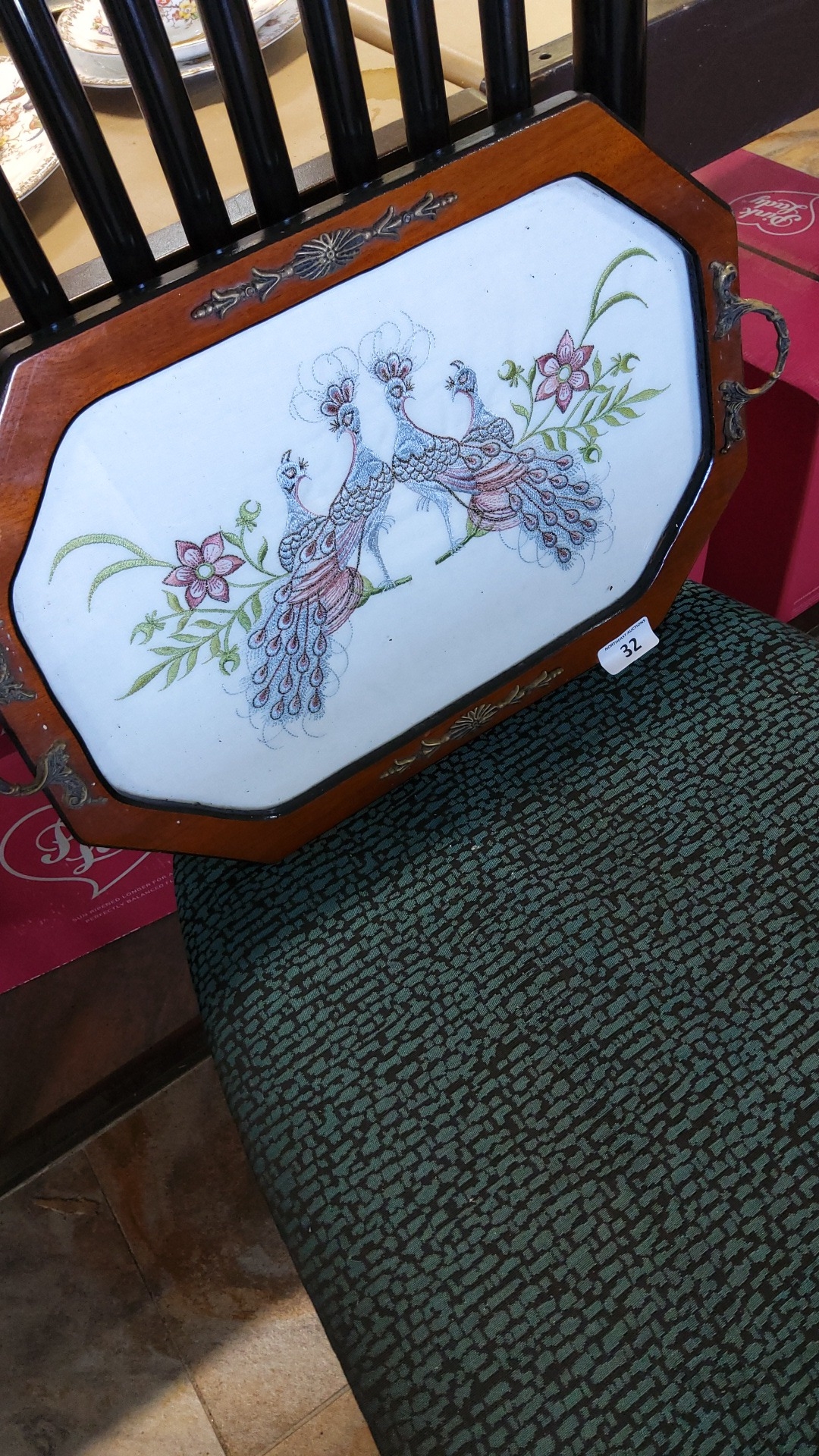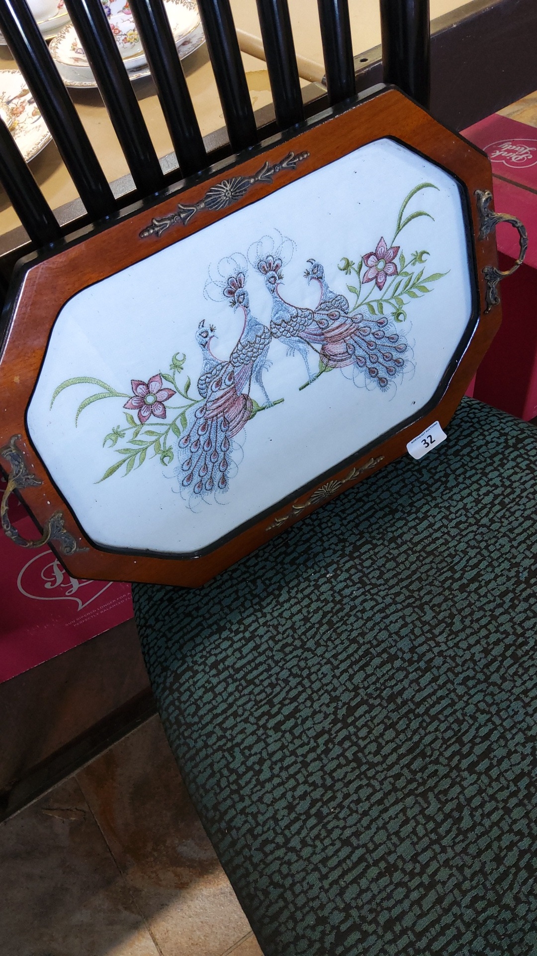 A rectangular wooden serving tray with cut corners, fitted with brass-tone handles and mounts, the central panel worked in needlepoint with three peacocks amid stylised foliage and flowers.