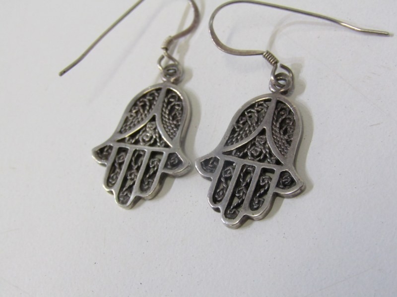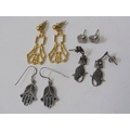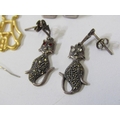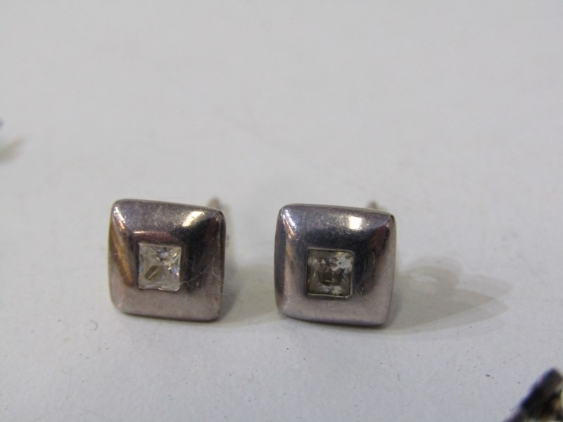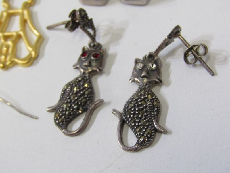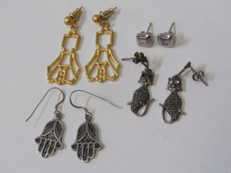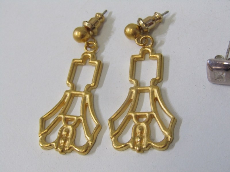 VARIOUS EARRINGS, 4 pairs of earrings including a pair of gilded Art Deco flapper style earrings, a silver filigree pair of drop hook earrings, silver vintage cut drop earrings, together with silver stone set stud earrings (4 pairs) (4, 5, 3, 7)