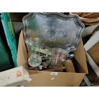 Job lot of kitchen items to include a green enamel bread bin, a large white planter, cutlery drawer full and miniature glass bottles