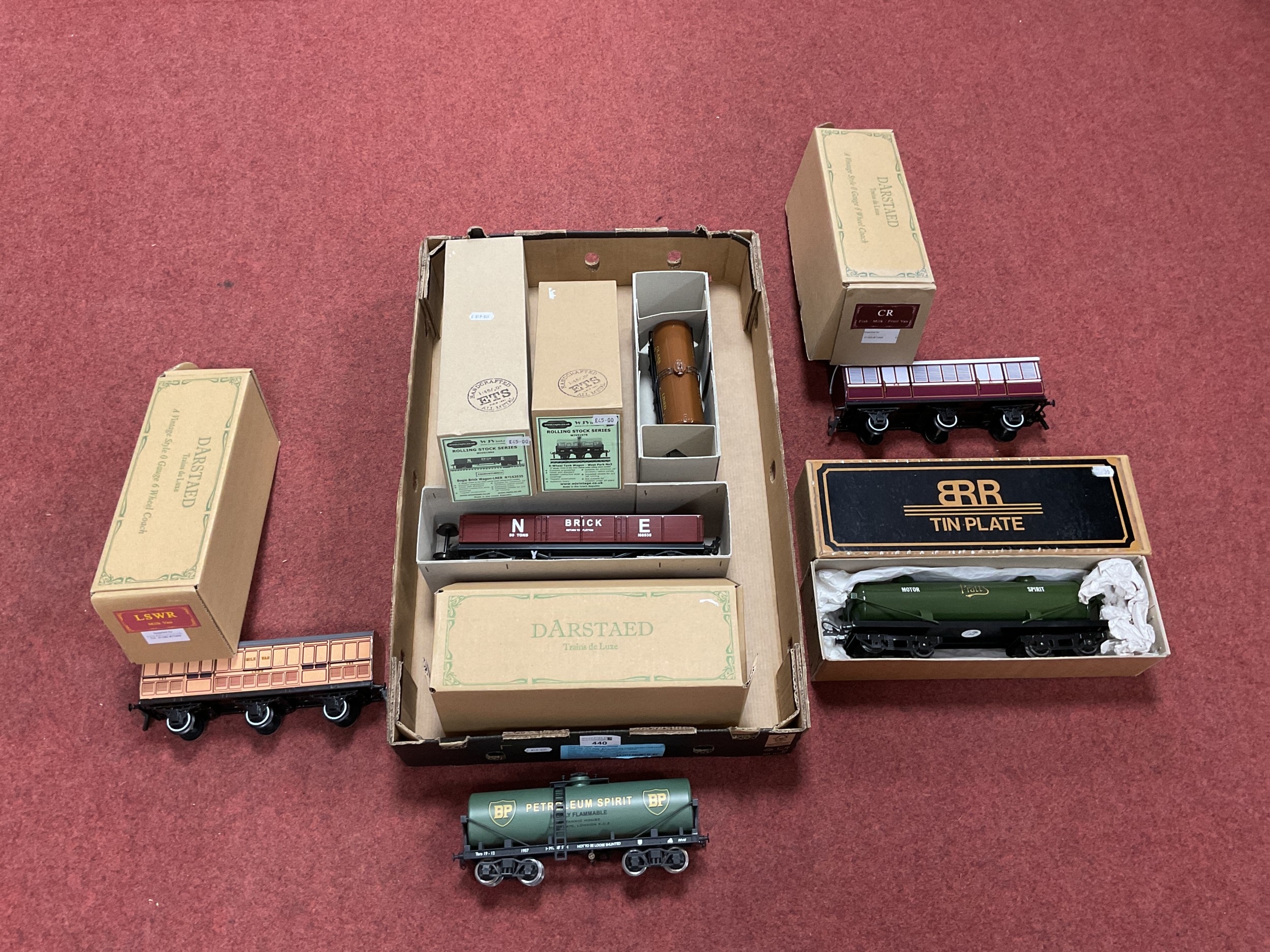 Six 'O' Gauge/7mm Boxed Items of Rolling Stock, to include a Ralor bogie brick wagon and six wheel tank wagon, a Pratt's bogie tank wagon, a Darstead six wheel milk van and a six wheel "Fish/Milk/Fruit" example, plus a Darstead BP tank wagon, all appear new, unused in very good boxes.