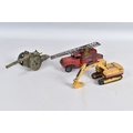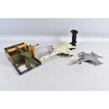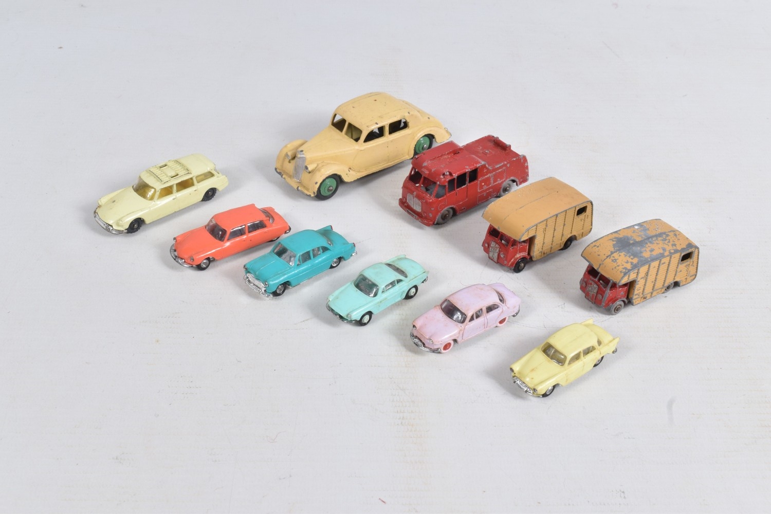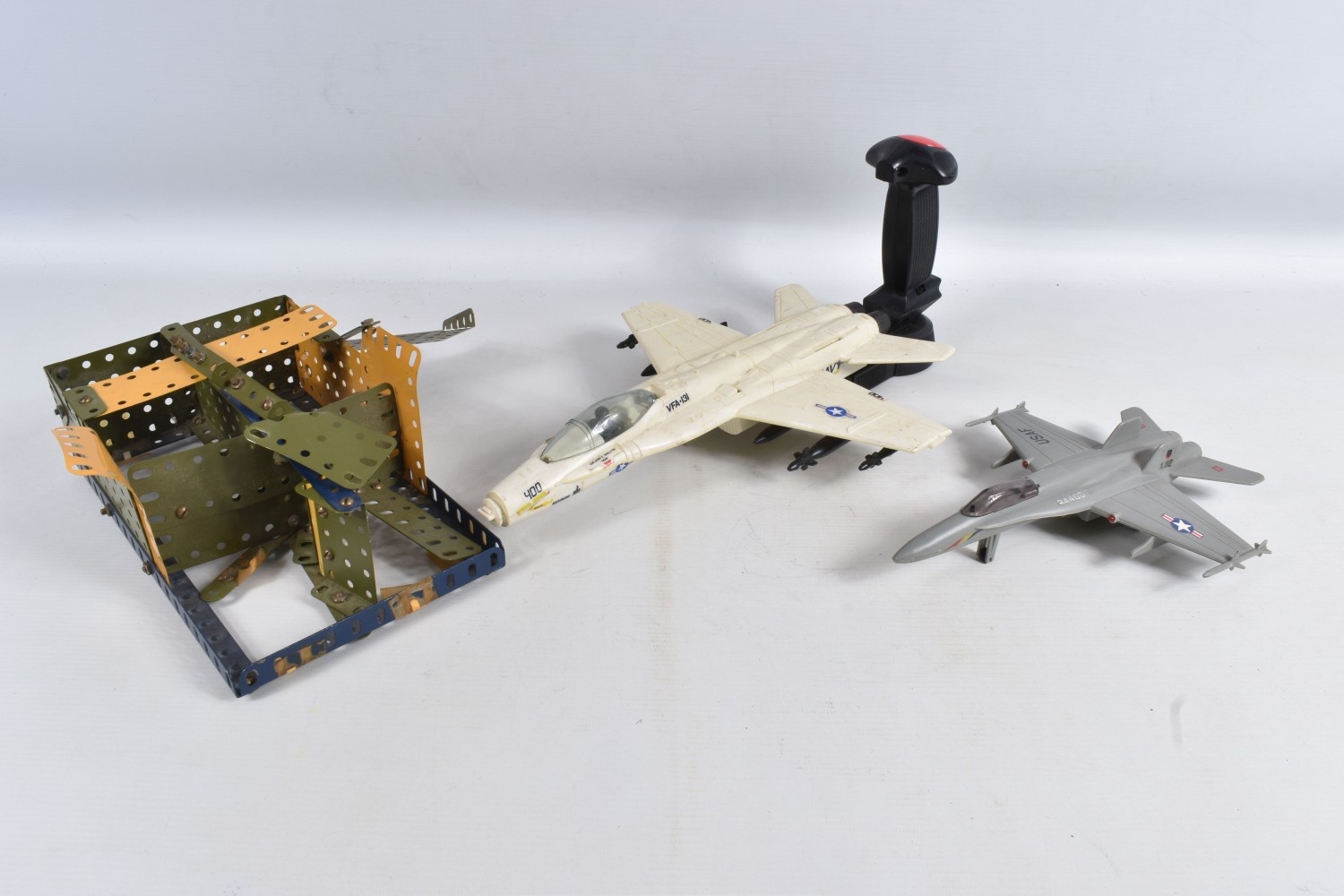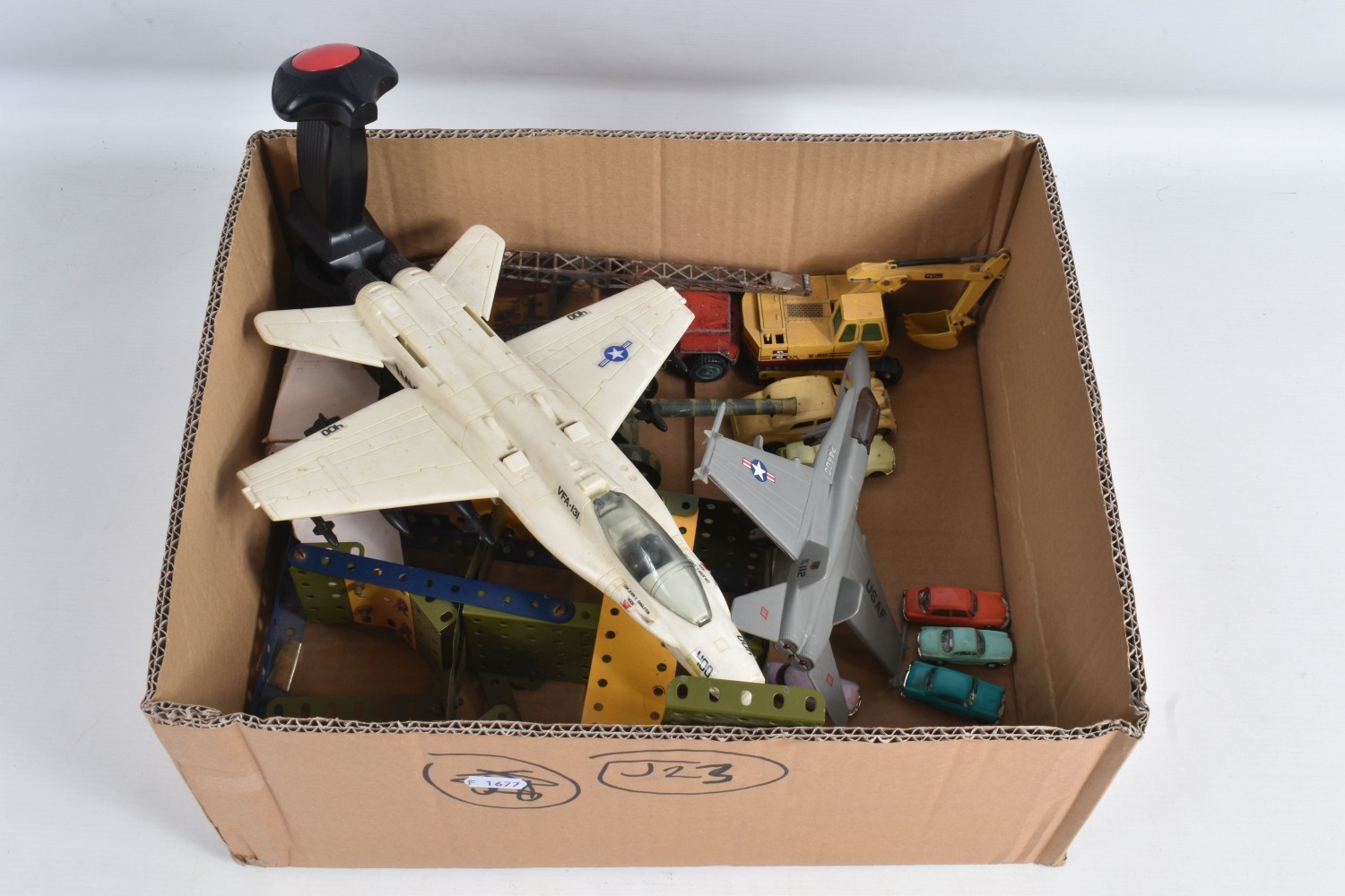 A QUANTITY OF UN BOXED ASSORTED PLAYWORN DIECAST AND PLASTIC VEHICLES, to include Dinky Toys Riley Saloon, cream body, green hubs, No.158, quantiy of Norev 1/86 scale plastic French cars, NZG Ruston Bucyrus 155-RH tracked Excavator, Corgi, Britains, boxed unbuilt D & M cast metal R.N.L.I. Oakley Lifeboat kit, contents not checked but appears largely complete, box damaged, quantity of loose Meccano, two plastic U.S.A.F. aircraft models, both with minor damage