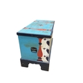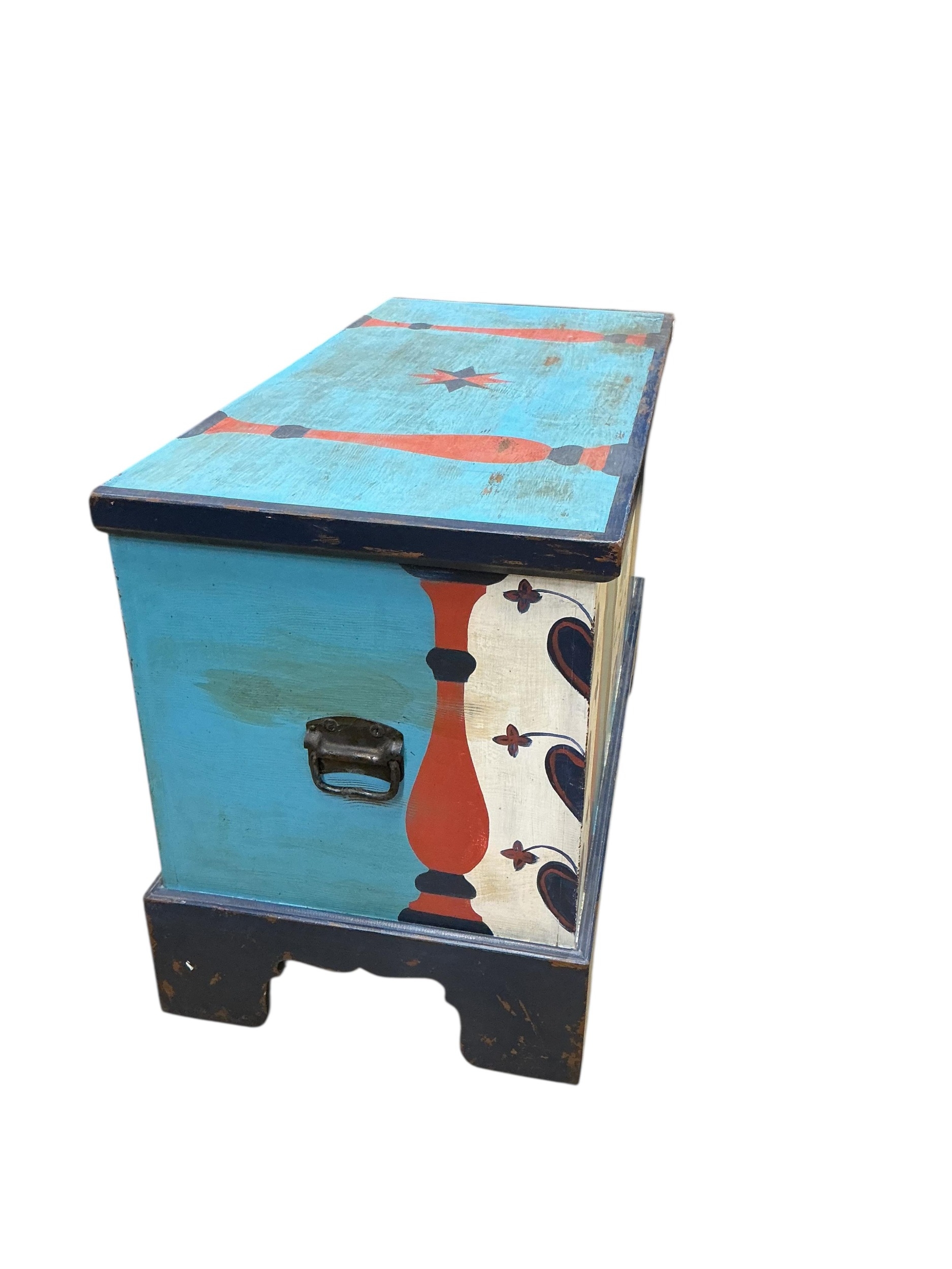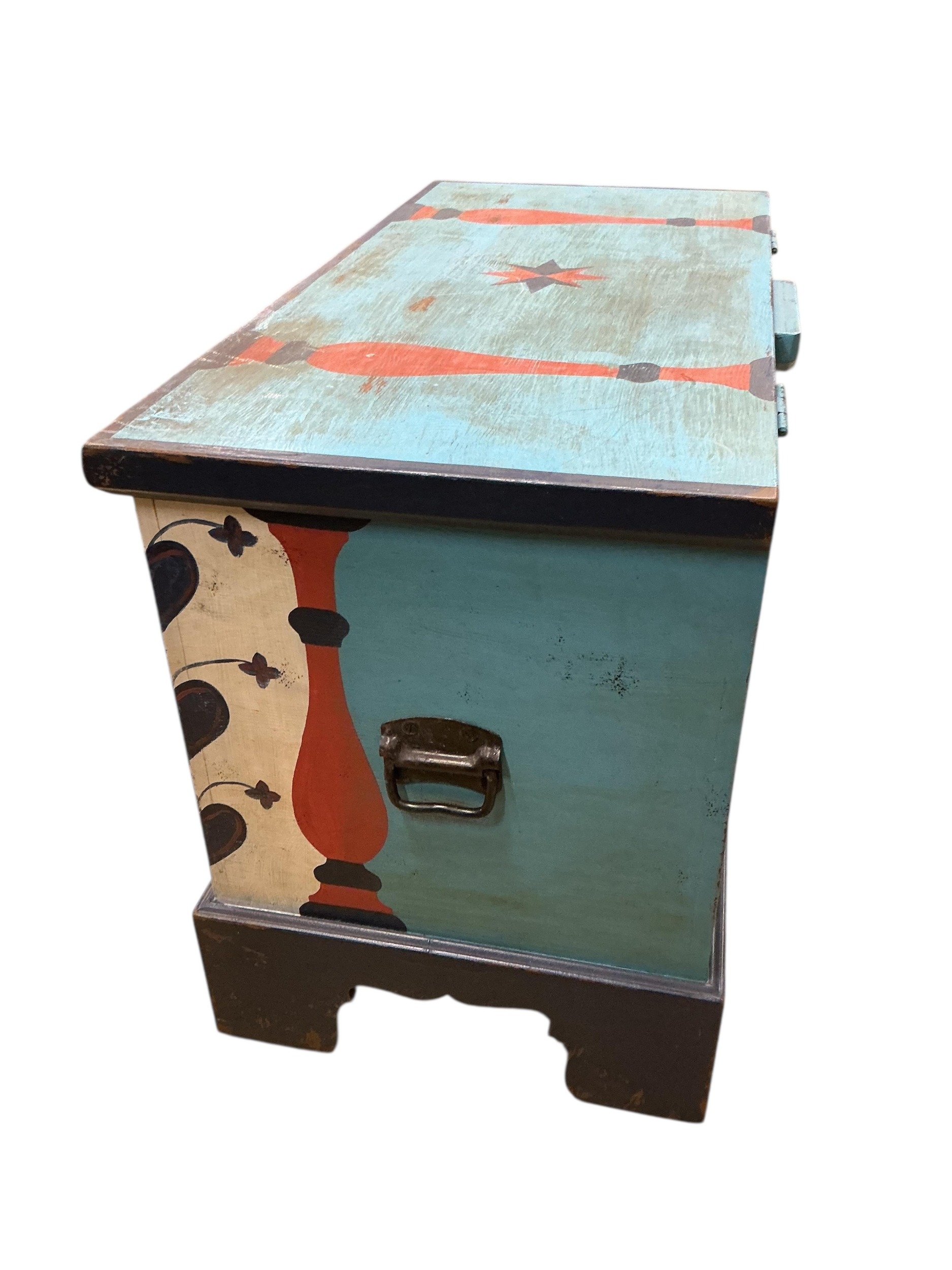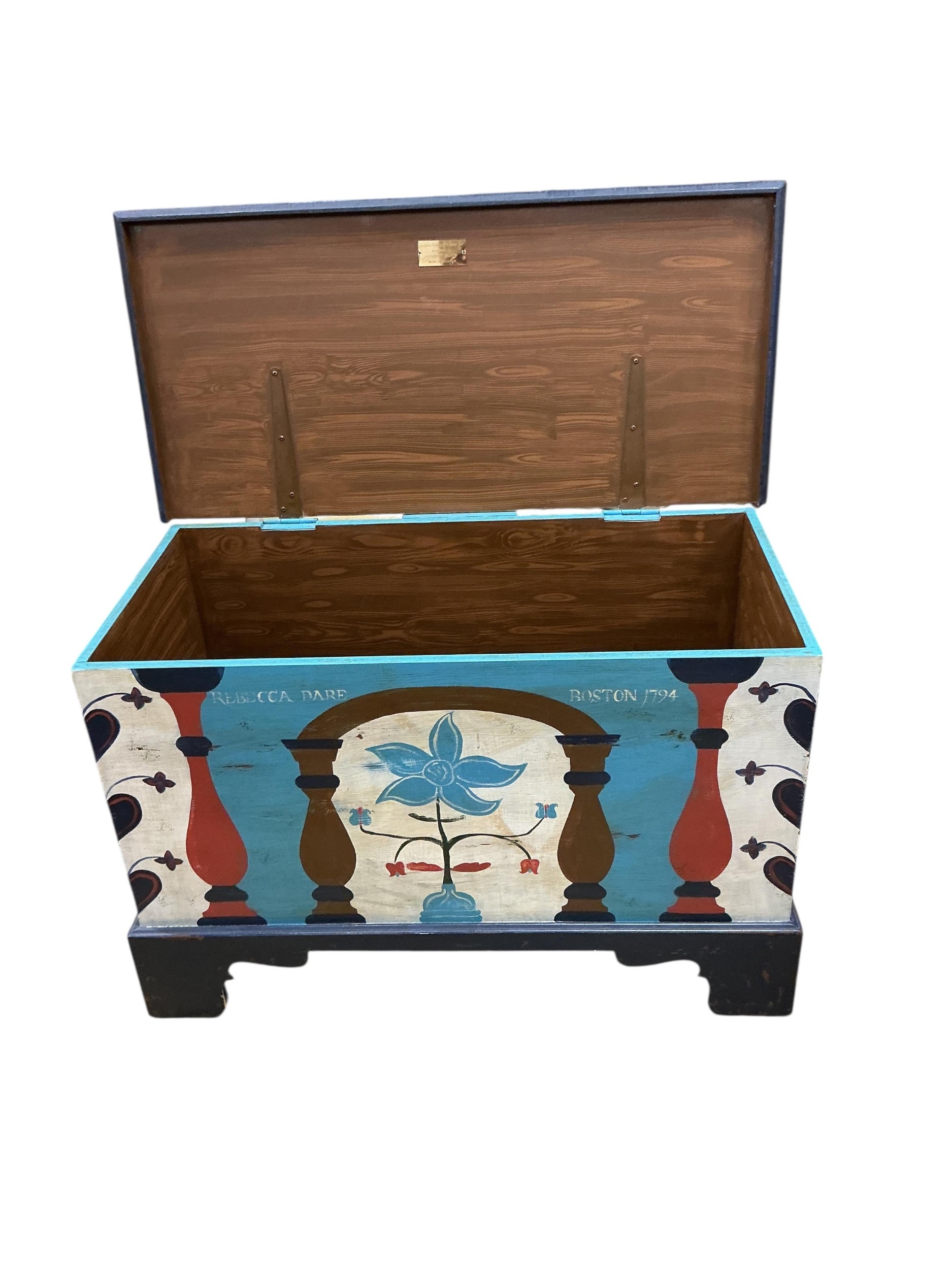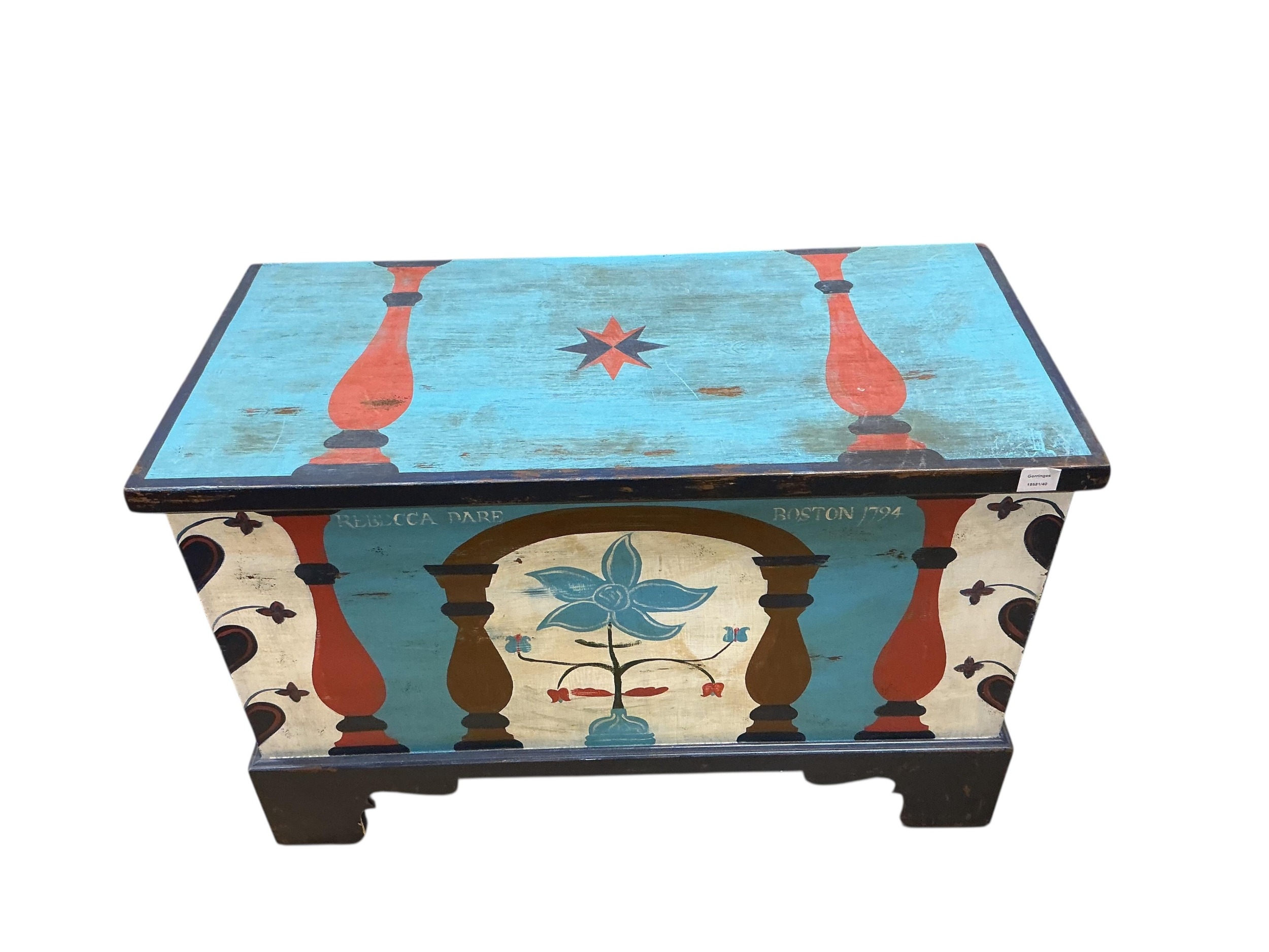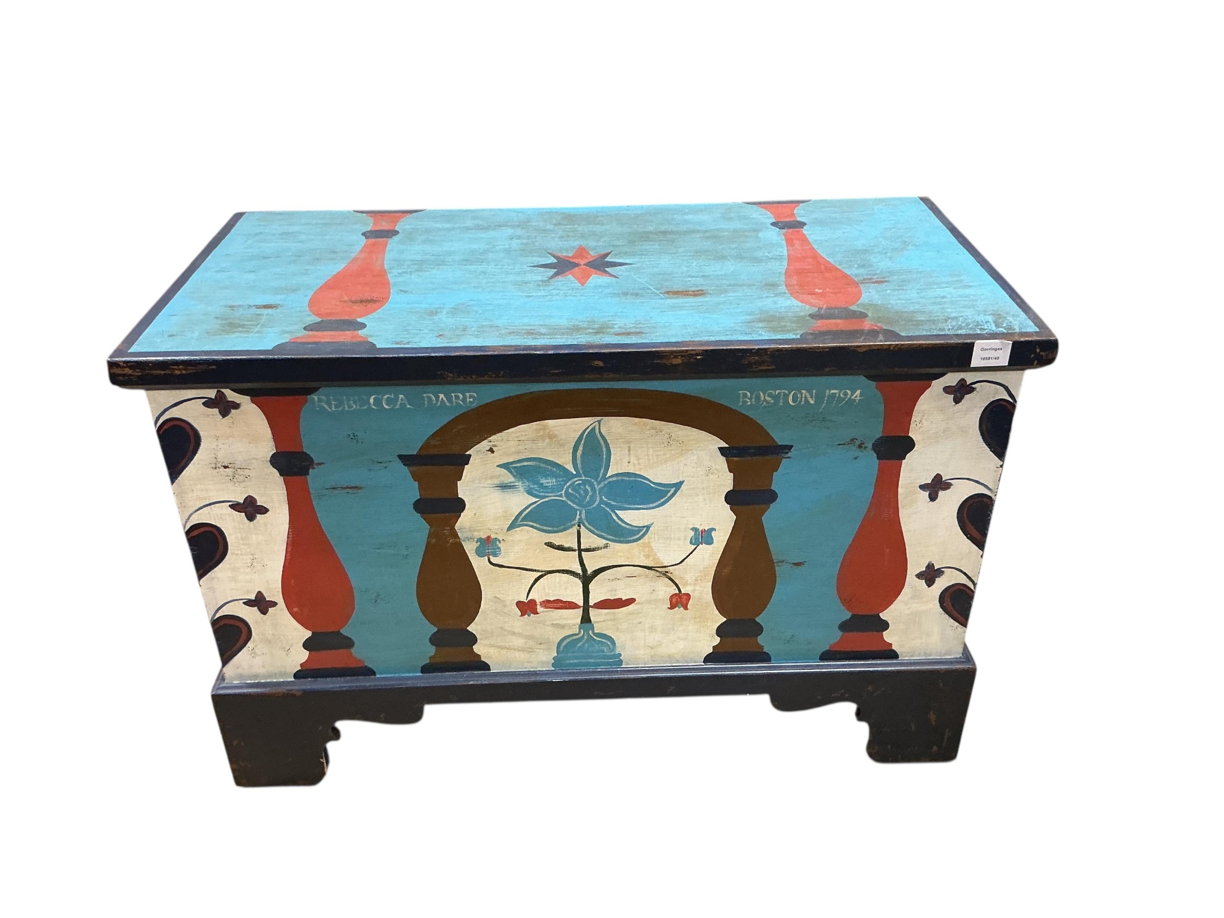 A painted chest, floral decorated and inscribed, width 102cm, depth 49cm, height 67cm
