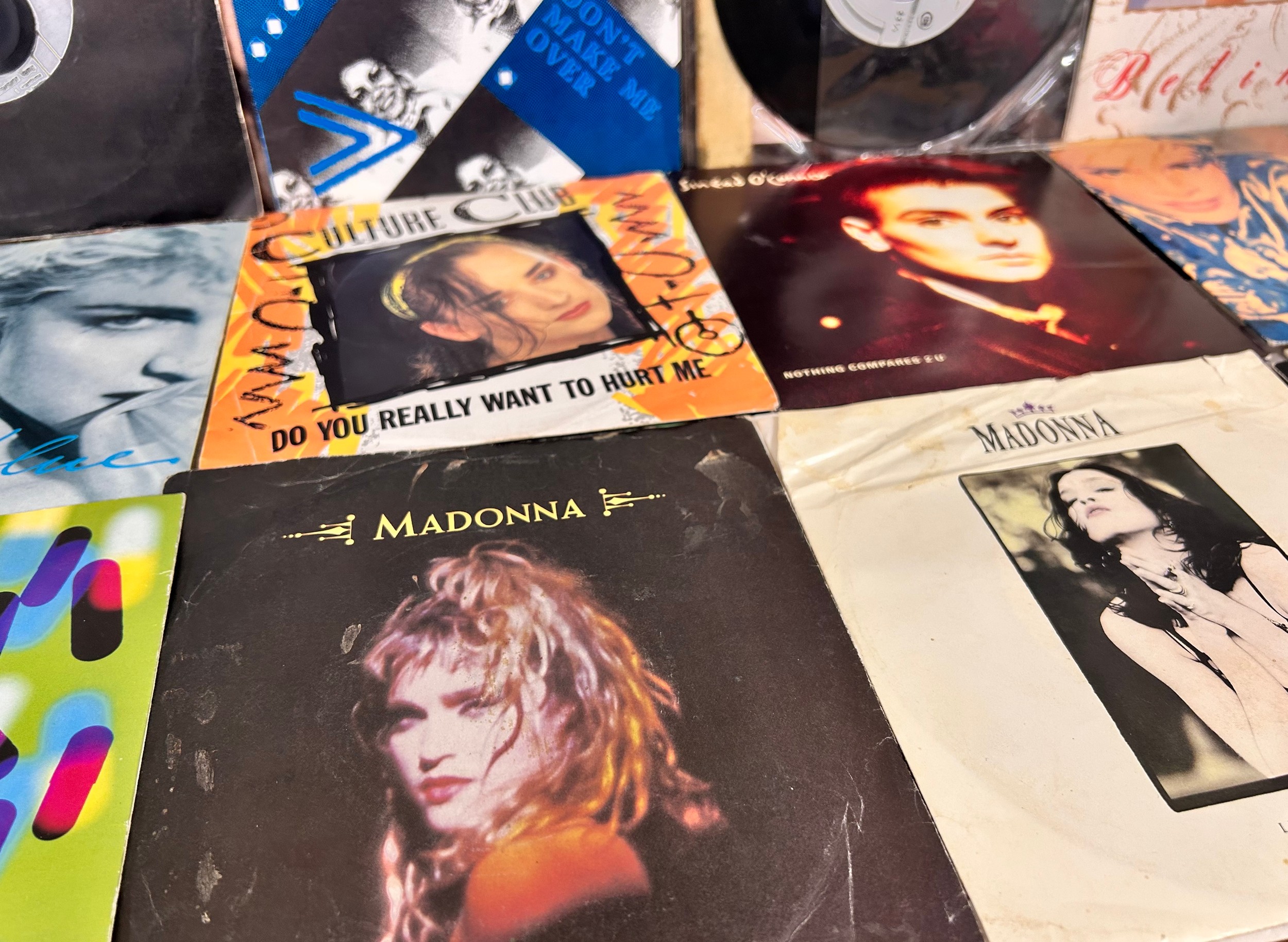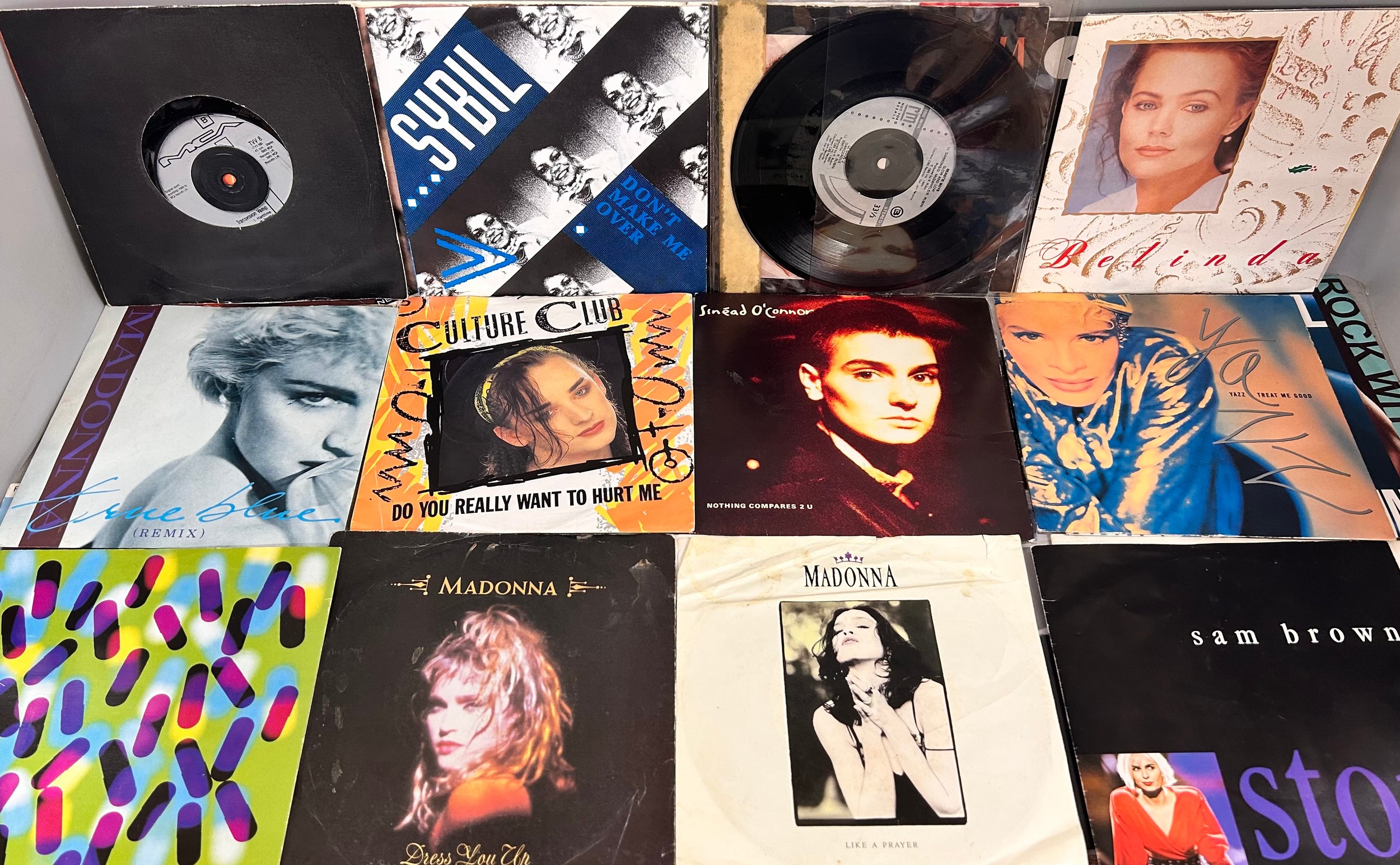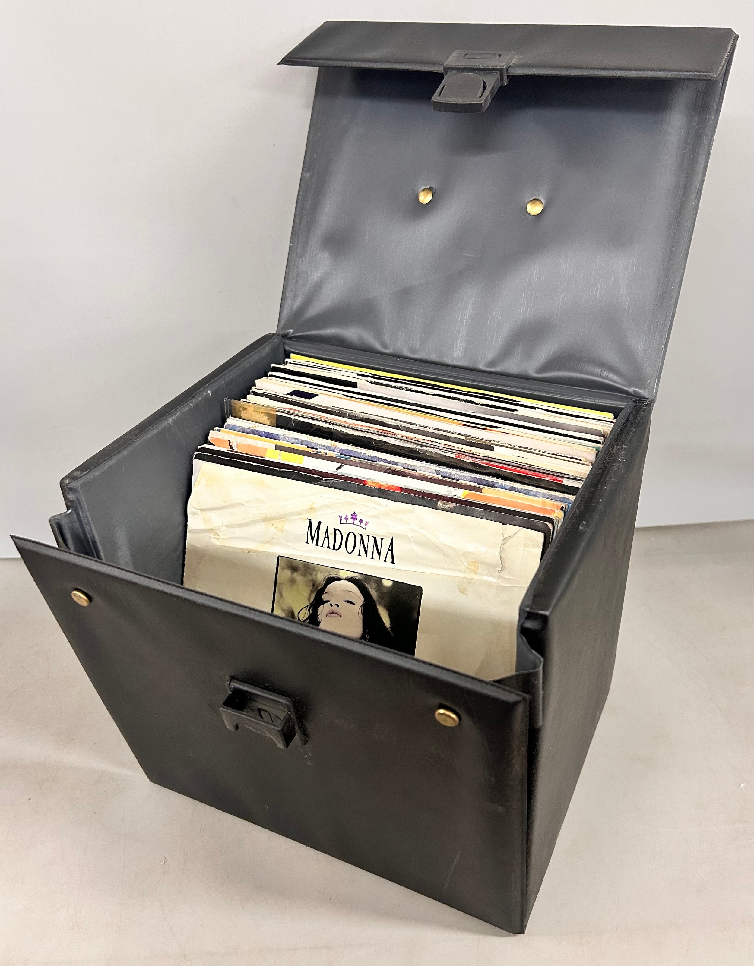 A collection of 48 7" singles from the 1980s/90s to include Madonna, UB40, Culture Club, Chaka Chan, Erasure, Style Council, etc., in a case (handle a/f)