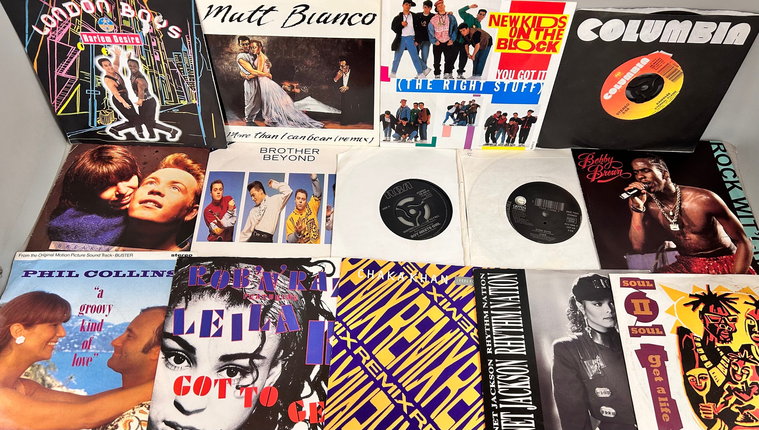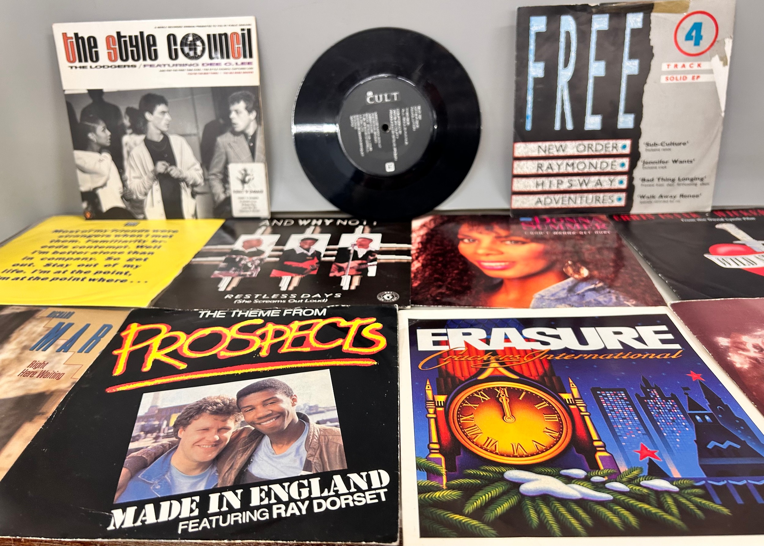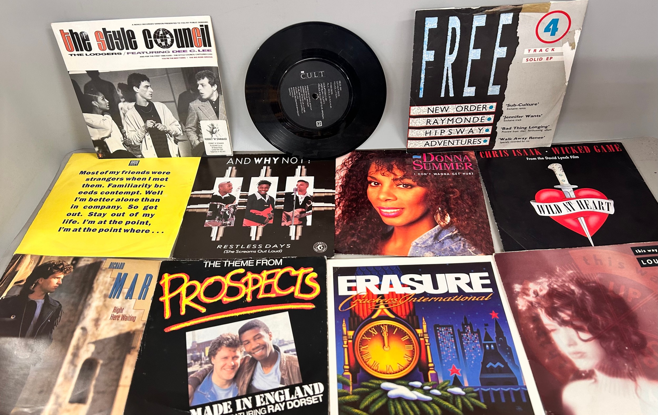 A collection of 48 7" singles from the 1980s/90s to include Madonna, UB40, Culture Club, Chaka Chan, Erasure, Style Council, etc., in a case (handle a/f)