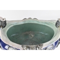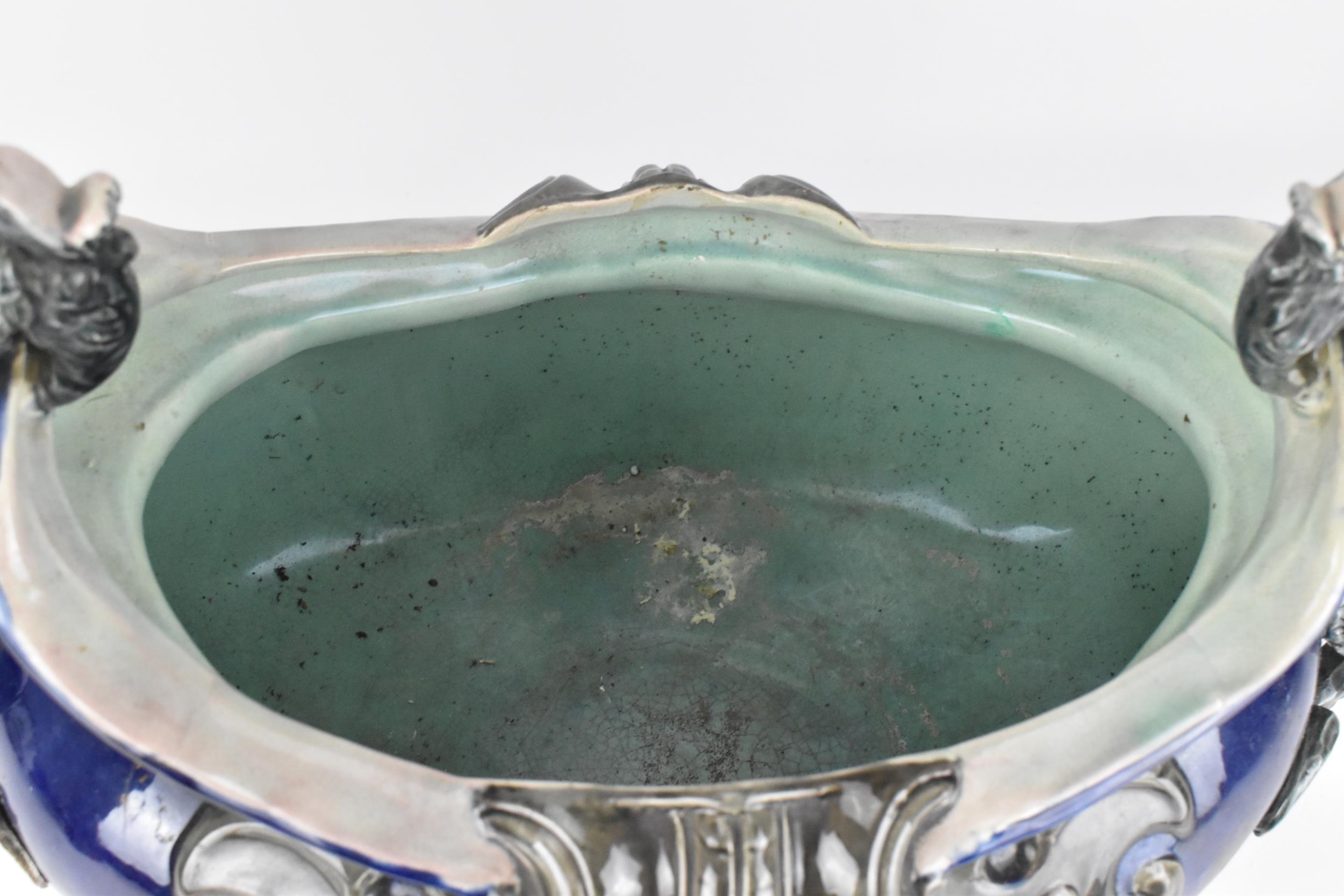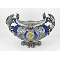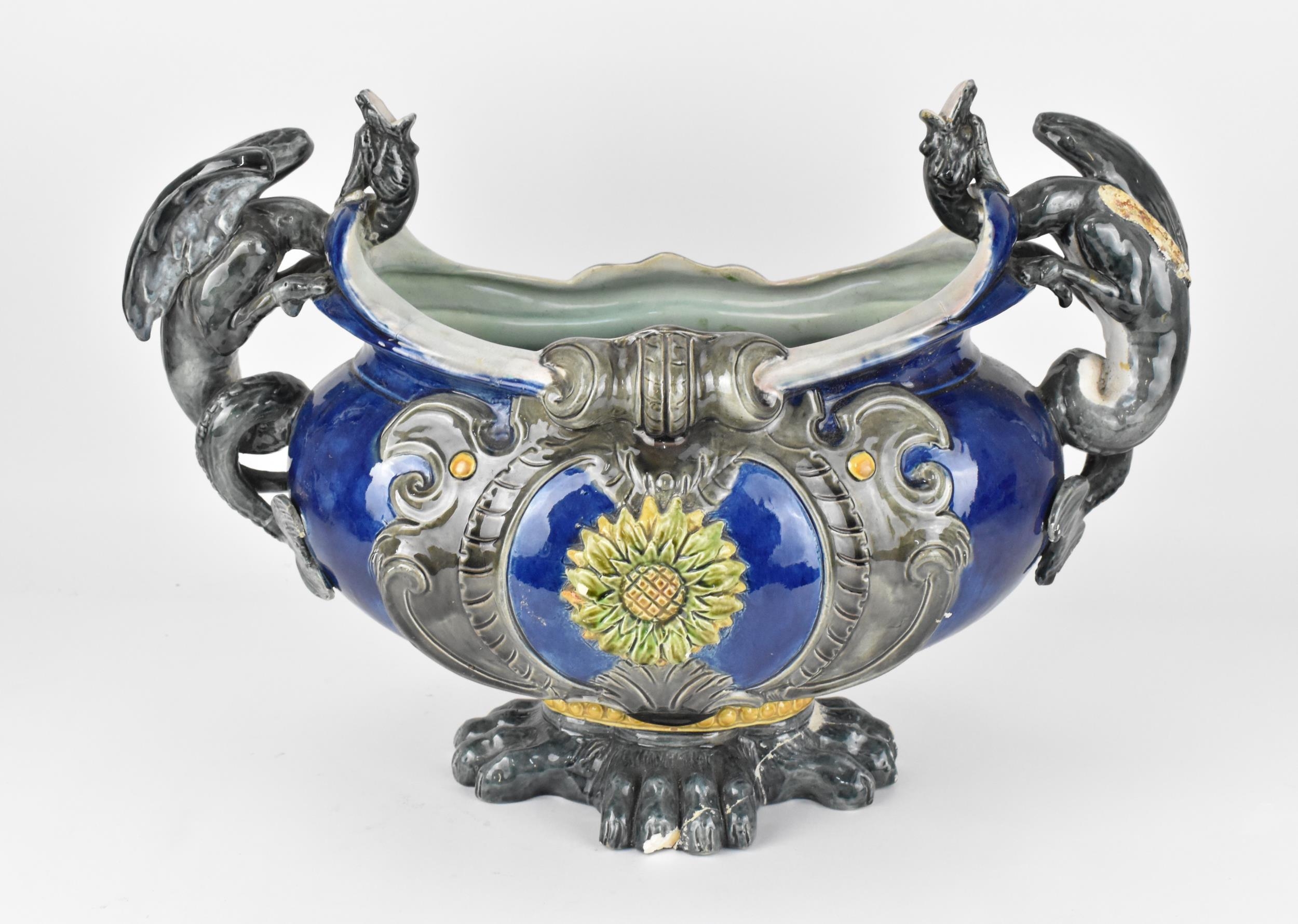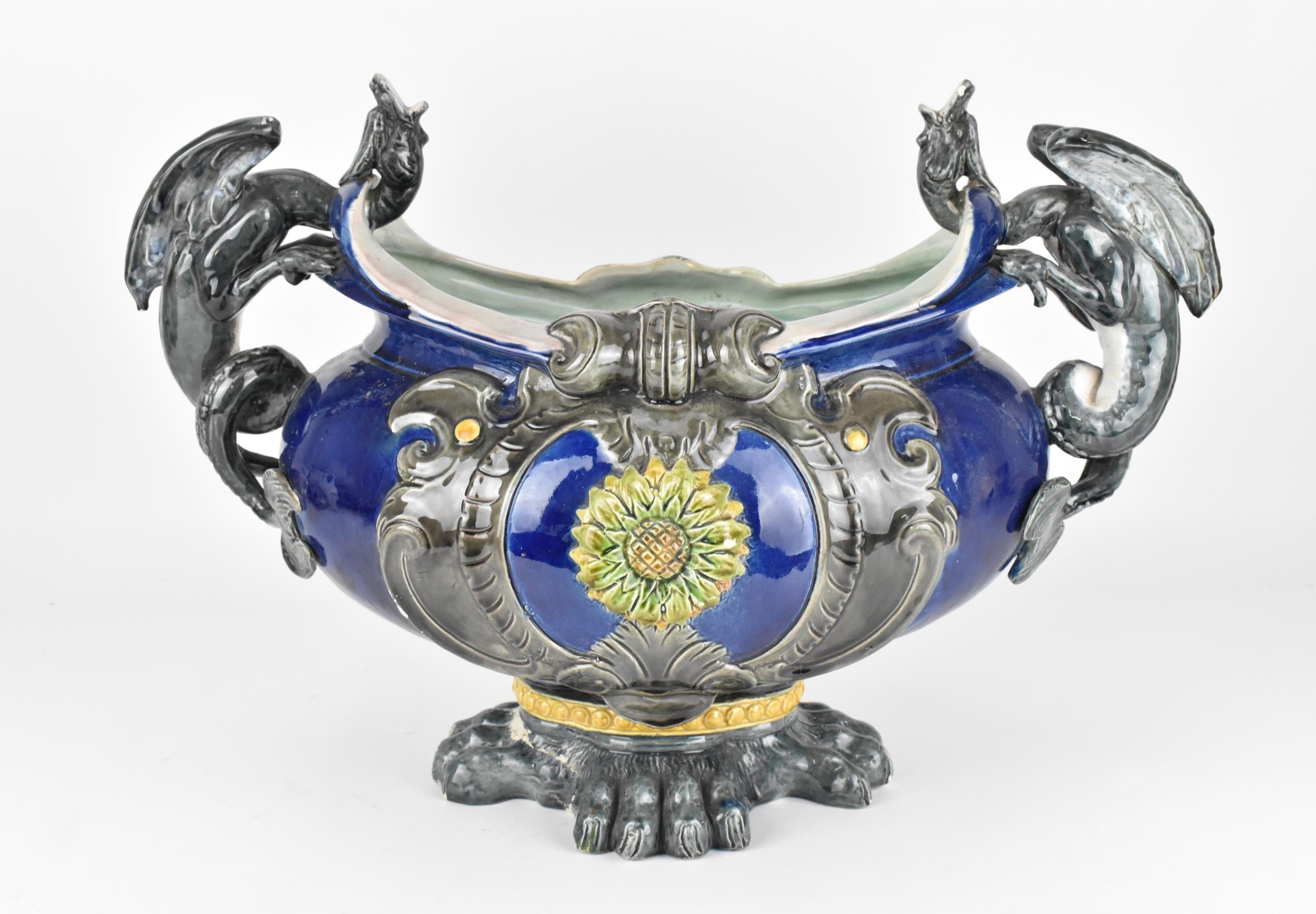 A Continental majolica jardiniere, possibly French, flanked with winged dragon handles, the oval body with cobalt blue ground and central cartouche with sunflower, supported on four paw feet, unmarked, 48.5 cm wide x 33 cm high