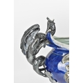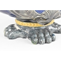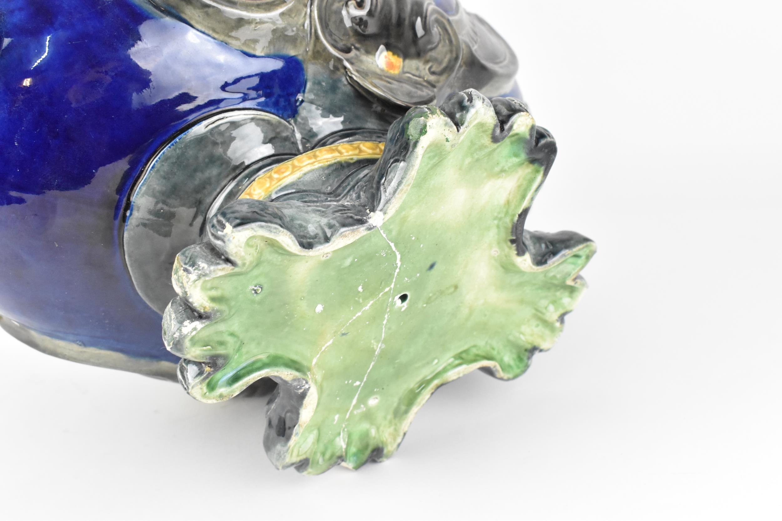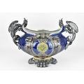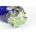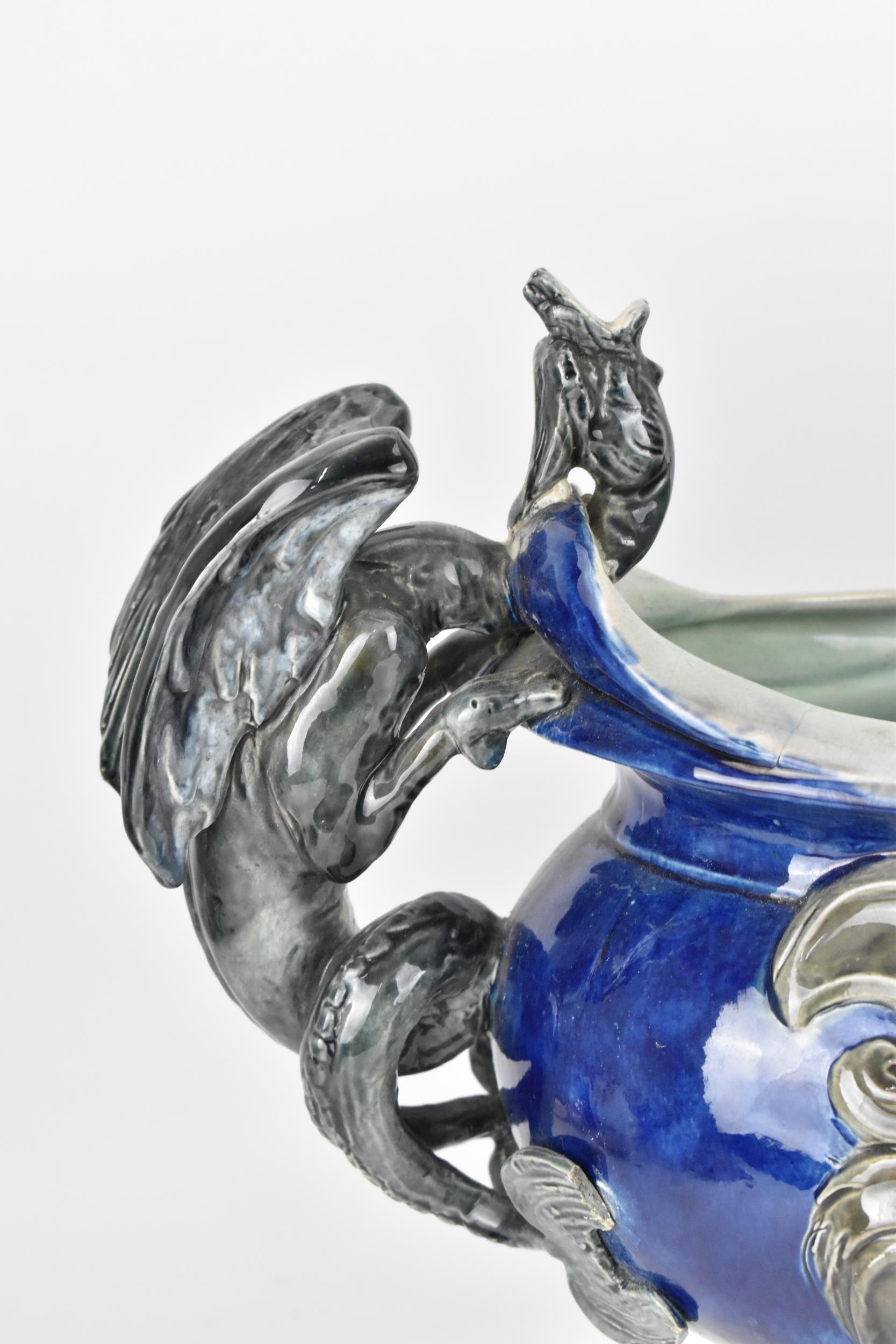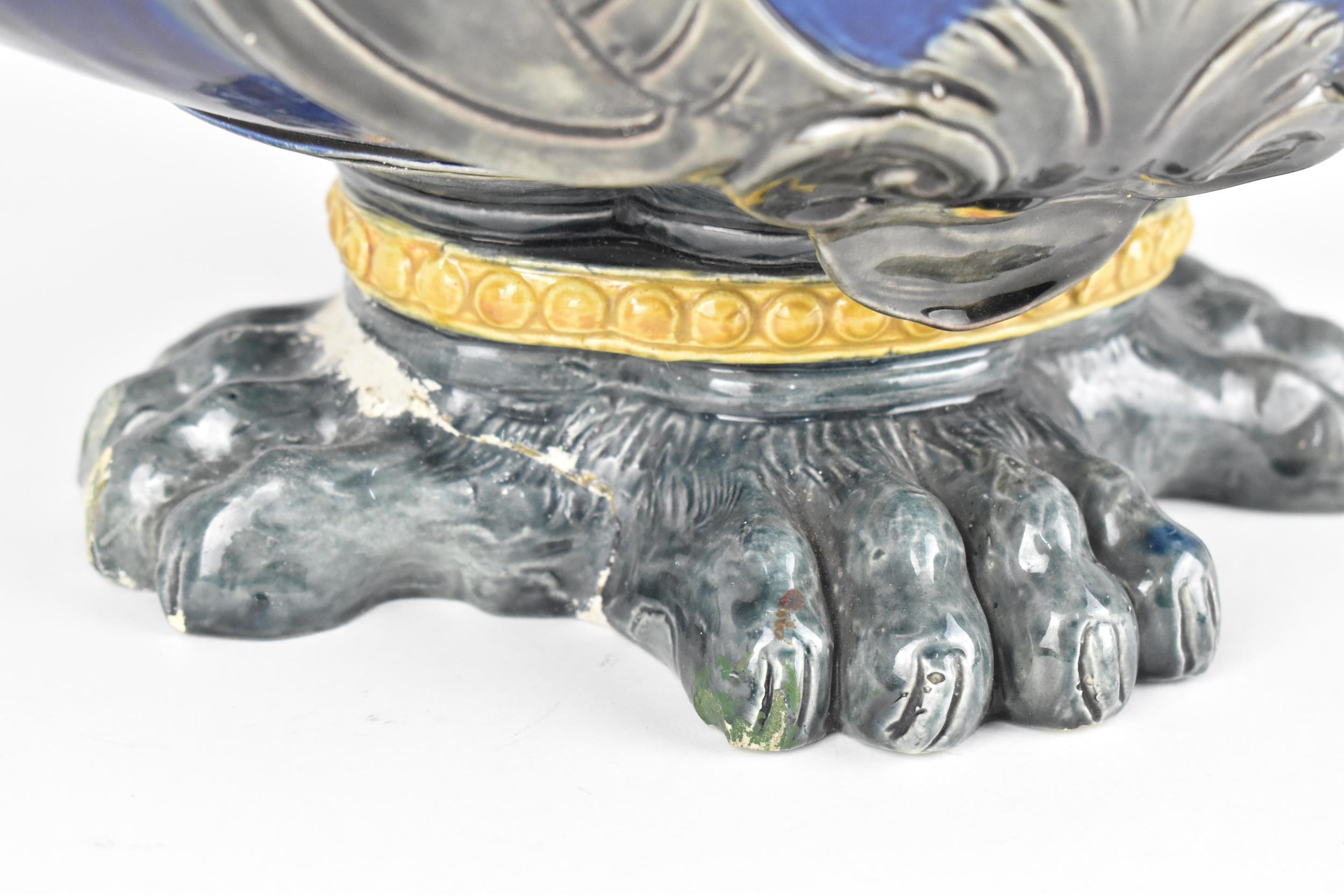 A Continental majolica jardiniere, possibly French, flanked with winged dragon handles, the oval body with cobalt blue ground and central cartouche with sunflower, supported on four paw feet, unmarked, 48.5 cm wide x 33 cm high