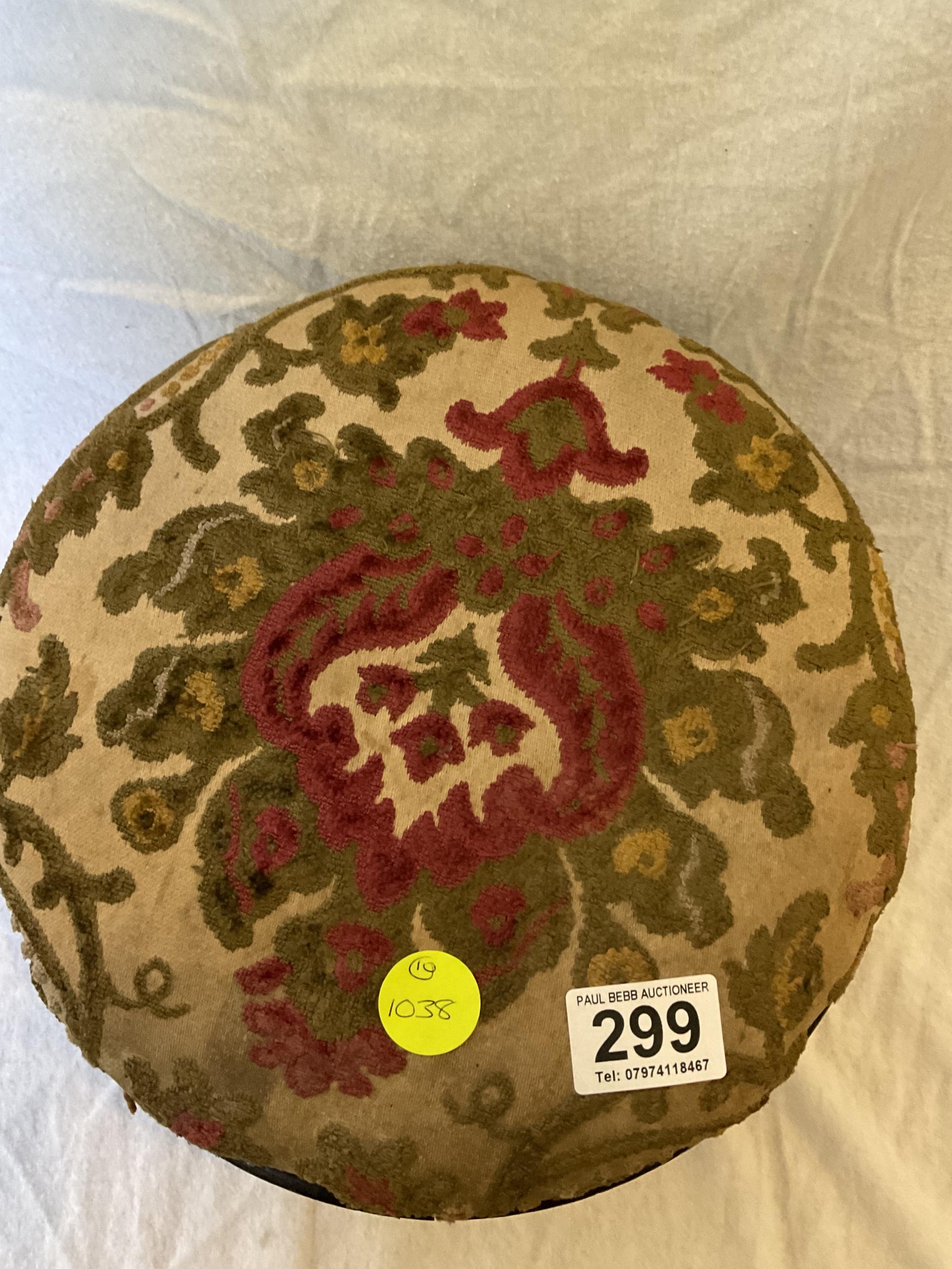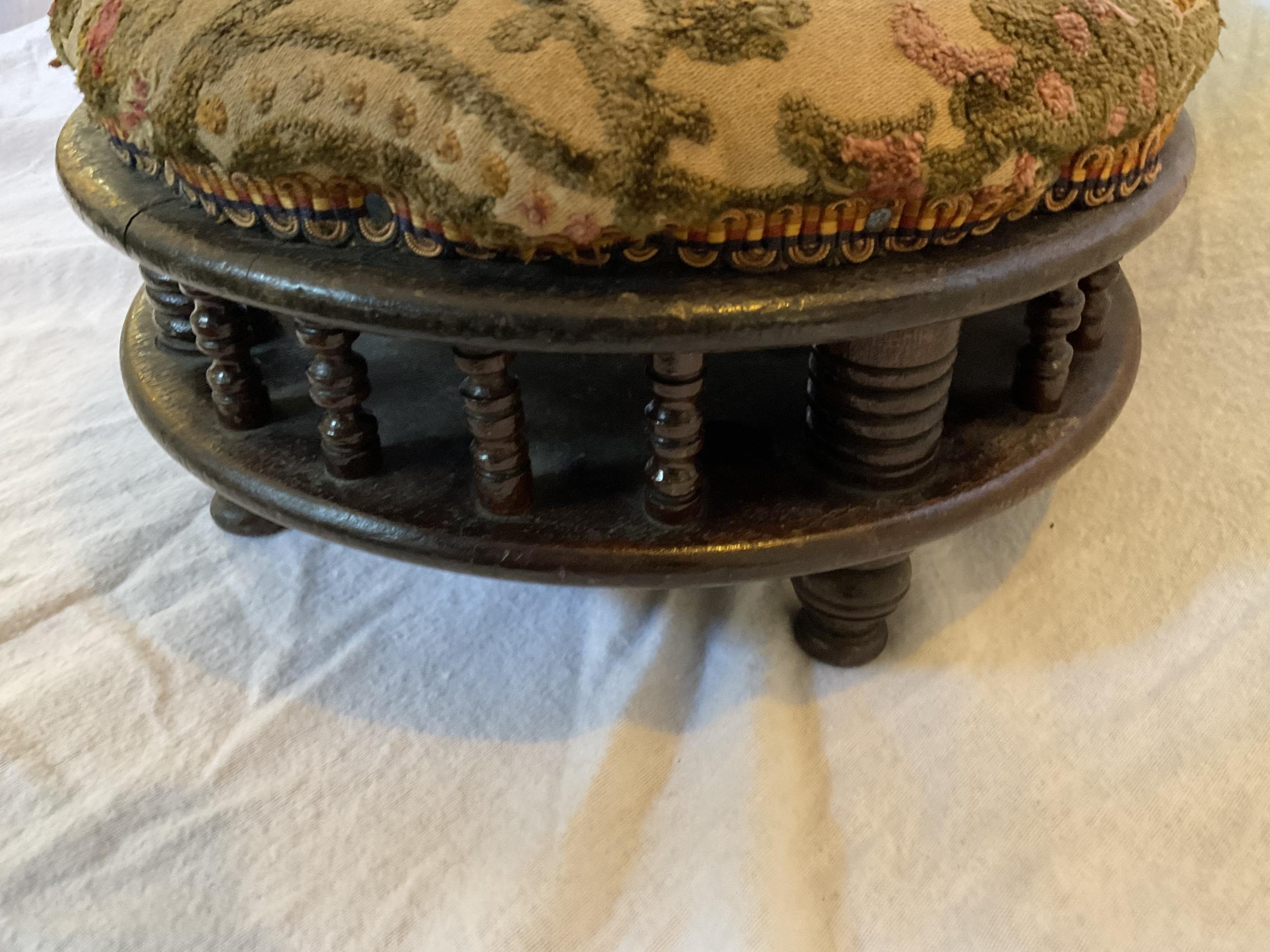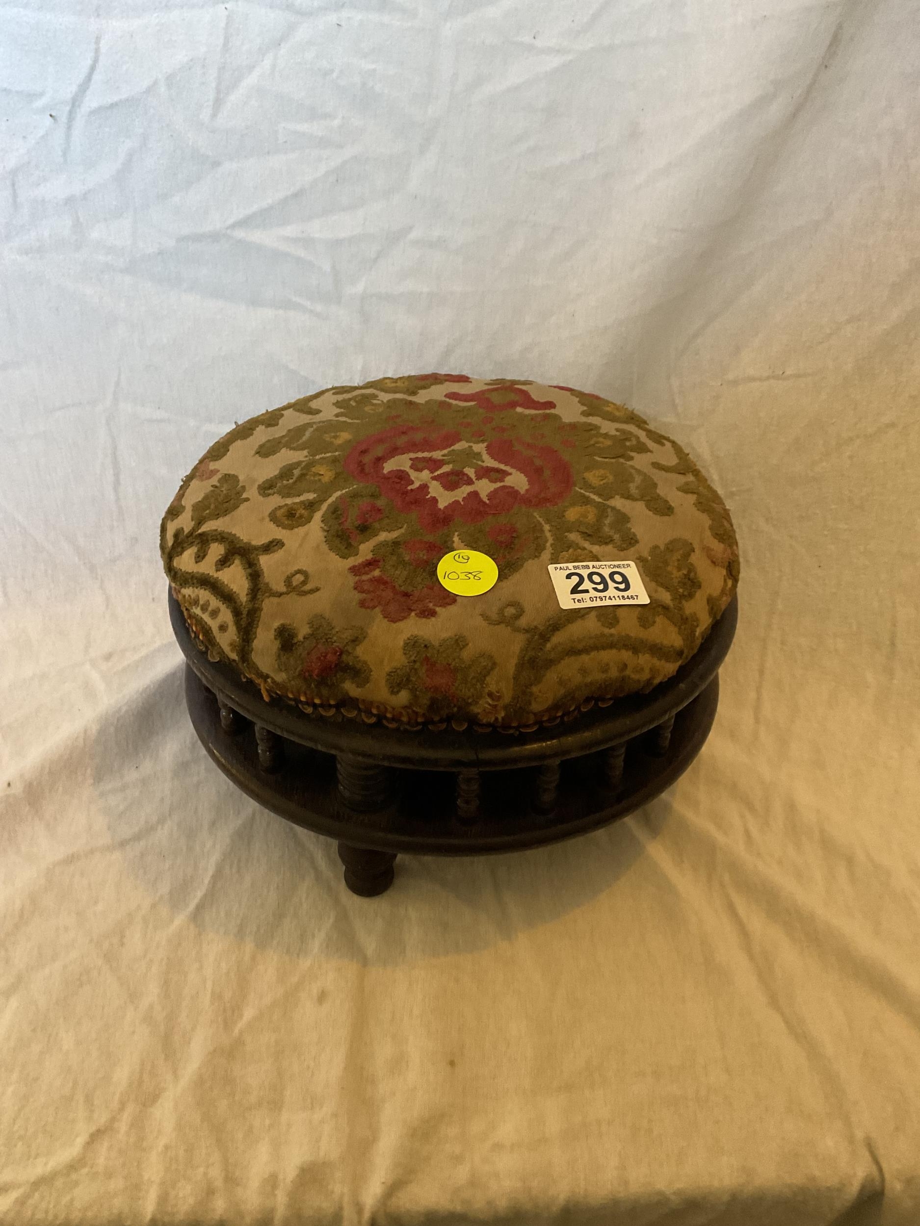 VICTORIAN UPHOLSTERED FOOT STOOL WITH SPINDLE DECORATION
