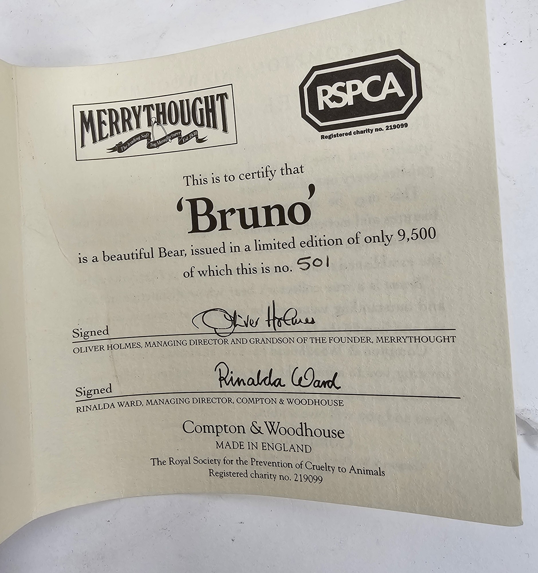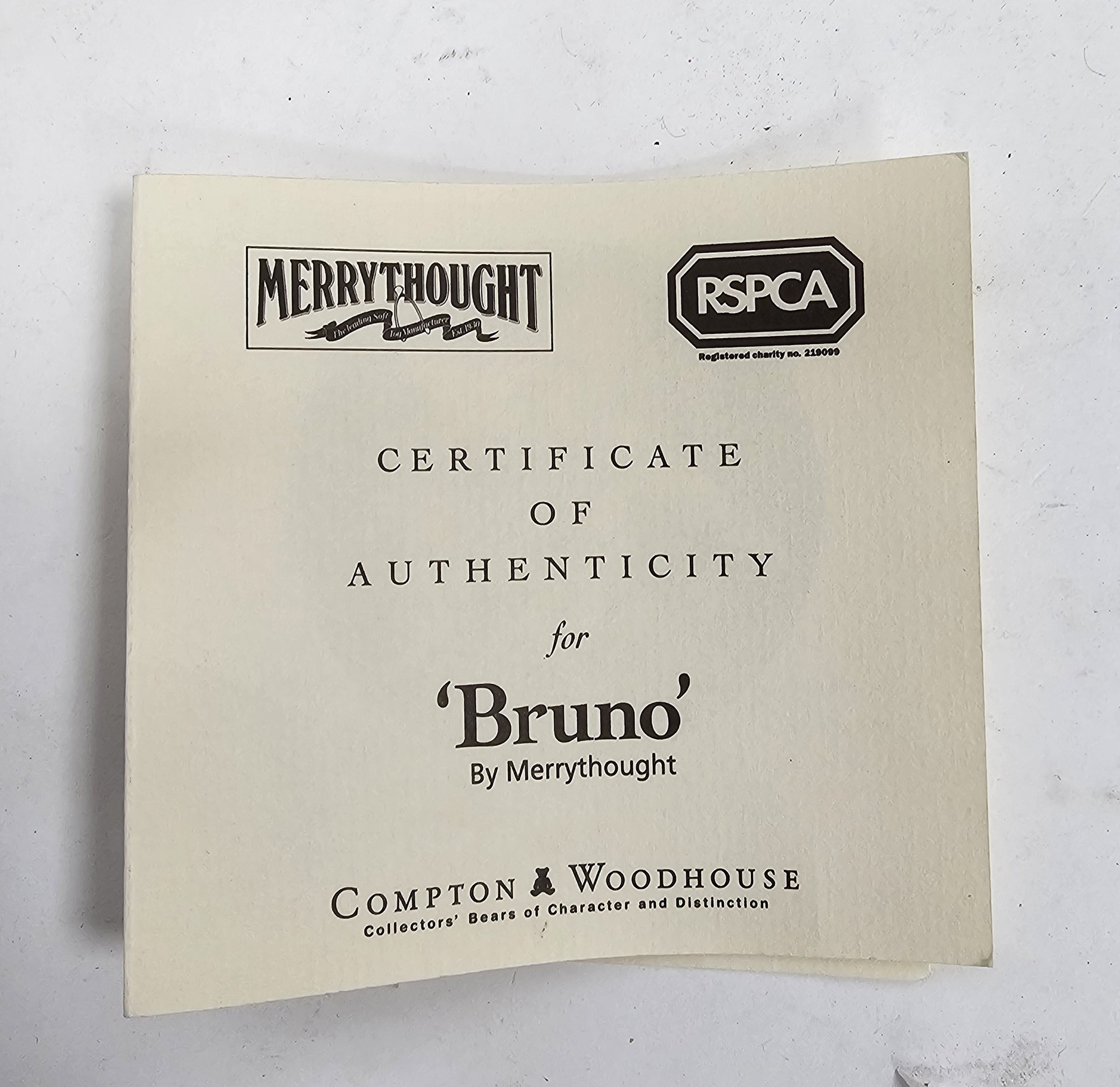 Merrythought ' Bruno The Official RSPCA Collectors teddy bear ' with his puppy on lead, limited edition no. 501 of 9500 with certificate of authenticity and original retail tags, 36cm high together with Hermann ' Advents Bar ' limited edition teddy bear no.084, with original tags, 37cm high and Cambrian ' Ambrose ' teddy bear by Barbara Daughtrey, 27cm high (3)