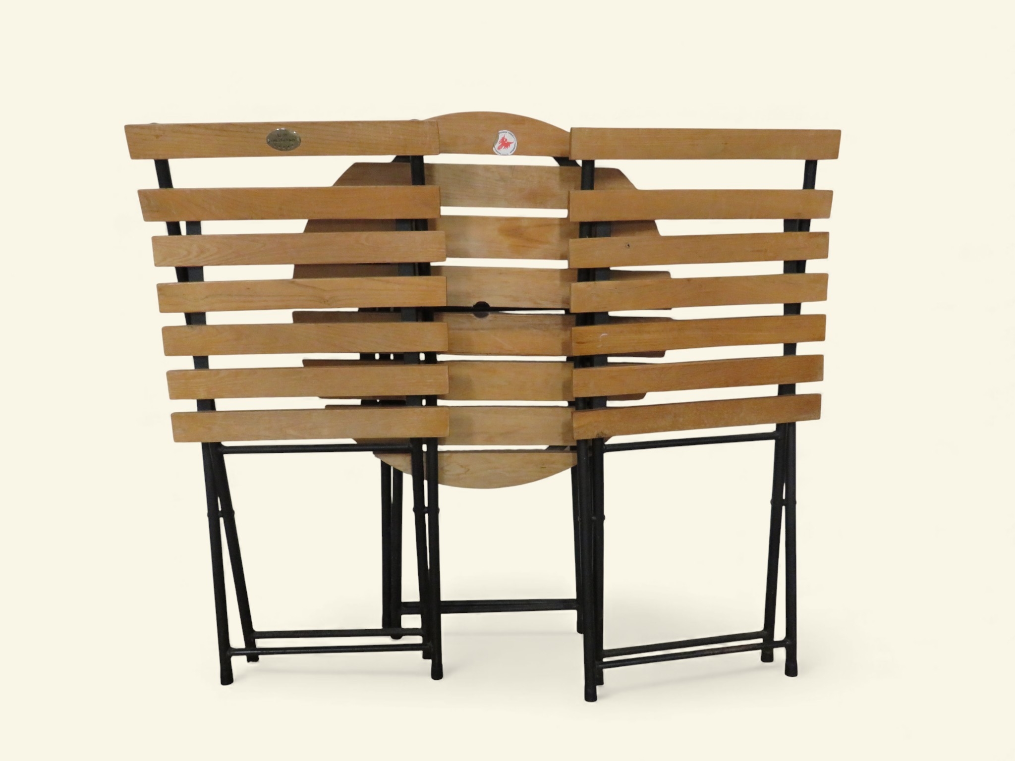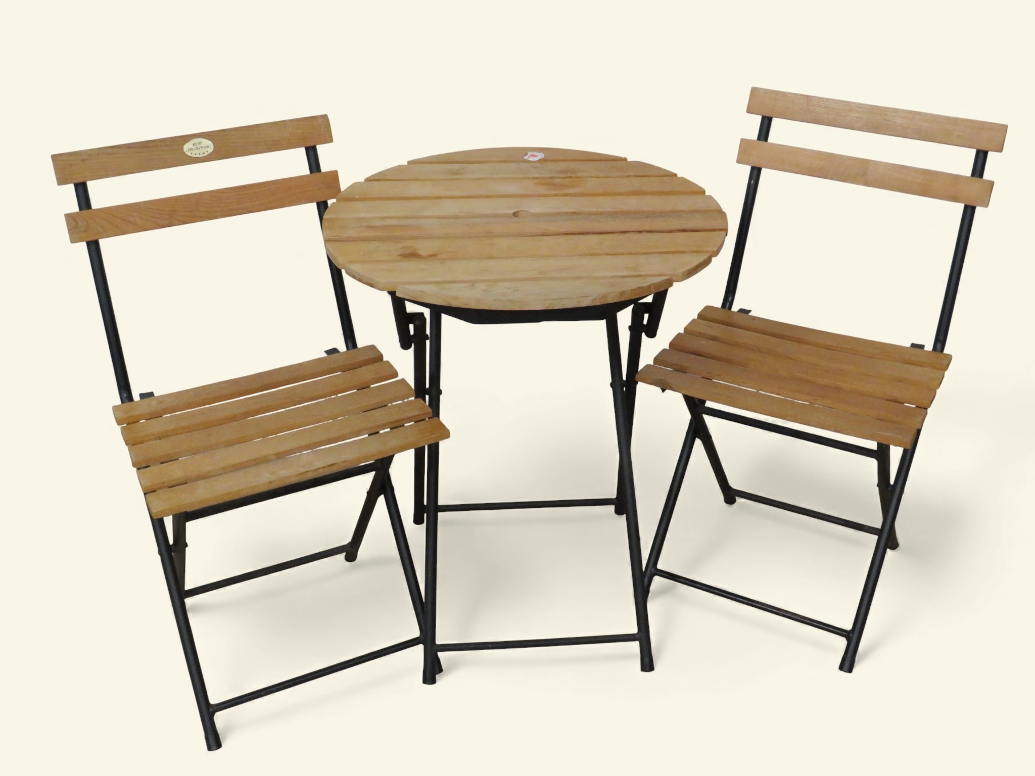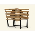 Folding bistro set with table and two chairs. Modern garden or patio furniture set comprising round slatted hardwood table with black metal folding base (approximately 27 inches diameter, 27 inches high) plus pair of matching folding chairs with horizontal slatted seats and backs on black metal frames (approximately 23 inches deep). Contemporary café-style outdoor furniture in natural wood finish, compact folding design suitable for balcony, patio, or small garden spaces.