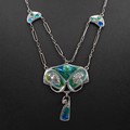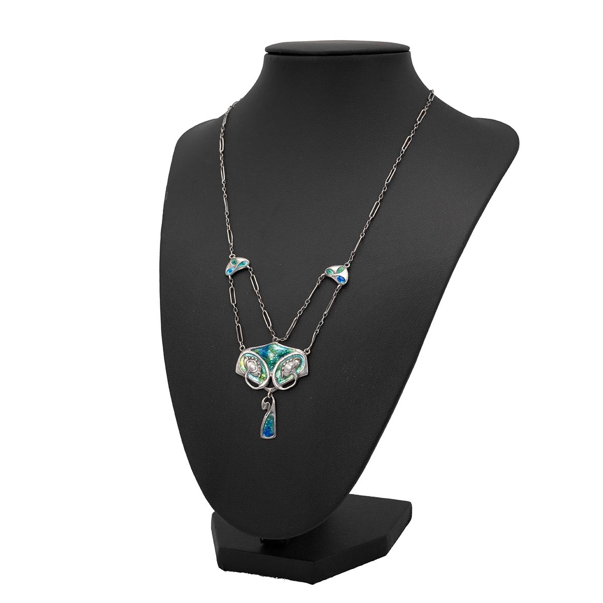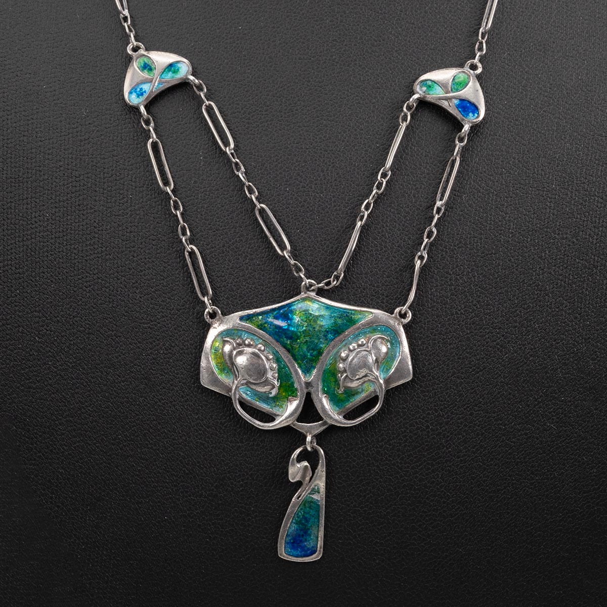 Murrle Bennett and Co., an Art Nouveau silver and enamel foliate necklace, to a link chain and bar clasp, maker's marks for Murrle Bennett and Co, stamped 950, marks worn, L45cm, 11.7 grams.