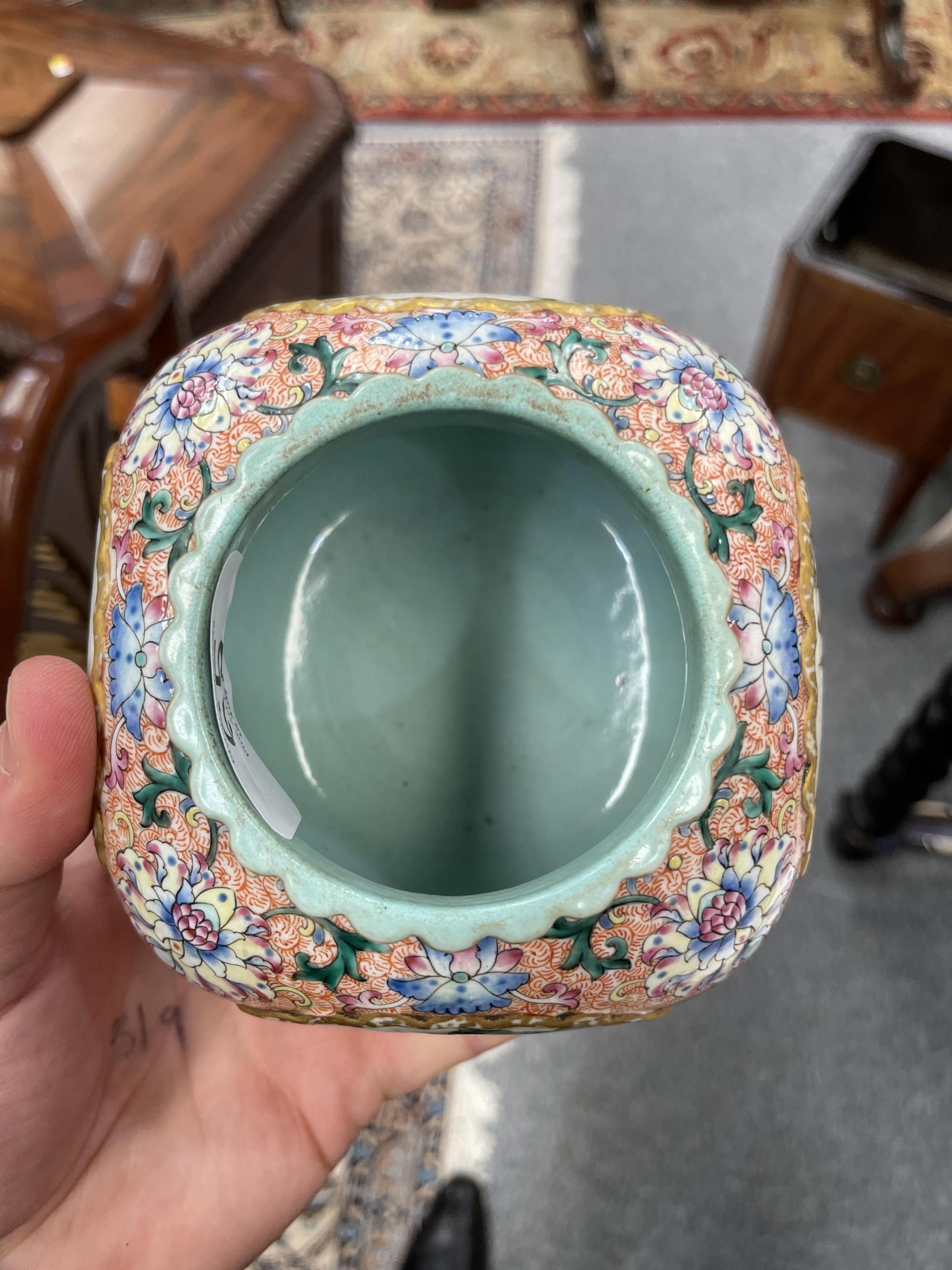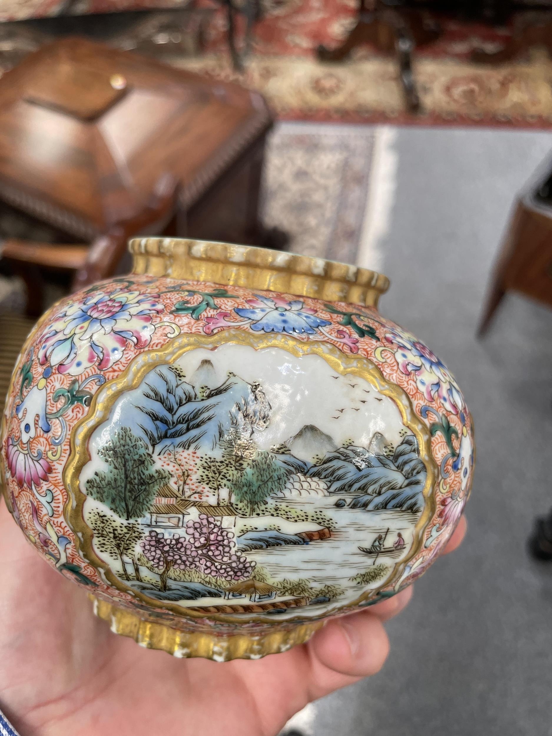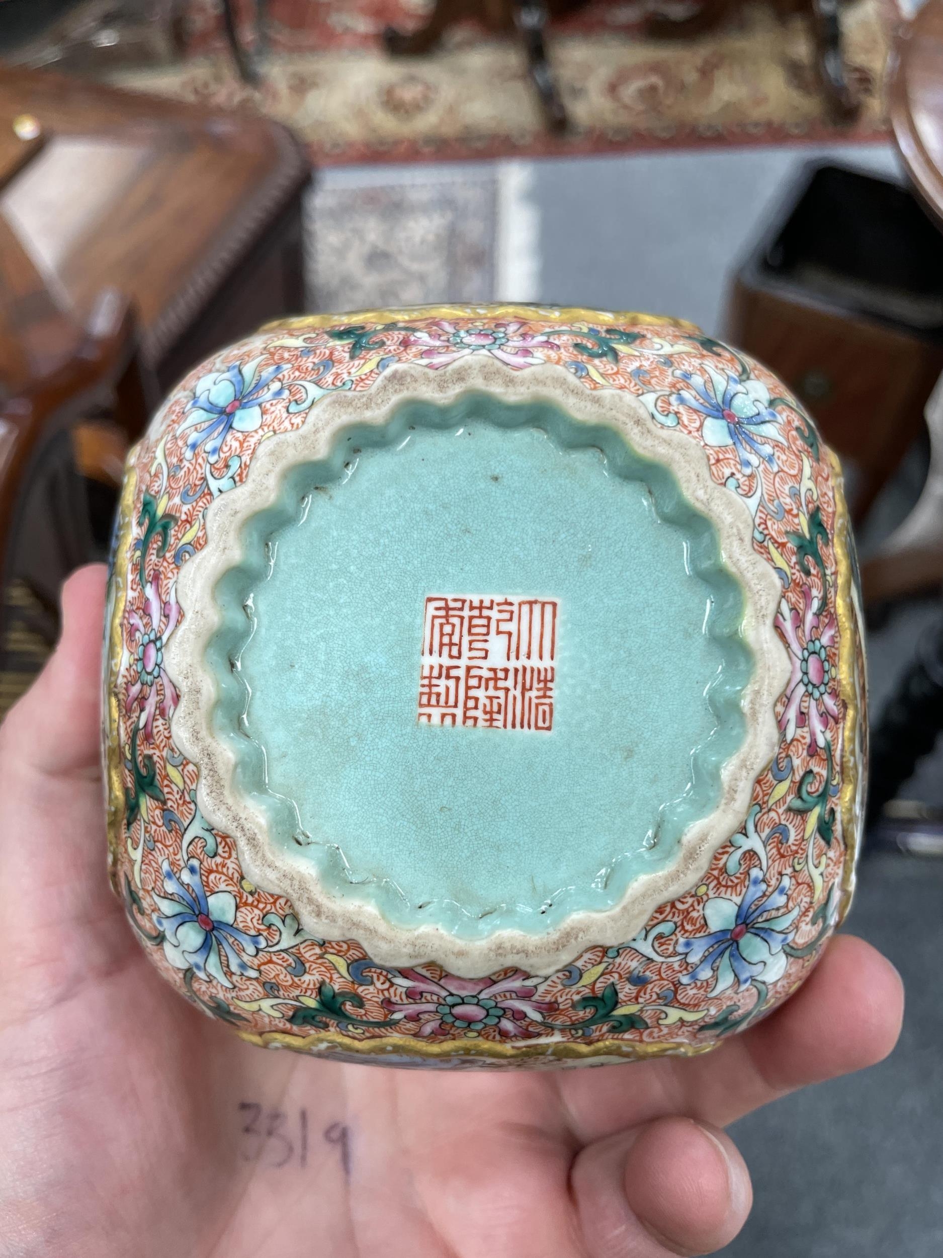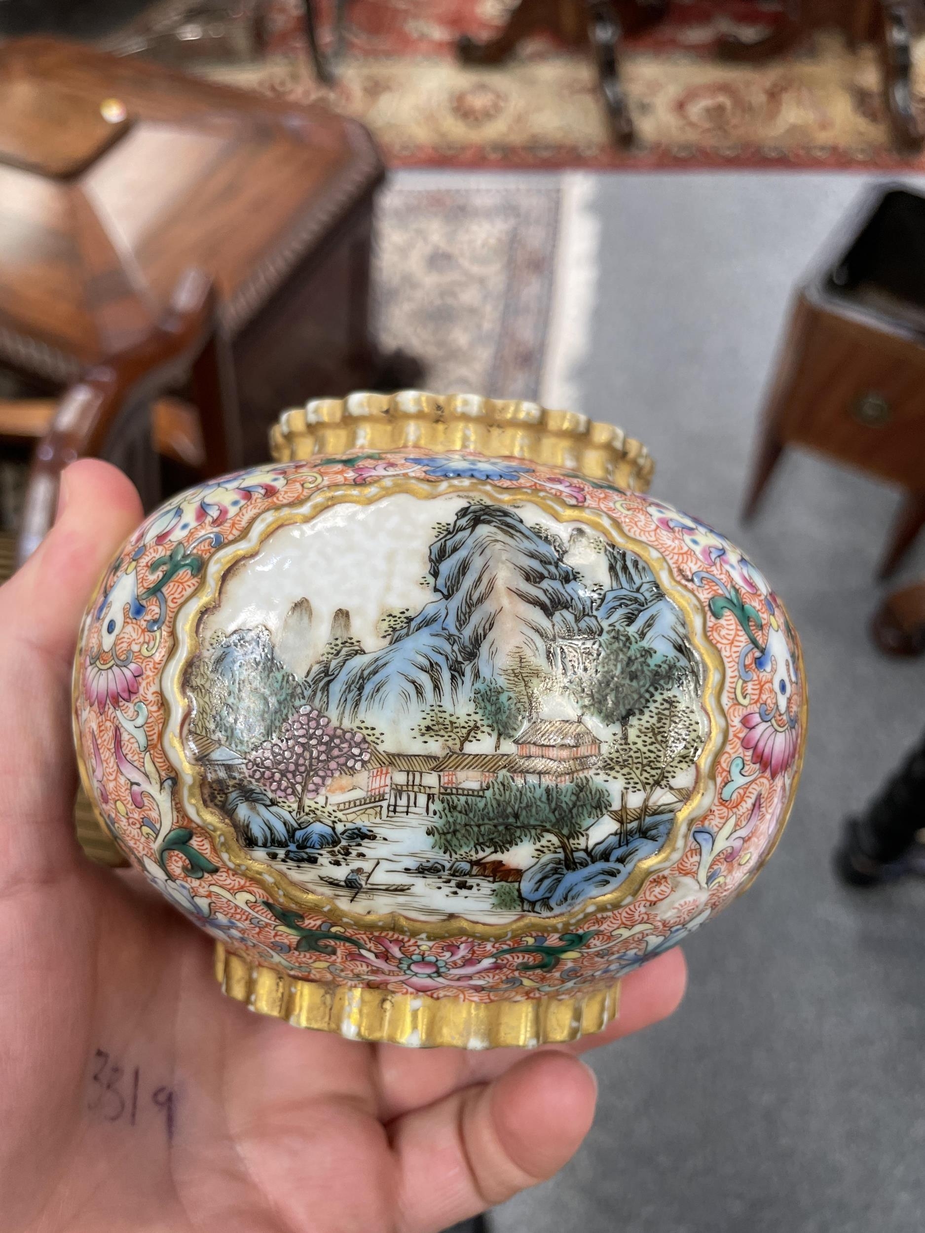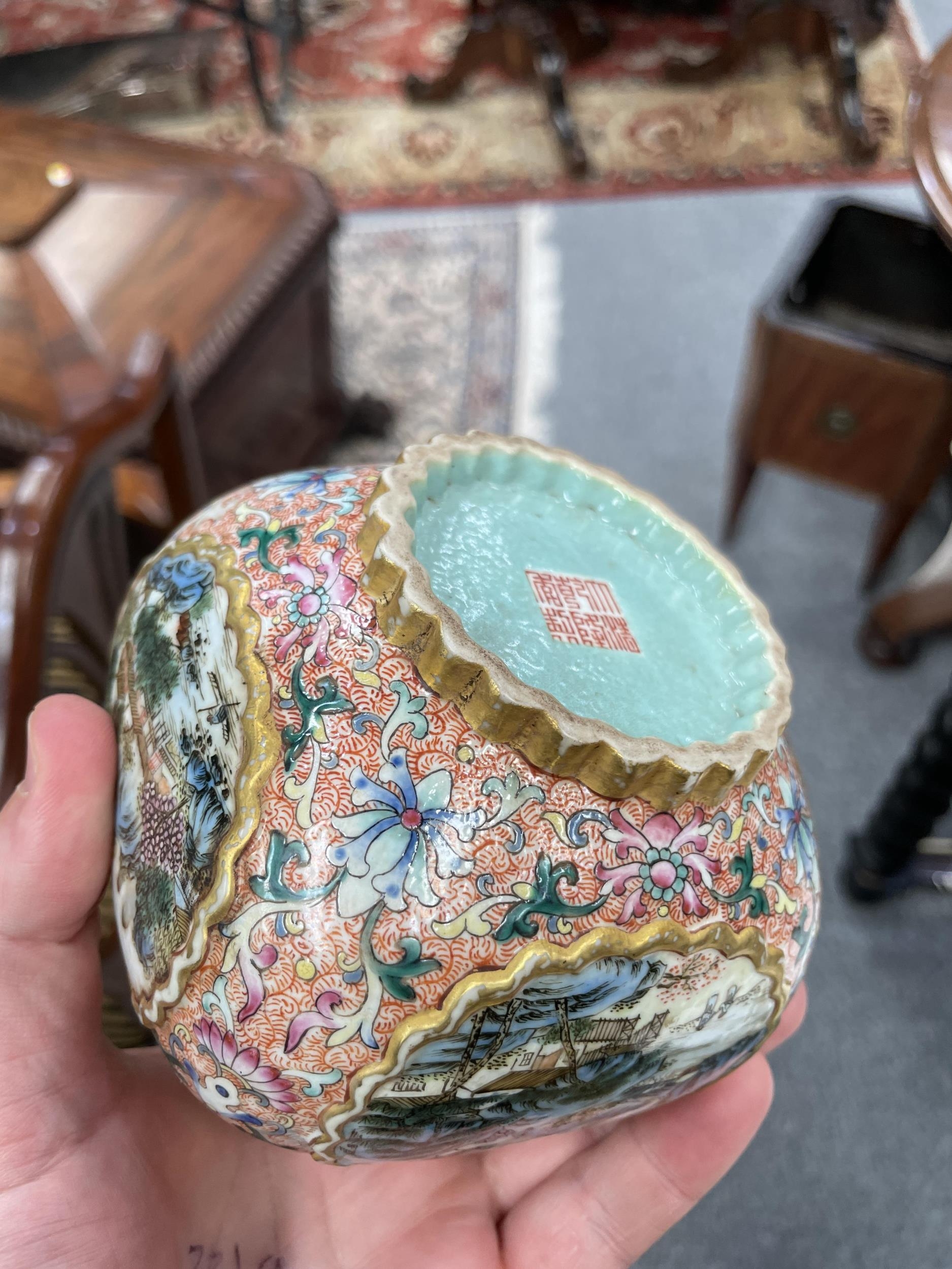 rounded and squat square form, each side with a reserve enamel painted with a landscape, within a moulded and gilded border, on a ground profusely painted with lotus flowers and foliage, bears iron-red seal-type mark. 9.4cm high