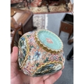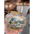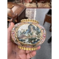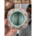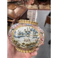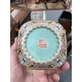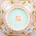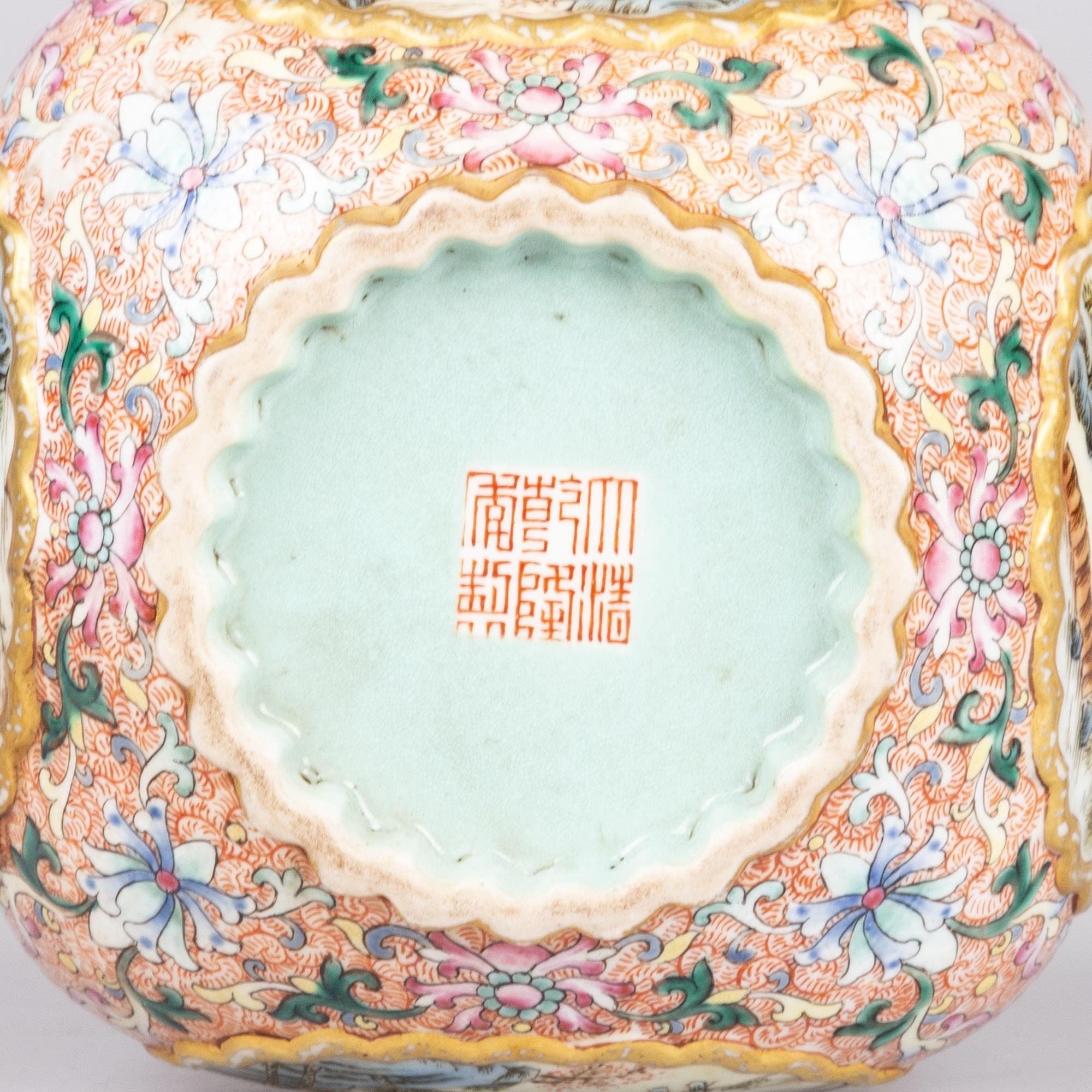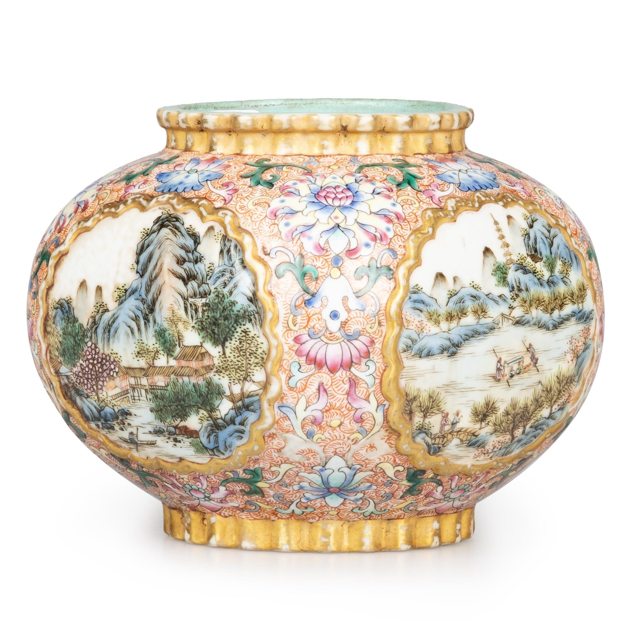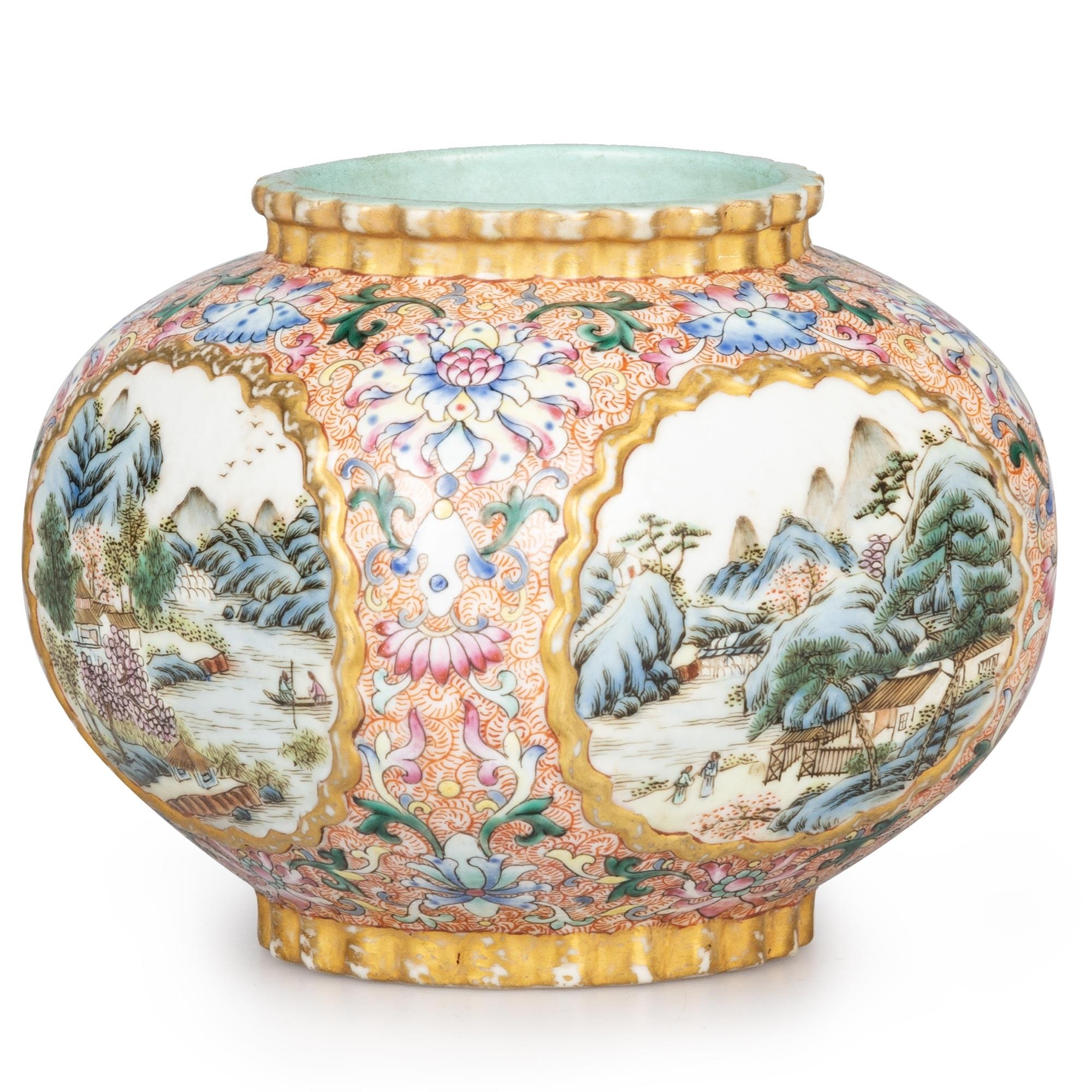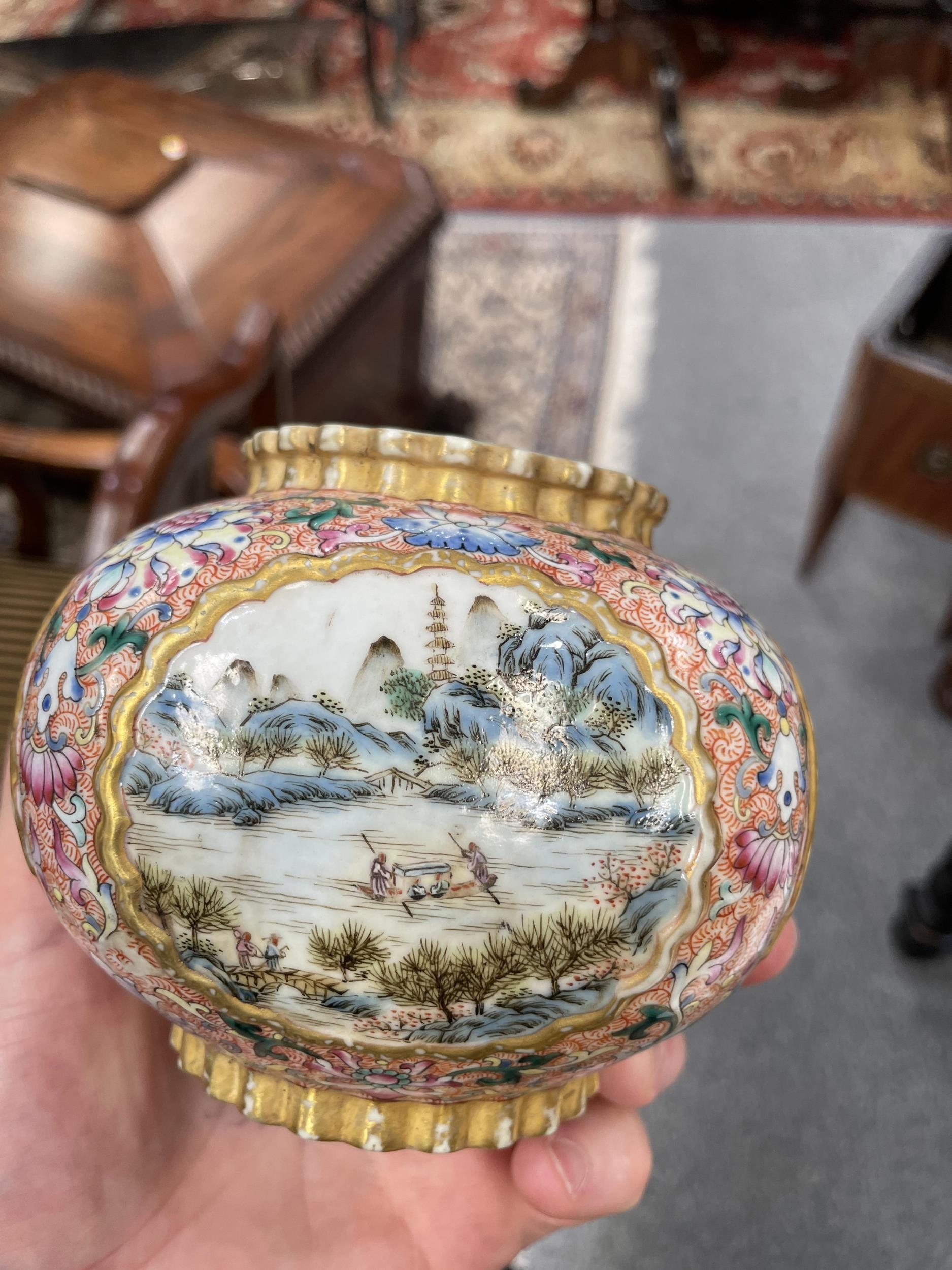 rounded and squat square form, each side with a reserve enamel painted with a landscape, within a moulded and gilded border, on a ground profusely painted with lotus flowers and foliage, bears iron-red seal-type mark. 9.4cm high