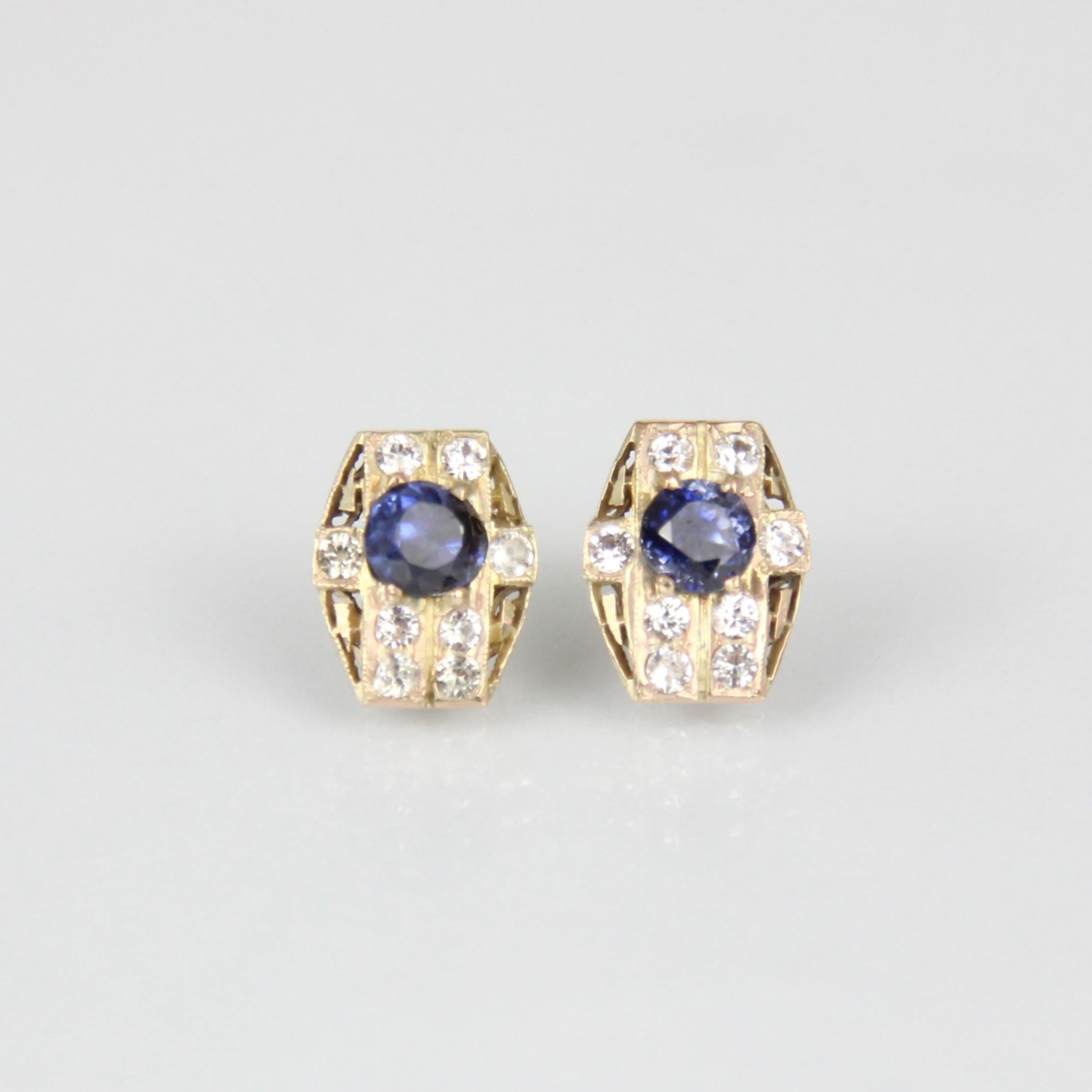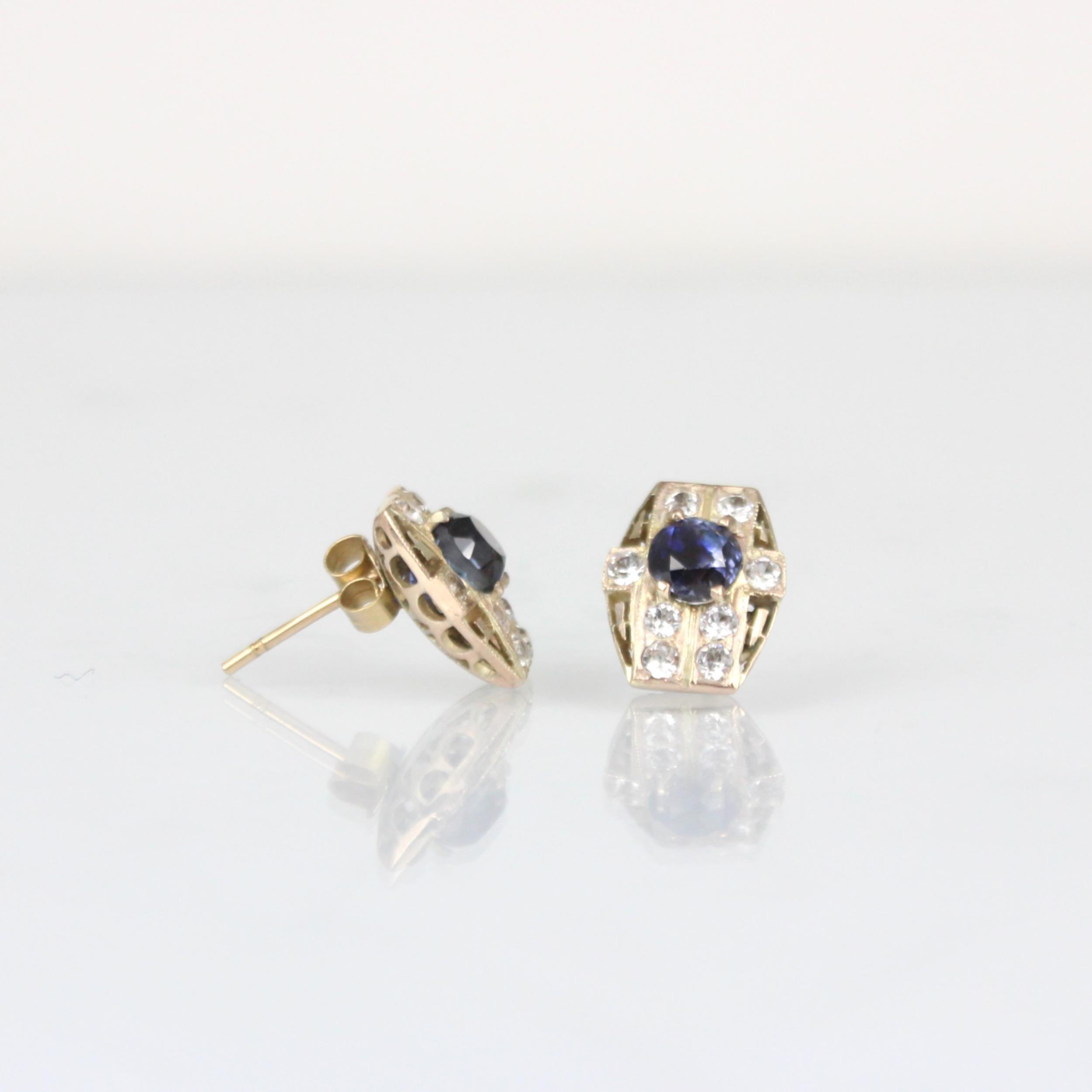 A pair of Art Deco style untested sapphire earrings, the central round cut untested sapphire within surround of eight round cut white sapphires, within shaped white metal mount with milgrain setting edge, with post and butterfly fittings, unmarked, 2gms