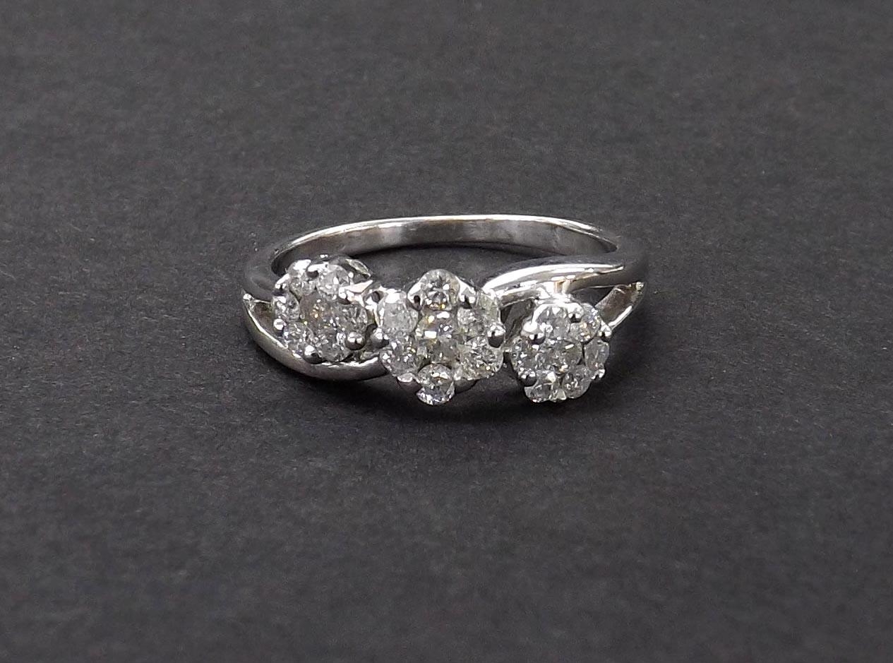 White gold diamond three cluster ring, round brilliant-cuts, 2.6gm, ring size L