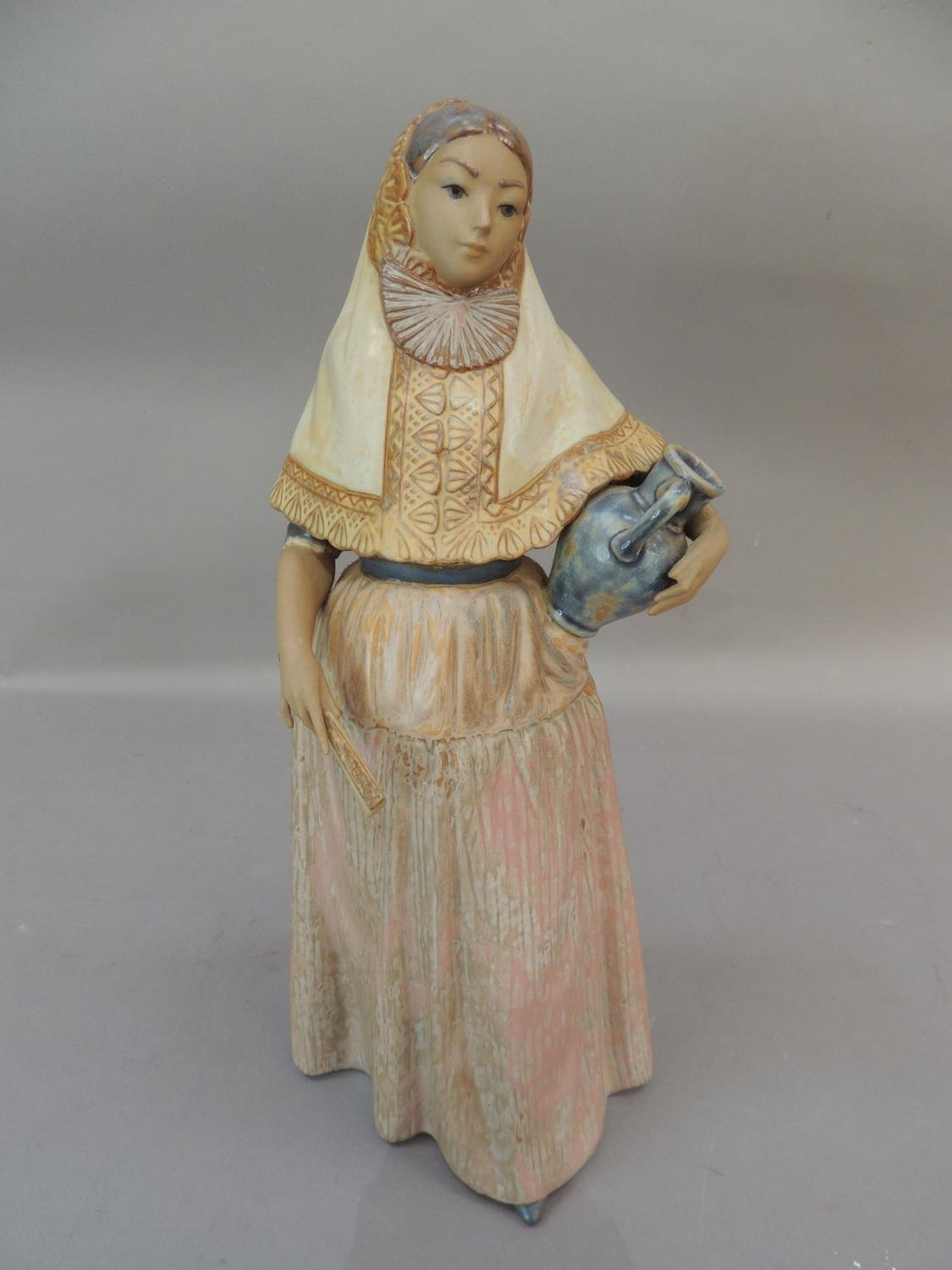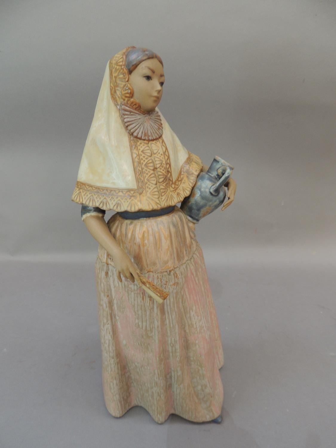 A lladro figure of a young Spanish girl holding a picture beneath her left arm, a fan in her right hand, 35cm high, printed mark in blue