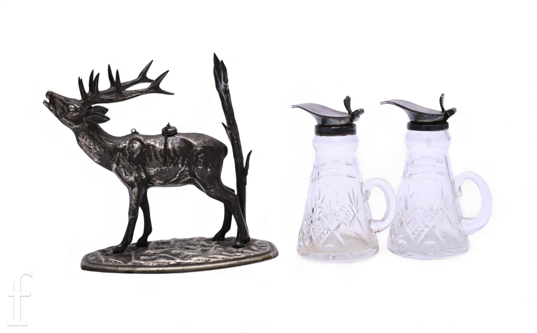 A pair of silver mounted cut glass whiskey noggins, Camelot Silverware Ltd, Sheffield 1992, of conical form with diamond and mitre cut bands, height 11cm, and an early 20th Century silver plated novelty brandy glass warmer modelled as a baying stag on oval naturalistic, height 14cm. (3)