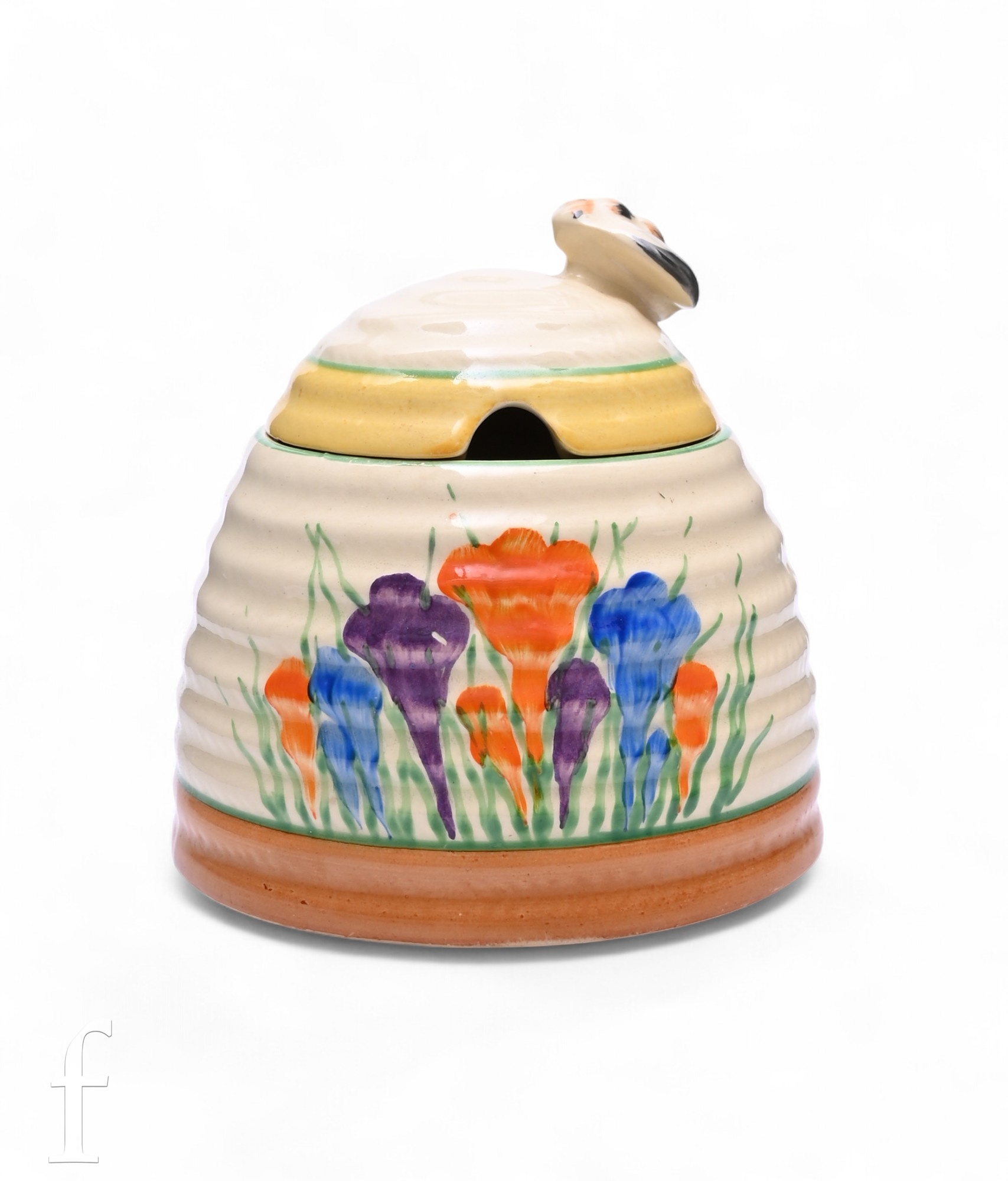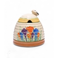 A Clarice Cliff Crocus Bee Hive honey pot circa 1936, hand painted with Crocus sprays with green, yellow and brown banding, green script mark, height 10cm, slight damage.