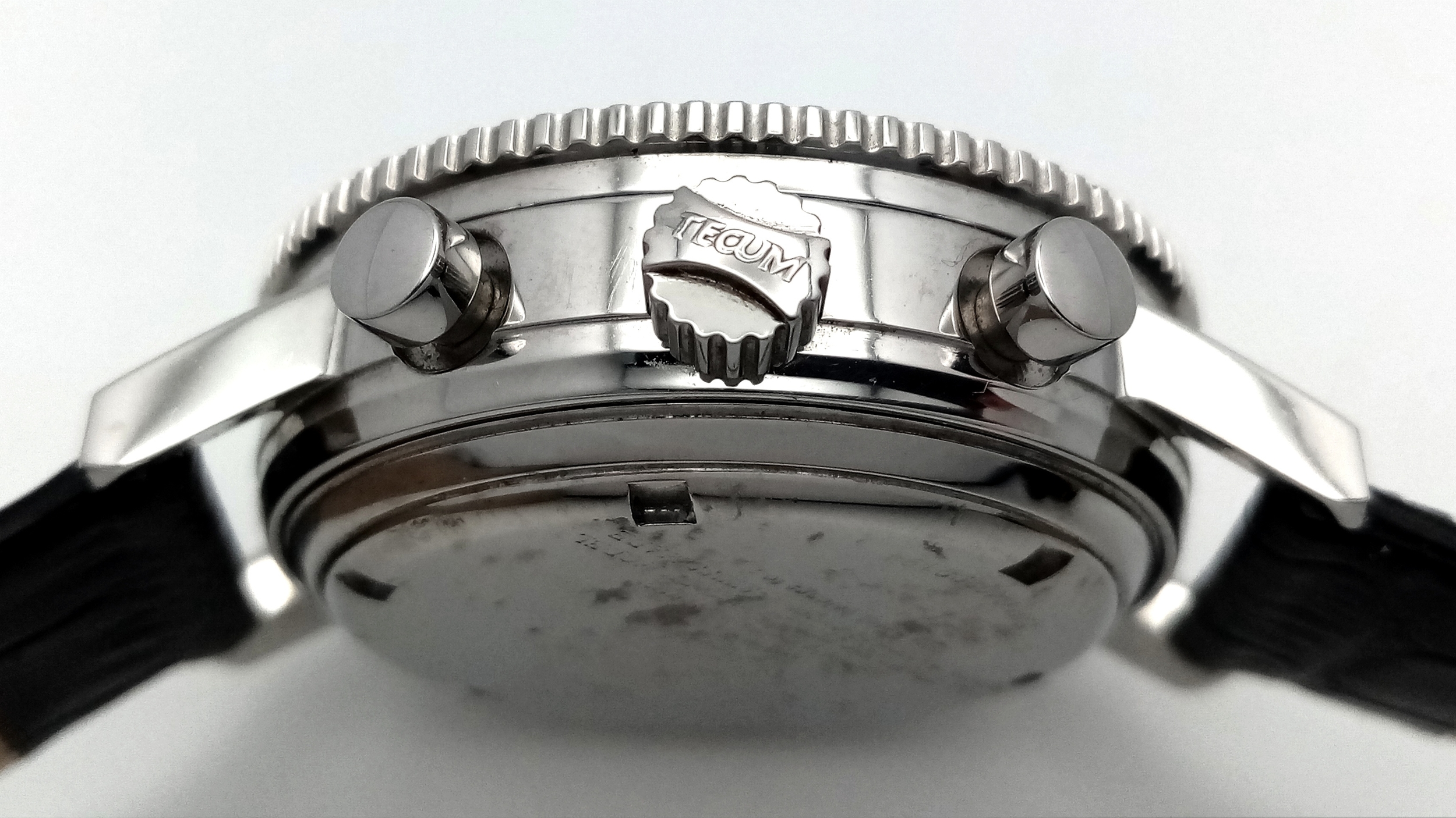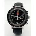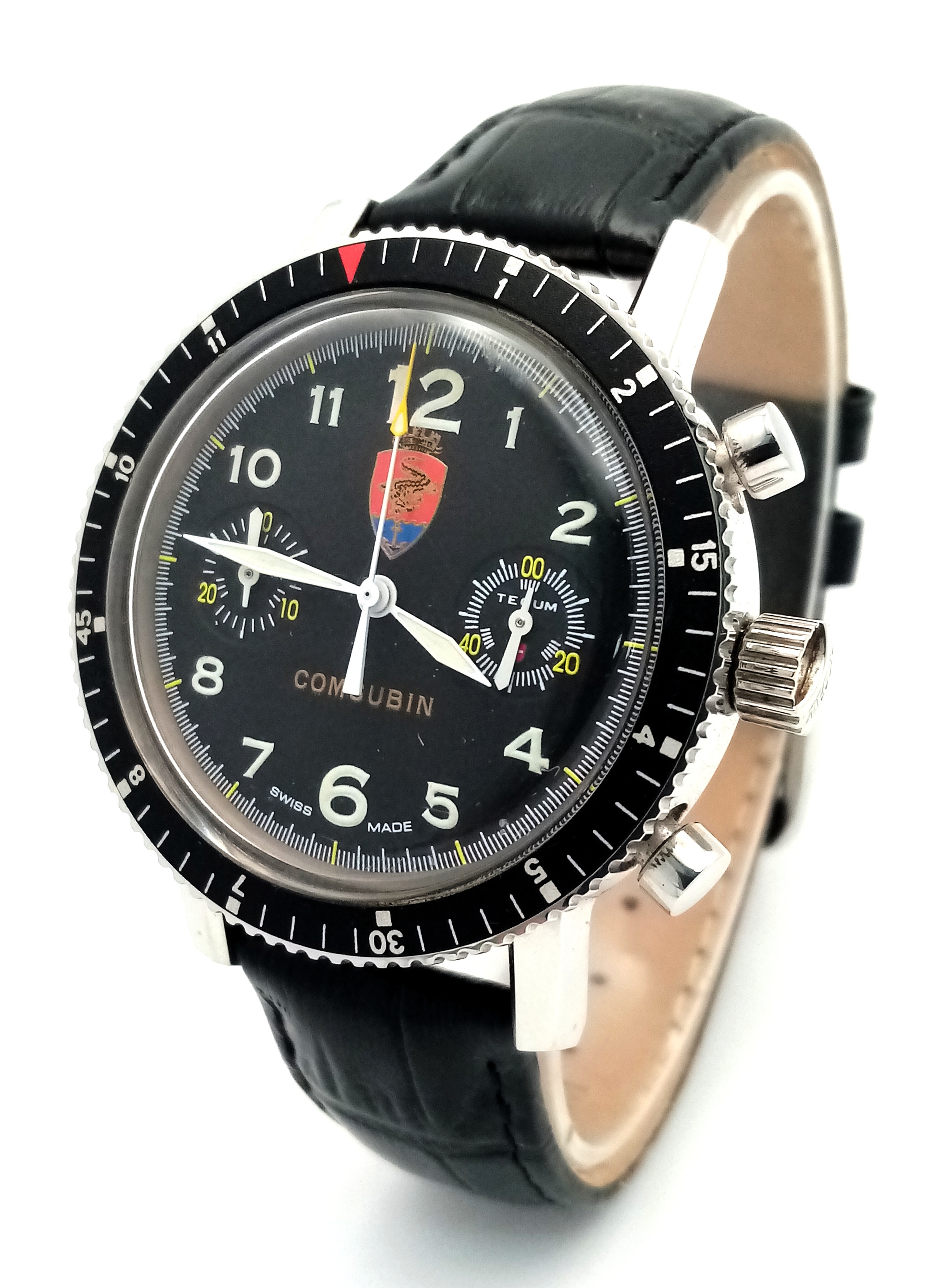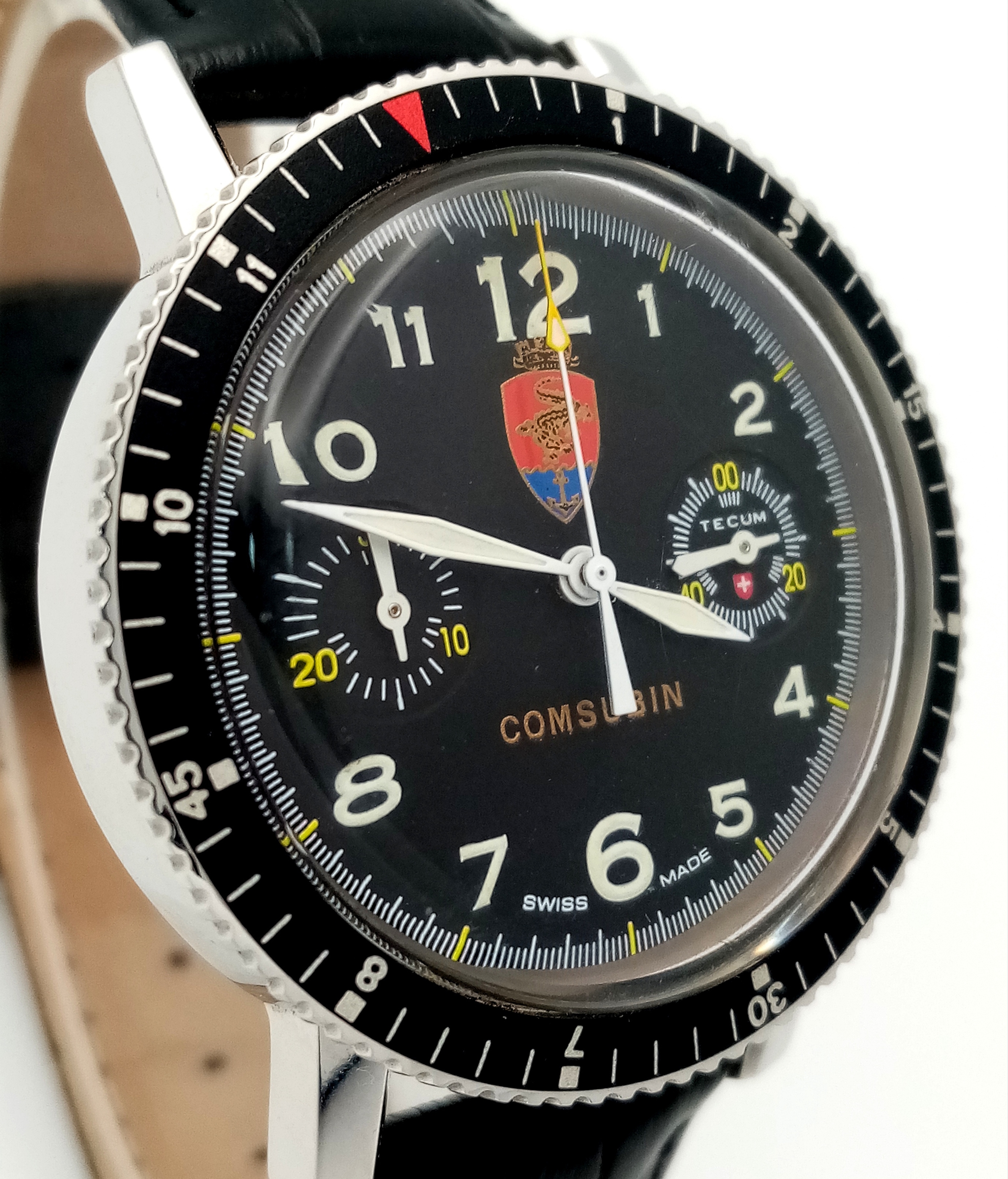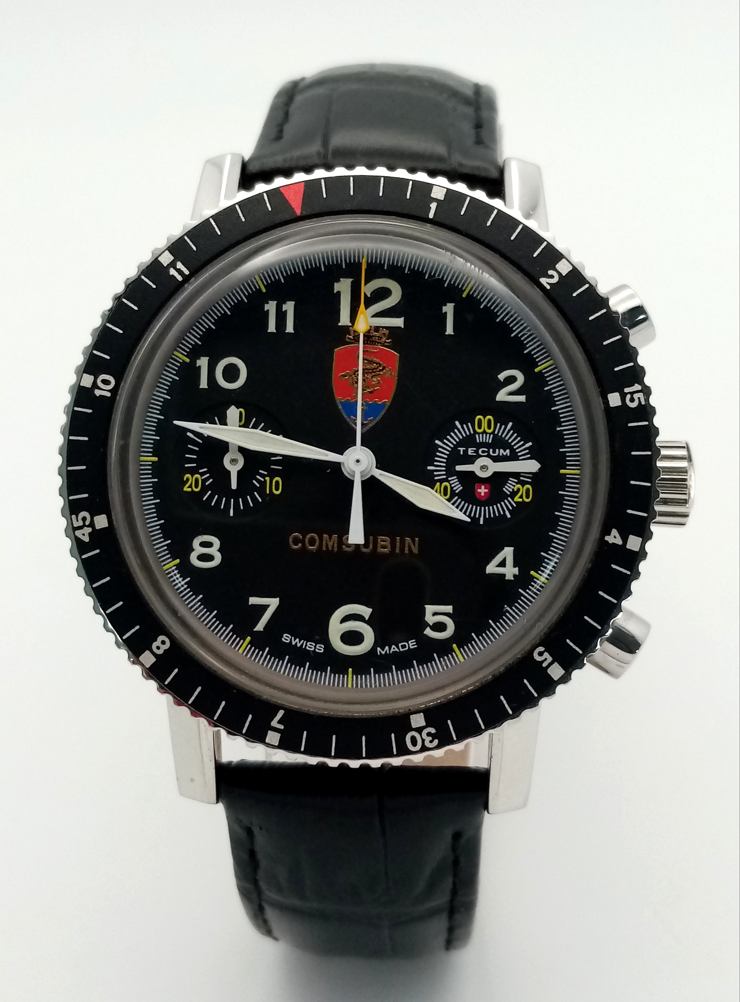 A Tecum Chronograph Automatic Divers Watch. Comsubin for the Italian military elite divers unit. Black leather strap. Stainless steel case - 39mm. Black dial with two sub dials. Rotating bezel. In working order.