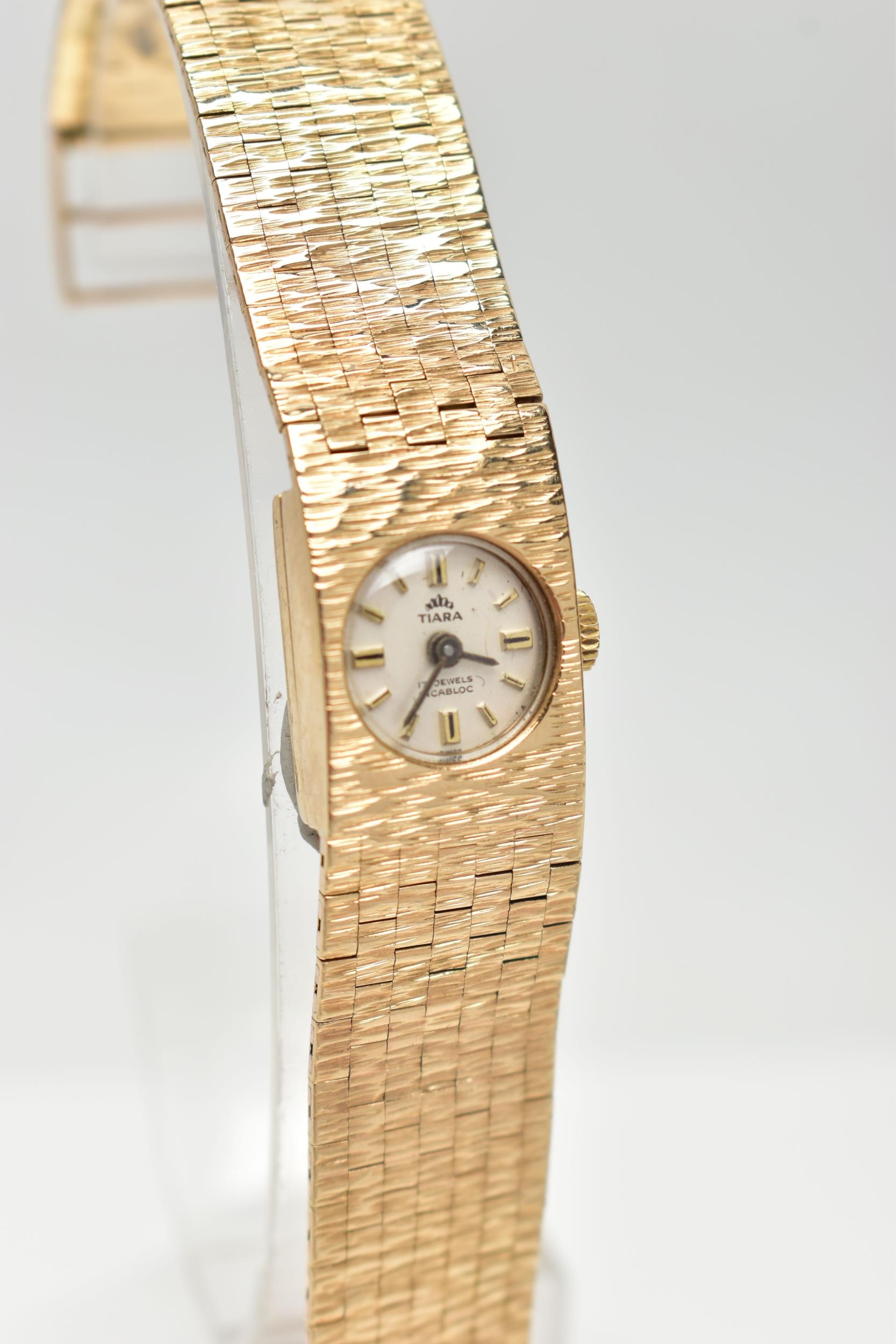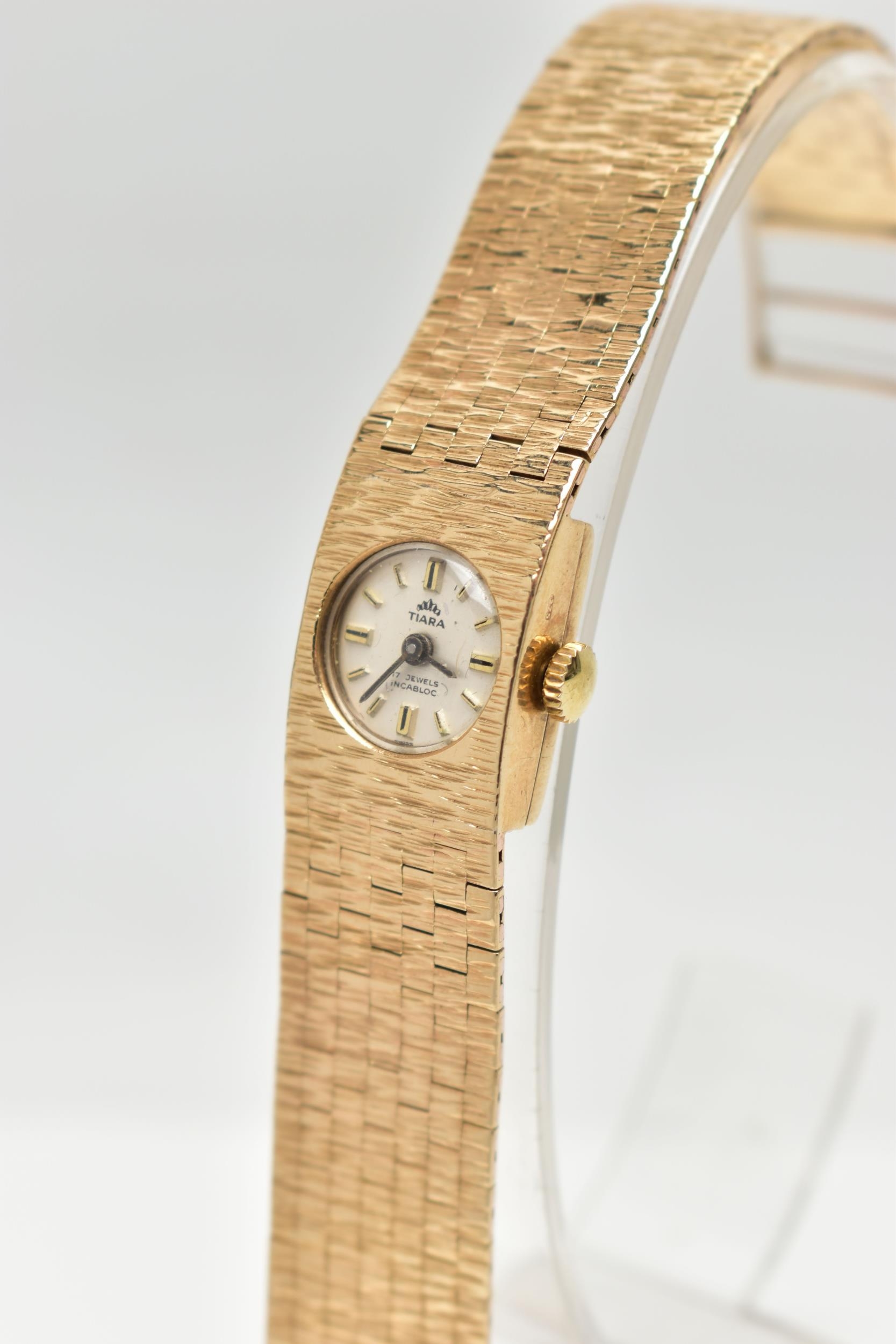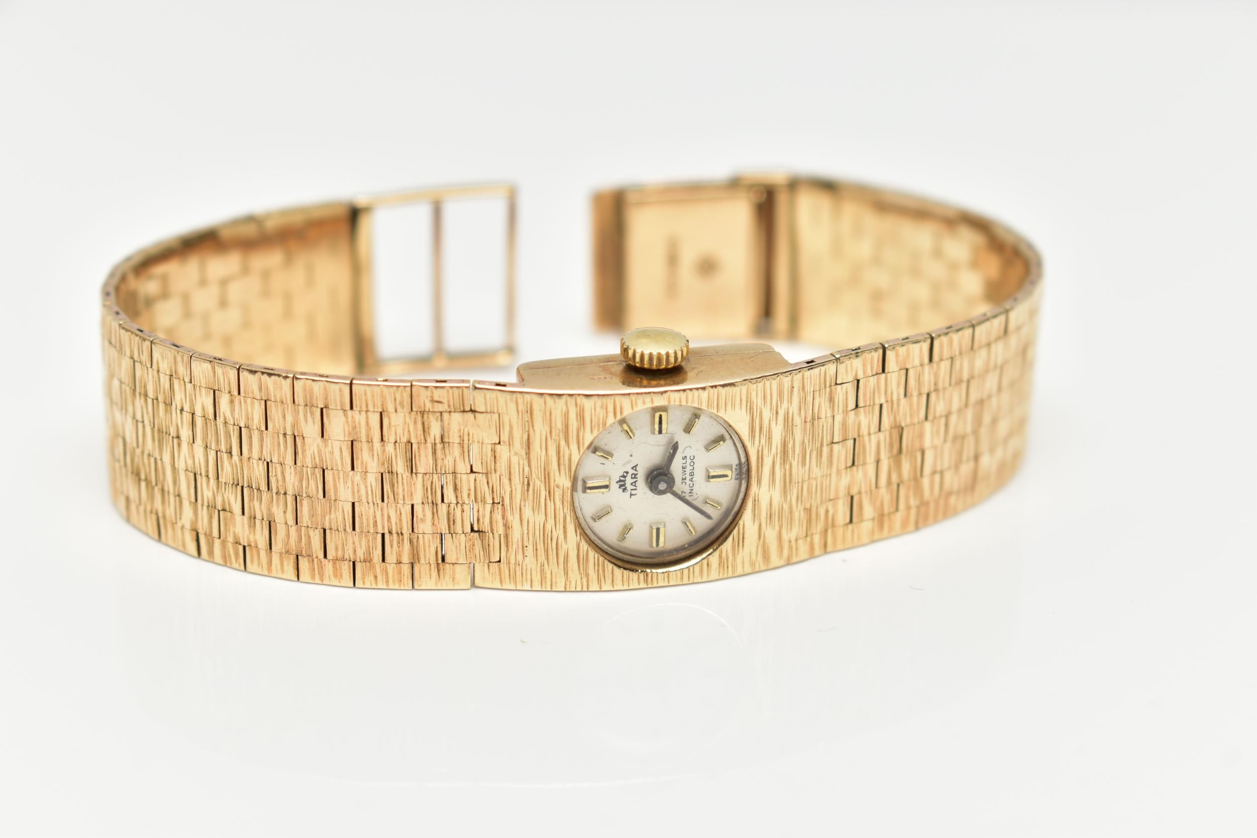 A LADY'S 9CT GOLD 'TIARA' WRISTWATCH, manual wind, round silver dial signed 'Tiara, 17 jewels Incabloc', baton markers, black hands, within a bark effect case, polished case back, inside case back hallmarked 9ct London 1971, fitted with a bark effect articulated bracelet with folding clasp, hallmarked 9ct London 1972, length 165mm, approximate gross weight excluding movement 30.2 grams (condition report: watch winds, sets and runs at time of cataloguing, although time keeping is untested, general light wear, clasp in working condition)