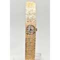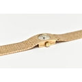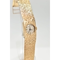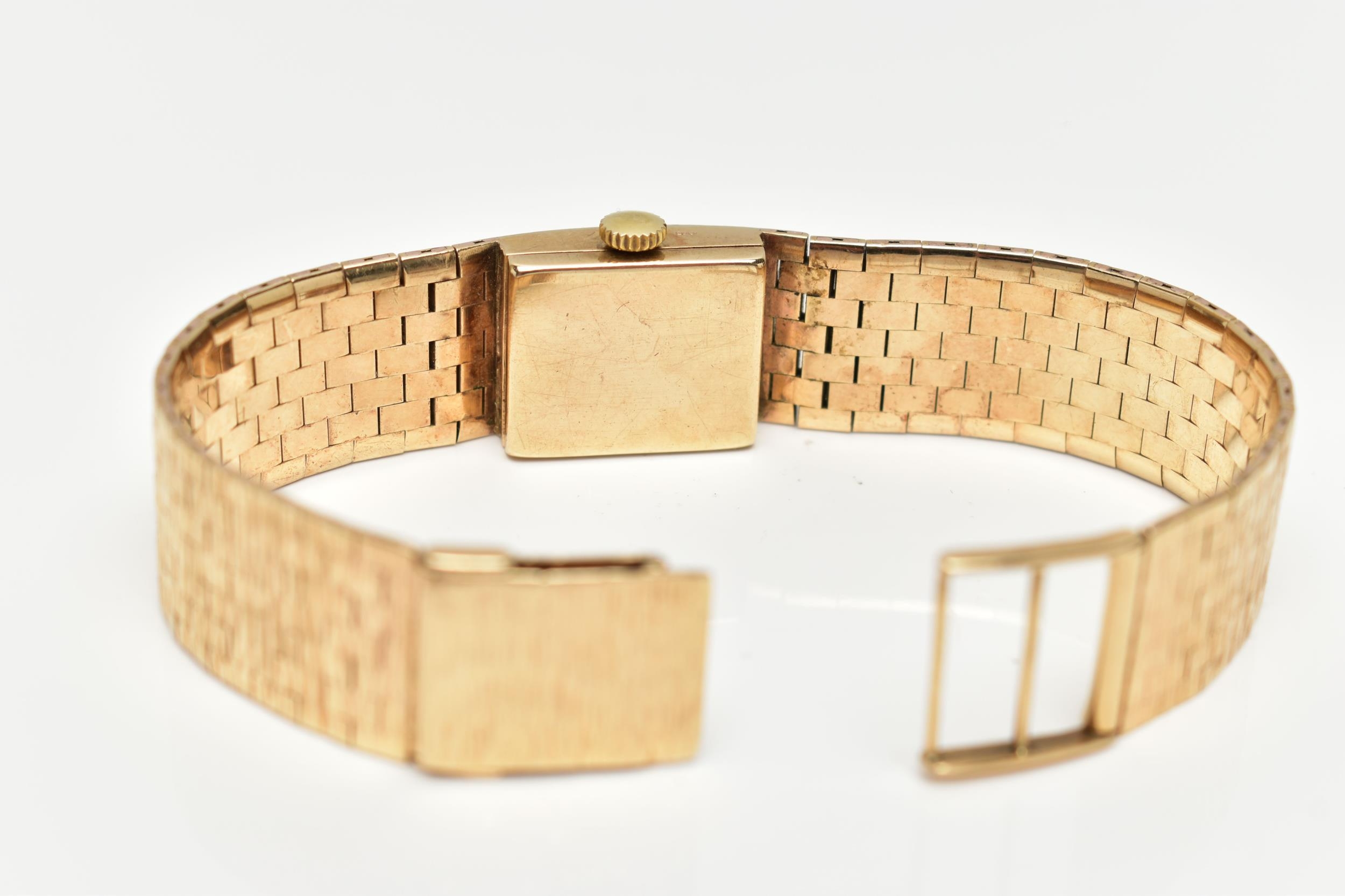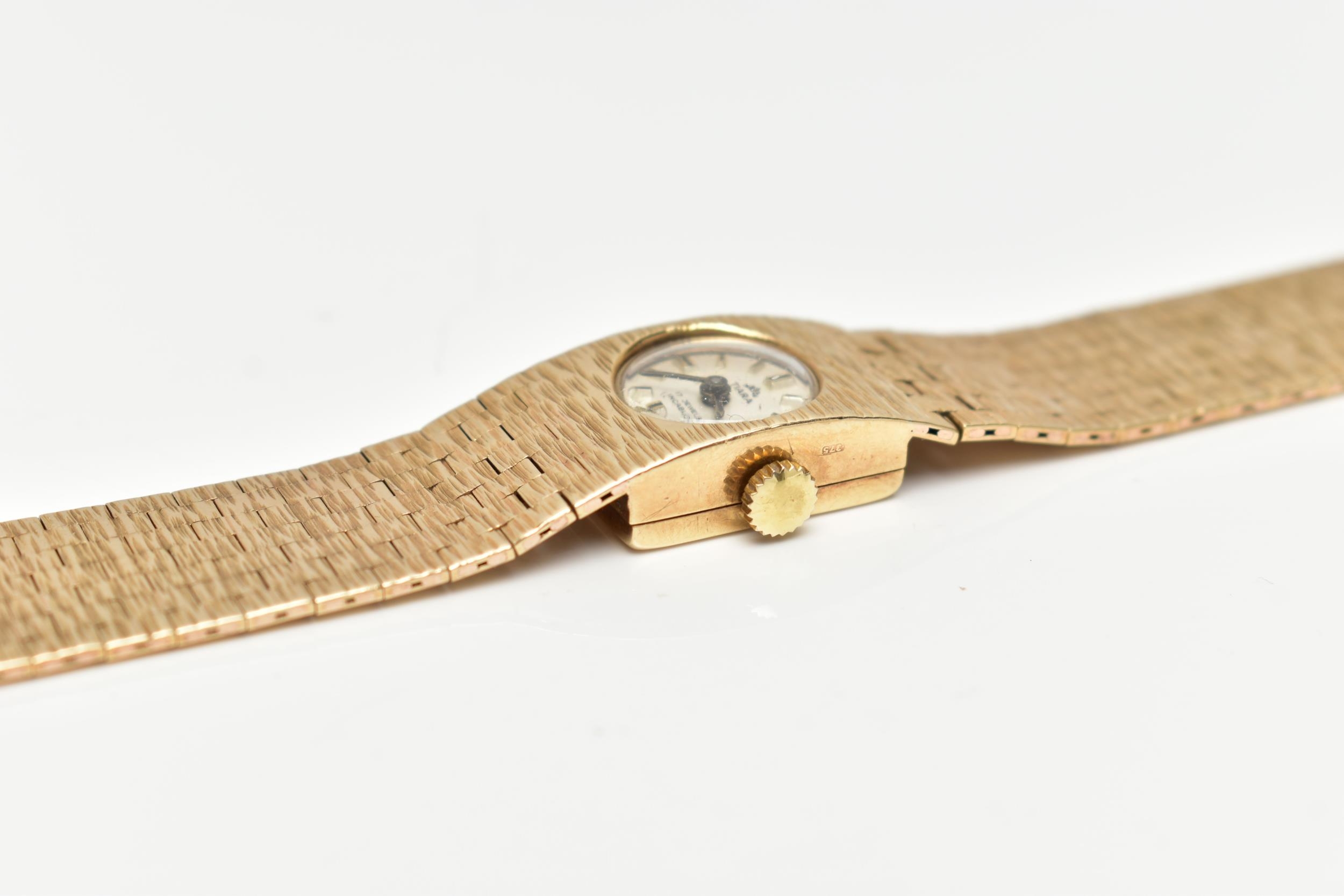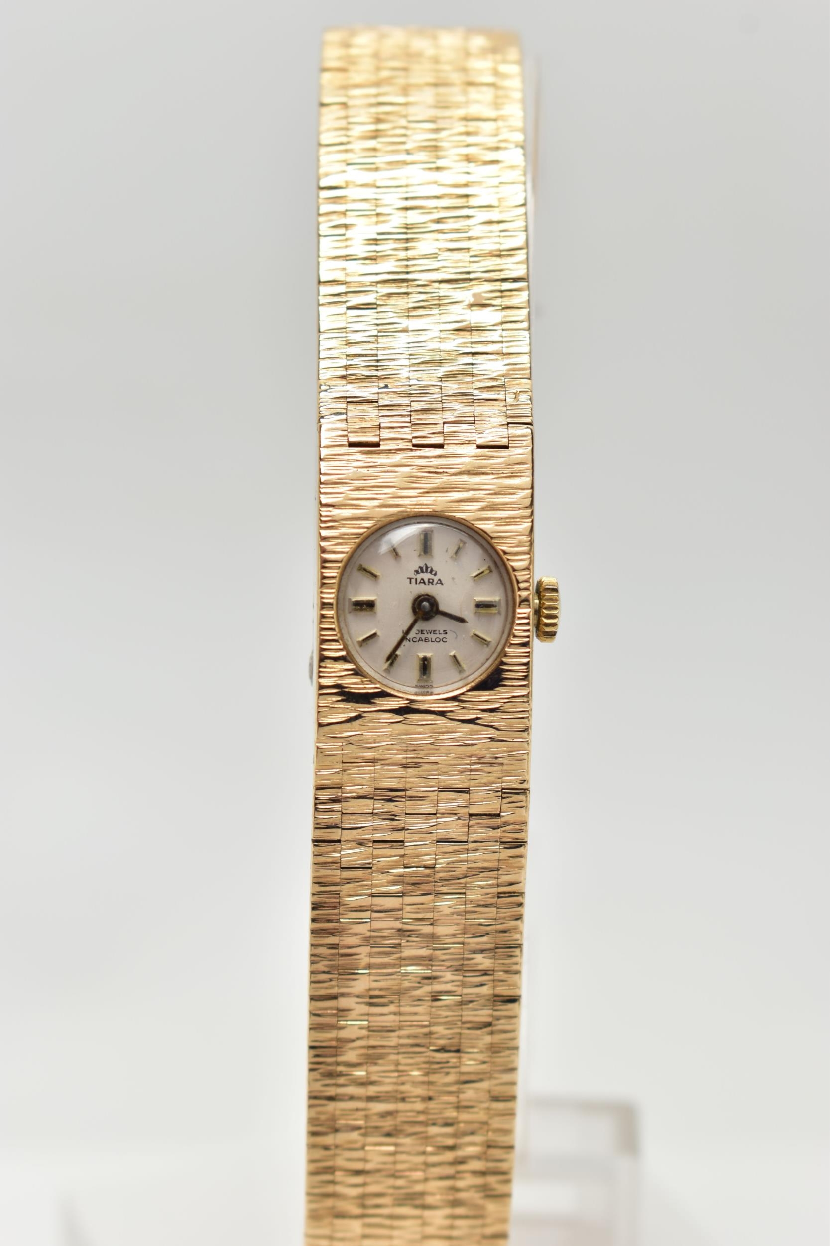 A LADY'S 9CT GOLD 'TIARA' WRISTWATCH, manual wind, round silver dial signed 'Tiara, 17 jewels Incabloc', baton markers, black hands, within a bark effect case, polished case back, inside case back hallmarked 9ct London 1971, fitted with a bark effect articulated bracelet with folding clasp, hallmarked 9ct London 1972, length 165mm, approximate gross weight excluding movement 30.2 grams (condition report: watch winds, sets and runs at time of cataloguing, although time keeping is untested, general light wear, clasp in working condition)