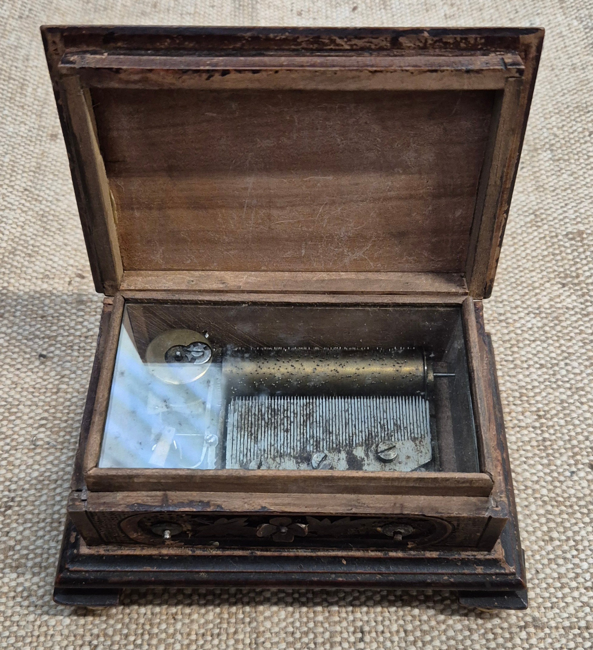 A vintage carved wood music box