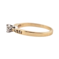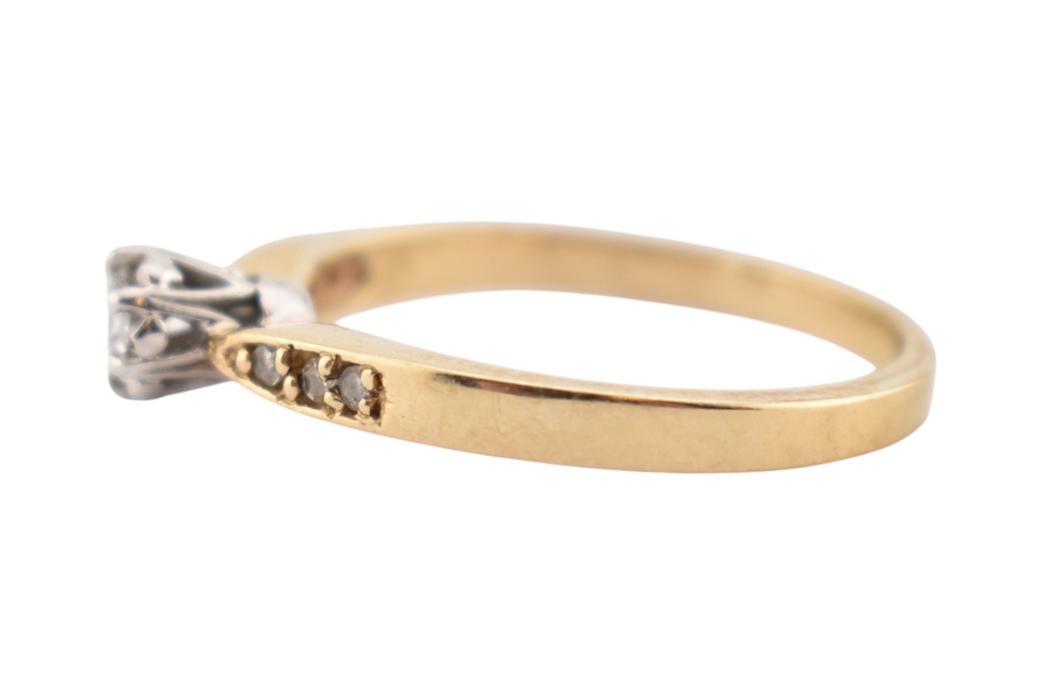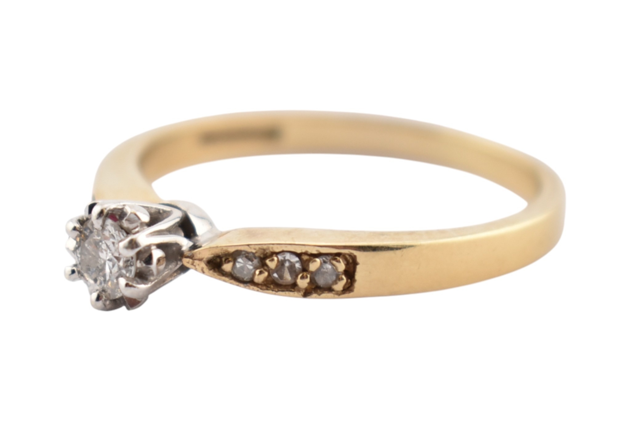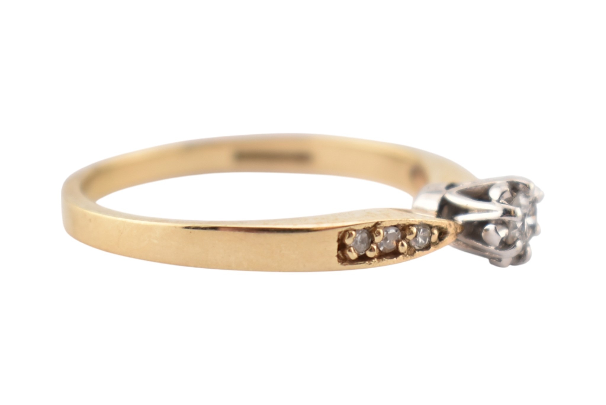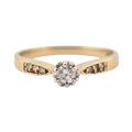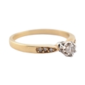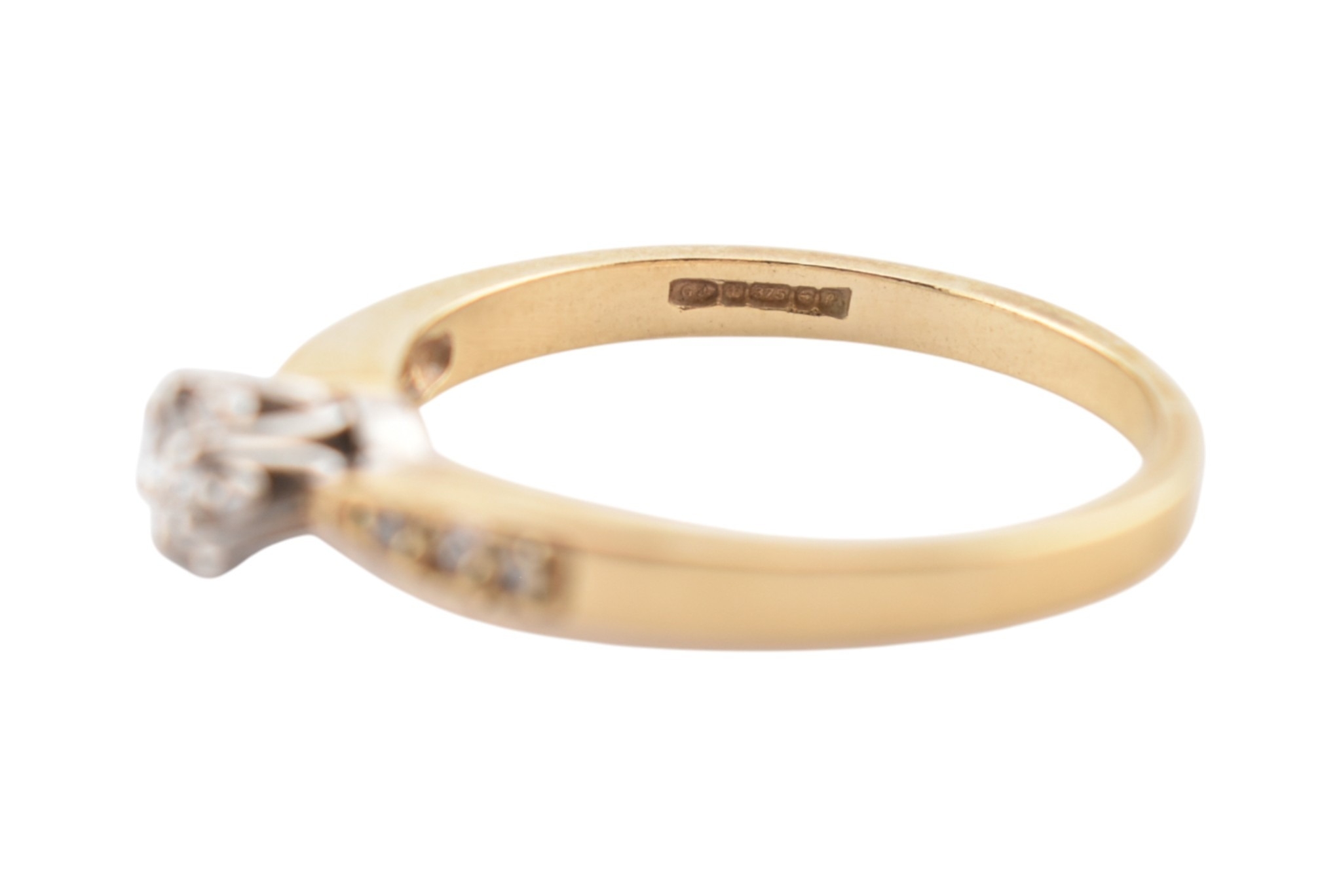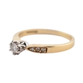A hallmarked 9ct gold and diamond solitaire ring. The ring having diamond set shoulders. Weight 2.7g. Size S